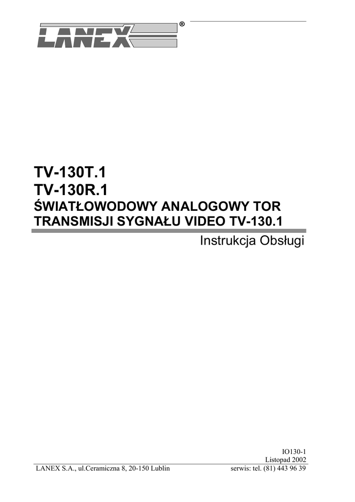 TV-130T.1 TV-130R.1 ŚWIATŁOWODOWY ANALOGOWY TOR TRANSMISJI SYGNAŁU VIDEO TV-130.1 Instrukcja Obsługi LANEX S.A., ul.Ceramiczna 8, 20-150 Lublin IO130-1 Listopad 2002 serwis: tel. (81) 443 96 39 ŚWIATŁOWODOWY ANALOGOWY TOR TRANSMISJI SYGNAŁU VIDEO TV-130 Instrukcja Obsługi Spis treści 1. WSTĘP ....................................................................................................................................................................... 3 2. DANE TECHNICZNE .............................................................................................................................................. 4 2.1. PARAMETRY ELEKTRYCZNE ....................................................................................................................................... 4 2.2. WYMIARY ZEWNĘTRZNE I MASA................................................................................................................................ 4 3. SPOSÓB EKSPLOATACJI...................................................................................................................................... 5 3.1. WYGODA I BEZPIECZEŃSTWO EKSPLOATACJI ............................................................................................................. 7 3.2. NIEZAWODNOŚĆ I TRWAŁOŚĆ .................................................................................................................................... 7 3.3. DOPUSZCZALNE NARAŻENIA ŚRODOWISKOWE ........................................................................................................... 8 3.3.1. Narażenia w czasie użytkowania .................................................................................................................. 8 3.3.2. Narażenia w czasie transportu ..................................................................................................................... 9 3.3.3. Narażenia w czasie magazynowania ............................................................................................................ 9 3.4. KOSZTY UŻYTKOWANIA ............................................................................................................................................ 9 3.5. KOMPATYBILNOŚĆ ELEKTROMAGNETYCZNA ............................................................................................................. 9 3.5.1. Poziom zakłóceń przewodzonych i promieniowanych. ................................................................................. 9 3.5.2. Odporność na wyładowania elektrostatyczne. ........................................................................................... 10 3.5.3. Odporność na zakłócenia BURST i SURGE............................................................................................... 10 3.5.4. Odporność na zapady i przerwy napięcia zasilającego.............................................................................. 10 3.6. PARAMETRY INTERFEJSU VIDEO .............................................................................................................................. 10 3.7. PARAMETRY ZBIORCZEGO OPTYCZNEGO SYGNAŁU LINIOWEGO. ............................................................................. 11 3.8. PARAMETRY ZASILANIA........................................................................................................................................... 11 IO130-1 1 Listopad 2002 ŚWIATŁOWODOWY ANALOGOWY TOR TRANSMISJI SYGNAŁU VIDEO TV-130 Instrukcja Obsługi Bezpieczeństwo użytkowania Światłowodowy analogowy tor transmisji sygnałów video został zaprojektowany i przetestowany, w zakresie bezpieczeństwa i użytkowania, zgodnie z normą PN-EN-60950. Spełnia wymogi bezpieczeństwa klasy I. ! W celu uniknięcia kontaktu z elementami będącymi pod napięciem, należy zawsze przed otwarciem obudowy zasilacza, odłączyć zasilanie. ! Promieniowanie emitowane przez nadajnik może być szkodliwe dla wzroku! Pod żadnym pozorem nie należy patrzeć w złącze optyczne nadajnika, do którego nie jest dołączone złącze światłowodowe. Nadajnik emituje moc zawsze, gdy tylko urządzenie jest włączone do zasilania – niezależnie od tego czy do wejścia elektrycznego doprowadzony jest jakikolwiek sygnał, czy też nie. ! Urządzenie nie posiada wmontowanego układu rozłączającego. Układ taki powinien znajdować się na zewnątrz urządzenia. UWAGA! Korpusy urządzeń połączone są z ujemnym biegunem zasilania ! Producent nie odpowiada za stosowanie urządzenia niezgodnie z instrukcją obsługi. Instrukcja obsługi jest integralną częścią urządzenia i wraz z nim jest przekazywana użytkownikom. IO130-1 2 Listopad 2002 ŚWIATŁOWODOWY ANALOGOWY TOR TRANSMISJI SYGNAŁU VIDEO TV-130 Instrukcja Obsługi 1. Wstęp Urządzenie jest kompletem składającym się z nadajnika i odbiornika. Nadajnik i odbiornik są światłowodowymi analogowymi konwertorami video do jednokierunkowej transmisji sygnałów video kolorowych (PAL) i monochromatycznych na odległość do 5 km przy użyciu światłowodu wielomodowego. Transmisja odbywa się z wykorzystaniem bezpośredniej modulacji wielkości strumienia światła o długości fali 850nm. Urządzenie przeznaczone jest do zastosowania w małych lokalnych sieciach światłowodowych łączących bezpośrednio kamerę przemysłową będącą źródłem sygnału video z monitorem kontrolującym obraz z kamery. Głównym obszarem zastosowań są systemy: a) b) c) d) e) f) telewizji przemysłowej obserwacyjne medyczne obserwacyjne naukowe video konferencje ochrony obiektów na zewnątrz i wewnątrz nadzoru transportu IO130-1 Rysunek 1. Nadajnik TV-130T. Rysunek 2. Odbiornik TV-130R. 3 Listopad 2002 ŚWIATŁOWODOWY ANALOGOWY TOR TRANSMISJI SYGNAŁU VIDEO TV-130 Instrukcja Obsługi 2. Dane techniczne 2.1. Parametry elektryczne Tabela 1. Parametry. Zgodność ze standardem Amplituda sygnału wejściowego Impedancja wejściowa Szer