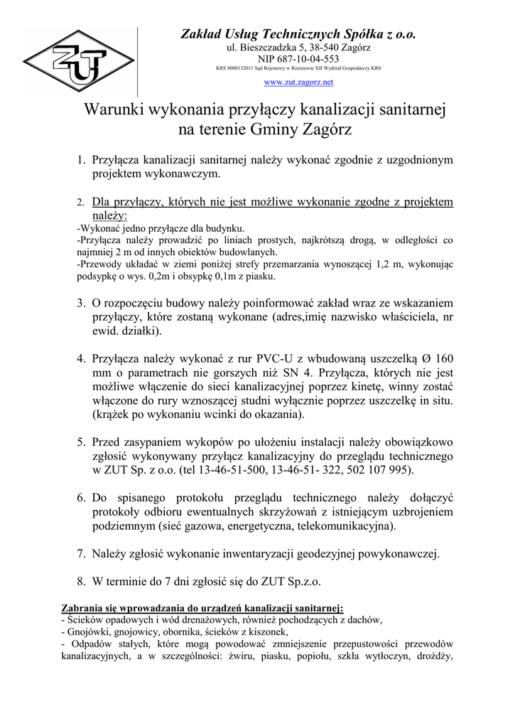 Zakład Usług Technicznych Spółka z o.o. ul. Bieszczadzka 5, 38-540 Zagórz NIP 687-10-04-553 KRS 0000132011 Sąd Rejonowy w Rzeszowie XII Wydział Gospodarczy KRS www.zut.zagorz.net Warunki wykonania przyłączy kanalizacji sanitarnej na terenie Gminy Zagórz 1. Przyłącza kanalizacji sanitarnej należy wykonać zgodnie z uzgodnionym projektem wykonawczym. 2. Dla przyłączy, których nie jest możliwe wykonanie zgodne z projektem należy: -Wykonać jedno przyłącze dla budynku. -Przyłącza należy prowadzić po liniach prostych, najkrótszą drogą, w odległości co najmniej 2 m od innych obiektów budowlanych. -Przewody układać w ziemi poniżej strefy przemarzania wynoszącej 1,2 m, wykonując podsypkę o wys. 0,2m i obsypkę 0,1m z piasku. 3. O rozpoczęciu budowy należy poinformować zakład wraz ze wskazaniem przyłączy, które zostaną wykonane (adres,imię nazwisko właściciela, nr ewid. działki). 4. Przyłącza należy wykonać z rur PVC-U z wbudowaną uszczelką Ø 160 mm o parametrach nie gorszych niż SN 4. Przyłącza, których nie jest możliwe włączenie do sieci kanalizacyjnej poprzez kinetę, winny zostać włączone do rury wznoszącej studni wyłącznie poprzez uszczelkę in situ. (krążek po wykonaniu wcinki do okazania). 5. Przed zasypaniem wykopów po ułożeniu instalacji należy obowiązkowo zgłosić wykonywany przyłącz kanalizacyjny do przeglądu technicznego w ZUT Sp. z o.o. (tel 13-46-51-500, 13-46-51- 322, 502 107 995). 6. Do spisanego protokołu przeglądu technicznego należy dołączyć protokoły odbioru ewentualnych skrzyżowań z istniejącym uzbrojeniem podziemnym (sieć gazowa, energetyczna, telekomunikacyjna). 7. Należy zgłosić wykonanie inwentaryzacji geodezyjnej powykonawczej. 8. W terminie do 7 dni zgłosić się do ZUT Sp.z.o. Zabrania się wprowadzania do urządzeń kanalizacji sanitarnej: - Ścieków opadowych i wód drenażowych, również pochodzących z dachów, - Gnojówki, gnojowicy, obornika, ścieków z kiszonek, - Odpadów stałych, które mogą powodować zmniejszenie przepustowości przewodów kanalizacyjnych, a w szczególności: żwiru, piasku, popiołu, szkła wytłoczyn, drożdży, szczeciny, ścinków skór, tekstyliów, włókien, nawet jeżeli znajdują się one w stanie rozdrobnionym.
