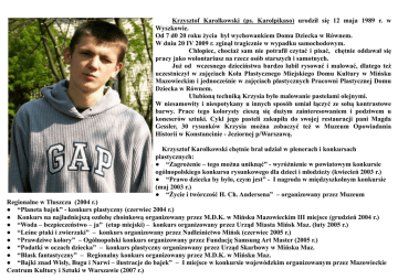 Krzysztof Karolkowski (ps. Karolpikaso) urodził się 12 maja 1989 r. w Wyszkowie. Od 7 d0 20 roku życia był wychowankiem Domu Dziecka w Równem. W dniu 20 IV 2009 r. zginął tragicznie w wypadku samochodowym. Chłopiec, chociaż sam nie potrafił czytać i pisać, chętnie oddawał się pracy jako wolontariusz na rzecz osób starszych i samotnych. Już od wczesnego dzieciństwa bardzo lubił rysować i malować, dlatego też uczestniczył w zajęciach Koła Plastycznego Miejskiego Domu Kultury w Mińsku Mazowieckim i jednocześnie w zajęciach plastycznych Pracowni Plastycznej Domu Dziecka w Równem. Ulubioną techniką Krzysia było malowanie pastelami olejnymi. W niesamowity i niespotykany u innych sposób umiał łączyć ze sobą kontrastowe barwy. Prace tego kolorysty cieszą się dużym zainteresowaniem i podziwem u koneserów sztuki. Cykl jego pasteli zakupiła do swojej restauracji pani Magda Gessler, 30 rysunków Krzysia można zobaczyć też w Muzeum Opowiadania Historii w Konstancinie - Jeziornej p/Warszawą. Krzysztof Karolkowski chętnie brał udział w plenerach i konkursach plastycznych: ● “Zagrożenie – tego można uniknąć” - wyróżnienie w powiatowym konkursie ogólnopolskiego konkursu rysunkowego dla dzieci i młodzieży (kwiecień 2003 r.) ● “Prawo dziecka by było, czym jest” - I nagroda w międzyszkolnym konkursie (maj 2003 r.) ● “Życie i twórczość H. Ch. Andersena” – organizowany przez Muzeum Regionalne w Tłuszczu (2004 r.) ● “Planeta bajek” - konkurs plastyczny (czerwiec 2004 r.) ● Konkurs na najładniejszą ozdobę choinkową organizowany przez M.D.K. w Mińsku Mazowieckim III miejsce (grudzień 2004 r.) ● “Woda – bezpieczeństwo – ja” (etap miejski) – konkurs organizowany przez Urząd Miasta Mińsk Maz. (luty 2005 r.) ● “Leśne ptaki i zwierzaki” – konkurs organizowany przez Nadleśnictwo Mińsk (czerwiec 2005 r.) ● “Prawdziwe kolory” – Ogólnopolski konkurs organizowany przez Fundację Samsung Art Master (2005 r.) ● “Podatki w oczach dziecka” – konkurs plastyczny organizowany przez Urząd Skarbowy w Mińsku Maz. ● “Blask fantastyczny” – Regionalny konkurs organizowany przez M.D.K. w Mińsku Maz. ● “Bajki znad Wisły, Bugu i Narwi – ilustracje do bajek” – I miejsce w konkursie wojewódzkim organizowanym przez Mazowieckie Centrum Kultury i Sztuki w Warszawie (2007 r.)