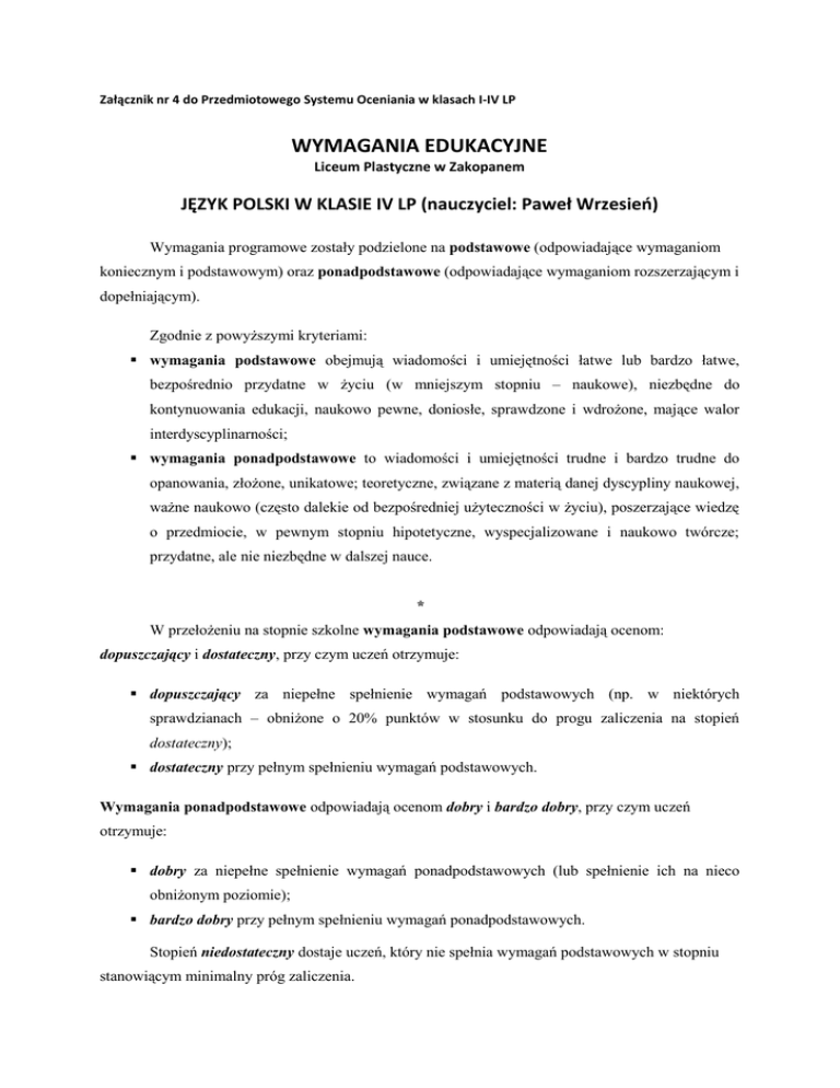 Załącznik nr 4 do Przedmiotowego Systemu Oceniania w klasach I-IV LP WYMAGANIA EDUKACYJNE Liceum Plastyczne w Zakopanem JĘZYK POLSKI W KLASIE IV LP (nauczyciel: Paweł Wrzesień) Wymagania programowe zostały podzielone na podstawowe (odpowiadające wymaganiom koniecznym i podstawowym) oraz ponadpodstawowe (odpowiadające wymaganiom rozszerzającym i dopełniającym). Zgodnie z powyższymi kryteriami: wymagania podstawowe obejmują wiadomości i umiejętności łatwe lub bardzo łatwe, bezpośrednio przydatne w życiu (w mniejszym stopniu – naukowe), niezbędne do kontynuowania edukacji, naukowo pewne, doniosłe, sprawdzone i wdrożone, mające walor interdyscyplinarności; wymagania ponadpodstawowe to wiadomości i umiejętności trudne i bardzo trudne do opanowania, złożone, unikatowe; teoretyczne, związane z materią danej dyscypliny naukowej, ważne naukowo (często dalekie od bezpośredniej użyteczności w życiu), poszerzające wiedzę o przedmiocie, w pewnym stopniu hipotetyczne, wyspecjalizowane i naukowo twórcze; przydatne, ale nie niezbędne w dalszej nauce. * W przełożeniu na stopnie szkolne wymagania podstawowe odpowiadają ocenom: dopuszczający i dostateczny, przy czym uczeń otrzymuje: dopuszczający za niepełne spełnienie wymagań podstawowych (np. w niektórych sprawdzianach – obniżone o 20% punktów w stosunku do progu zaliczenia na stopień dostateczny); dostateczny przy pełnym spełnieniu wymagań podstawowych. Wymagania ponadpodstawowe odpowiadają ocenom dobry i bardzo dobry, przy czym uczeń otrzymuje: dobry za niepełne spełnienie wymagań ponadpodstawowych (lub spełnienie ich na nieco obniżonym poziomie); bardzo dobry przy pełnym spełnieniu wymagań ponadpodstawowych. Stopień niedostateczny dostaje uczeń, który nie spełnia wymagań podstawowych w stopniu stanowiącym minimalny próg zaliczenia. Stopień celujący otrzymuje uczeń spełniający wymagania podstawowe i ponadpodstawowe, a także mający wyższe, ponadprogramowe umiejętności lub wiadomości. Wymagania mają charakter hierarchiczny i kumulatywny. Spełnienie wymagań ponadpodstawowych zakłada uprzednie spełnienie wymagań podstawowych. Uczeń kwalifikujący się do oceny dobry lub bardzo dobry musi spełniać całkowicie wymagania podstawowe, a także ponadpodstawowe w stopniu pełnym (bardzo dobry) lub niepełnym (dobry). Podobnie uczeń otrzymujący ocenę celujący – spełniać musi całkowicie wymagania podstawowe i ponadpodstawowe oraz poza nie wykraczać. Szczegółowe kryteria oceniania dłuższej pracy pisemnej Wymagania mają charakter kumulatywny, uczeń, który nie spełnia kryteriów na ocenę niższą (np. dostateczny: „prawidłowy dobór materiału literackiego”), nie może uzyskać oceny wyższej (np. dobry: „właściwy komentarz”, jeśli np. komentarz jest właściwy, ale odnosi się do bezzasadnie wskazanych utworów literackich). Waga poszczególnych poziomów pracy w klasie IV LP: Poziom merytoryczny strukturalny językowy (język i styl) 30% 30% 40% Poziom Ocena merytoryczny celujący strukturalny językowy (język i styl) – oryginalne, ciekawe – zachowanie konwencji – styl jasny, swobodny, i samodzielne ujęcie tematu gatunkowej wybranej formy barwny, o cechach – materiał literacki wykracza pracy indywidualnych poza treści programowe – oryginalna kompozycja – duża sprawność językowa – wnikliwa, pogłębiona (funkcjonalna wobec tematu) – bogate słownictwo interpretacja utworów – umiejętne wplatanie cytatów – język całkowicie poprawny literackich – praca napisana estetycznie, – sprawne, funkcjonalne – całkowita poprawność czytelne akapity – posługiwanie się interpunkcją merytoryczna funkcjonalne wobec – samodzielność myślenia, kompozycji poprawność i spójność argumentacji – znajomość różnorodnych kontekstów – widoczna umiejętność świadomego wyboru, selekcjonowania, przetwarzania i syntezowania wiedzy – erudycyjność wywodu bardzo dobry – trafne, oryginalne ujęcie – przemyślana, oryginalna – styl jasny, swobodny, tematu kompozycja funkcjonalny wobec wybranej – materiał literacki dobrany – forma pracy funkcjonalna formy pracy trafnie, celowo, wobec tematu – duża sprawność językowo- zinterpretowany w pogłębiony – spójność logicznego -stylistyczna sposób wywodu – bogate, zróżnicowane – całkowita poprawność – przejrzystość dowodzenia słownictwo merytoryczna – umiejętne wykorzystanie – poprawna, urozmaicona – wykazanie się znajomością cytatów składnia kontekstów kulturowych – praca napisana estetycznie, – praca poprawna pod i filozoficznych, umiejętność czytelne akapity – względem językowym wykorzystania ich funkcjonalne wobec (dopuszczalne niewielkie, w interpretacji utworów kompozycji sporadyczne usterki) – temat w pełni zrealizowany – widoczny zamysł – styl poprawny, widoczna – właściwy dobór materiału kompozycyjny (przemyślana sprawność stylistyczno- literackiego i kulturowego kompozycja), -językowa opatrzonego właściwym – właściwe proporcje między – styl adekwatny do komentarzem poszczególnymi częściami zamierzonej formy pracy – praca w pełni poprawna pracy – widoczna umiejętność merytorycznie – zachowanie ciągłości posługiwania się oficjalną – sądy formułowane i przejrzystości logicznego odmianą polszczyzny z odwoływaniem się do wywodu – dość zróżnicowane tekstów – wplatanie cytatów słownictwo – samodzielność i dojrzałość sądów – posługiwanie się terminologią – dokonywanie zestawień i porównań, syntezowanie wiadomości, wyciąganie wniosków dobry – widoczna umiejętność – umiejętność posługiwania interpretowania utworów się zróżnicowanymi literackich i innych tekstów strukturami składniowymi kultury z na ogół właściwie stosowaną – ujęcie tematu poprawne, interpunkcją zachowanie spójności – dopusz