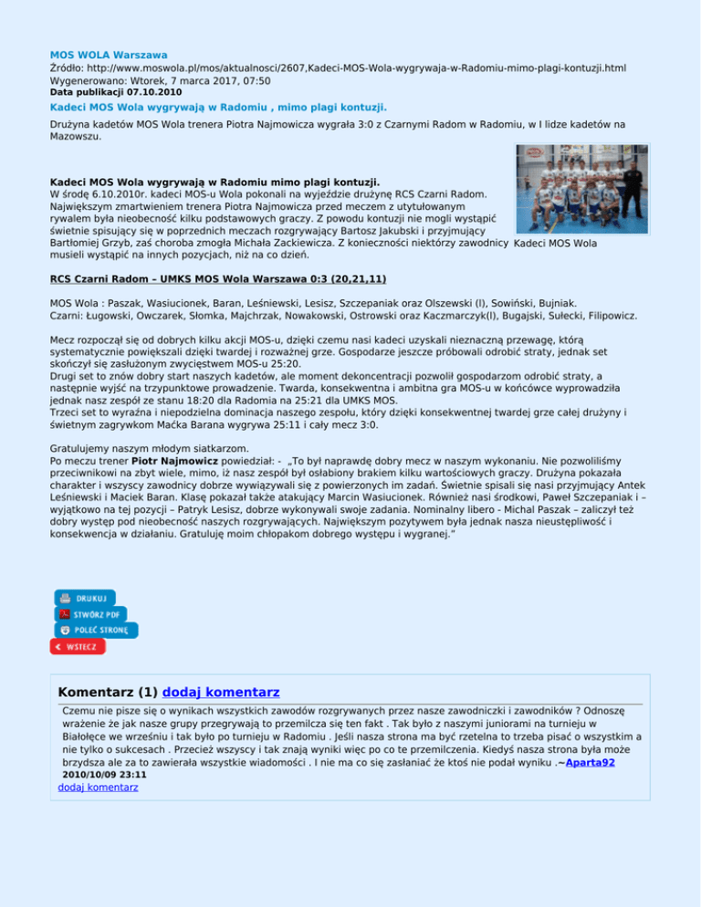 MOS WOLA Warszawa Źródło: http://www.moswola.pl/mos/aktualnosci/2607,Kadeci-MOS-Wola-wygrywaja-w-Radomiu-mimo-plagi-kontuzji.html Wygenerowano: Wtorek, 7 marca 2017, 07:50 Data publikacji 07.10.2010 Kadeci MOS Wola wygrywają w Radomiu , mimo plagi kontuzji. Drużyna kadetów MOS Wola trenera Piotra Najmowicza wygrała 3:0 z Czarnymi Radom w Radomiu, w I lidze kadetów na Mazowszu. Kadeci MOS Wola wygrywają w Radomiu mimo plagi kontuzji. W środę 6.10.2010r. kadeci MOS-u Wola pokonali na wyjeździe drużynę RCS Czarni Radom. Największym zmartwieniem trenera Piotra Najmowicza przed meczem z utytułowanym rywalem była nieobecność kilku podstawowych graczy. Z powodu kontuzji nie mogli wystąpić świetnie spisujący się w poprzednich meczach rozgrywający Bartosz Jakubski i przyjmujący Bartłomiej Grzyb, zaś choroba zmogła Michała Zackiewicza. Z konieczności niektórzy zawodnicy Kadeci MOS Wola musieli wystąpić na innych pozycjach, niż na co dzień. RCS Czarni Radom – UMKS MOS Wola Warszawa 0:3 (20,21,11) MOS Wola : Paszak, Wasiucionek, Baran, Leśniewski, Lesisz, Szczepaniak oraz Olszewski (l), Sowiński, Bujniak. Czarni: Ługowski, Owczarek, Słomka, Majchrzak, Nowakowski, Ostrowski oraz Kaczmarczyk(l), Bugajski, Sułecki, Filipowicz. Mecz rozpoczął się od dobrych kilku akcji MOS-u, dzięki czemu nasi kadeci uzyskali nieznaczną przewagę, którą systematycznie powiększali dzięki twardej i rozważnej grze. Gospodarze jeszcze próbowali odrobić straty, jednak set skończył się zasłużonym zwycięstwem MOS-u 25:20. Drugi set to znów dobry start naszych kadetów, ale moment dekoncentracji pozwolił gospodarzom odrobić straty, a następnie wyjść na trzypunktowe prowadzenie. Twarda, konsekwentna i ambitna gra MOS-u w końcówce wyprowadziła jednak nasz zespół ze stanu 18:20 dla Radomia na 25:21 dla UMKS MOS. Trzeci set to wyraźna i niepodzielna dominacja naszego zespołu, który dzięki konsekwentnej twardej grze całej drużyny i świetnym zagrywkom Maćka Barana wygrywa 25:11 i cały mecz 3:0. Gratulujemy naszym młodym siatkarzom. Po meczu trener Piotr Najmowicz powiedział: - „To był naprawdę dobry mecz w naszym wykonaniu. Nie pozwoliliśmy przeciwnikowi na zbyt wiele, mimo, iż nasz zespół był osłabiony brakiem kilku wartościowych graczy. Drużyna pokazała charakter i wszyscy zawodnicy dobrze wywiązywali się z powierzonych im zadań. Świetnie spisali się nasi przyjmujący Antek Leśniewski i Maciek Baran. Klasę pokazał także atakujący Marcin Wasiucionek. Również nasi środkowi, Paweł Szczepaniak i – wyjątkowo na tej pozycji – Patryk Lesisz, dobrze wykonywali swoje zadania. Nominalny libero - Michal Paszak – zaliczył też dobry występ pod nieobecność naszych rozgrywających. Największym pozytywem była jednak nasza nieustępliwość i konsekwencja w działaniu. Gratuluję moim chłopakom dobrego występu i wygranej.” Komentarz (1) dodaj komentarz Czemu nie pisze się o wynikach wszystkich zawodów rozgrywanych przez nasze zawodniczki i zawodników ? Odnoszę wrażenie że jak nasze grupy przegrywają to przemilcza się ten fakt . Tak było z naszymi juniorami na turnieju w Białołęce we wrześniu i tak było po turnieju w Radomiu . Jeśli nasza strona ma być rzetelna to trzeba pisać o wszystkim a nie tylko o sukcesach . Przecież wszyscy i tak znają wyniki więc po co te przemilczenia. Kiedyś nasza strona była może brzydsza ale za to zawierała wszystkie wiadomości . I nie ma co się zasłaniać że ktoś nie podał wyniku .~Aparta92 2010/10/09 23:11 dodaj komentarz