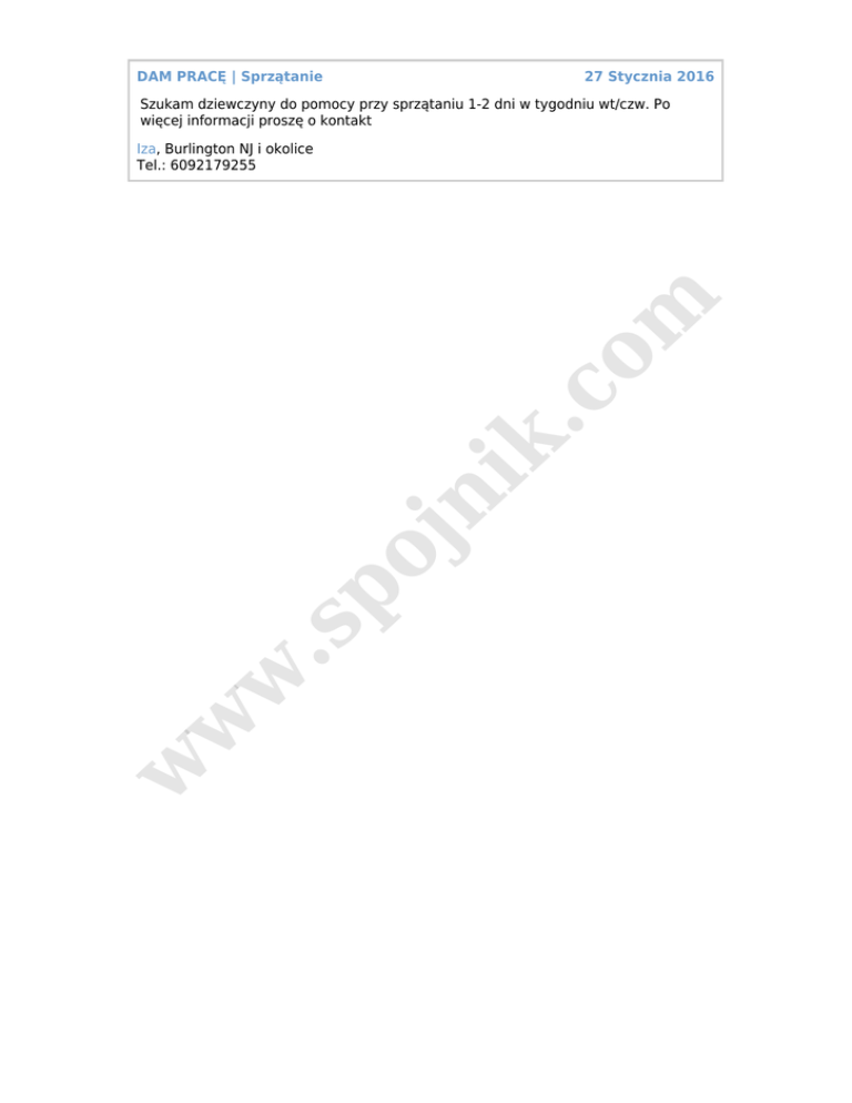 DAM PRACĘ | Sprzątanie 27 Stycznia 2016 Szukam dziewczyny do pomocy przy sprzątaniu 1-2 dni w tygodniu wt/czw. Po więcej informacji proszę o kontakt w w w .s po jn ik .c o m Iza, Burlington NJ i okolice Tel.: 6092179255