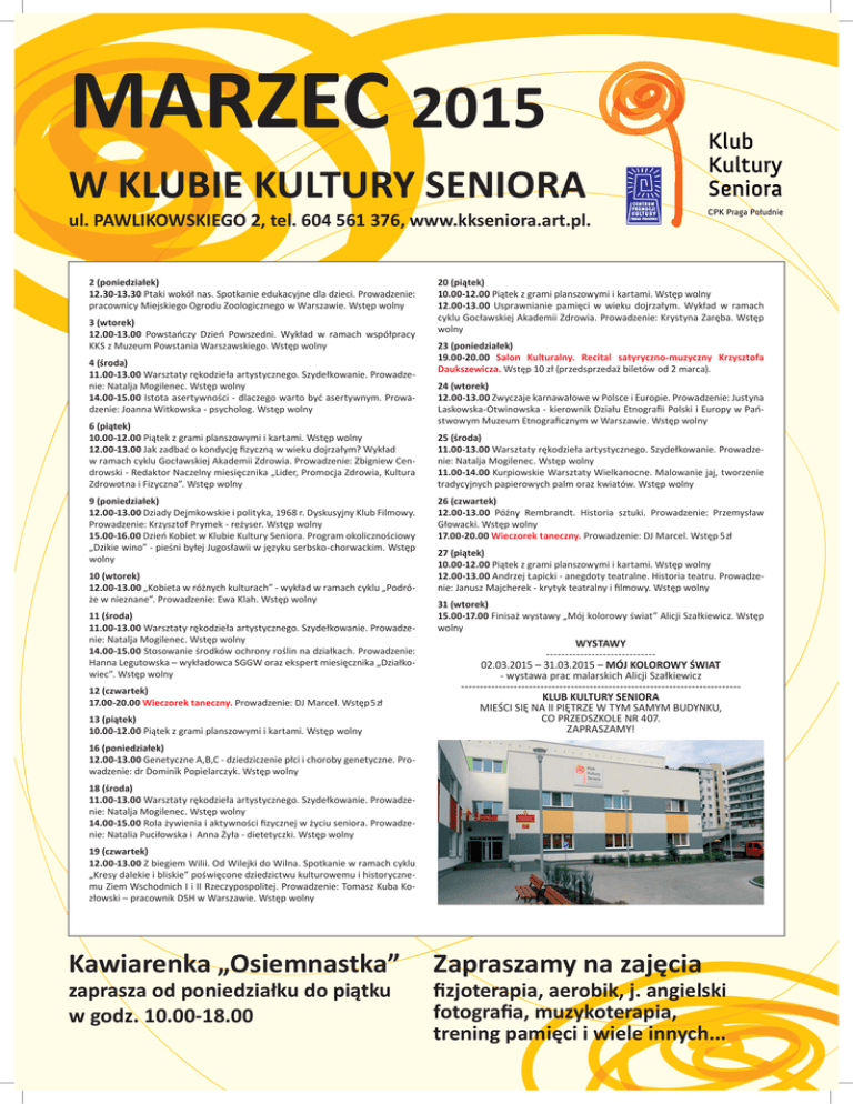 MARZEC 2015 W KLUBIE KULTURY SENIORA ul. PAWLIKOWSKIEGO 2, tel. 604 561 376, www.kkseniora.art.pl. 2 (poniedziałek) 12.30-13.30 Ptaki wokół nas. Spotkanie edukacyjne dla dzieci. Prowadzenie: pracownicy Miejskiego Ogrodu Zoologicznego w Warszawie. Wstęp wolny 3 (wtorek) 12.00-13.00 Powstańczy Dzień Powszedni. Wykład w ramach współpracy KKS z Muzeum Powstania Warszawskiego. Wstęp wolny 4 (środa) 11.00-13.00 Warsztaty rękodzieła artystycznego. Szydełkowanie. Prowadzenie: Natalja Mogilenec. Wstęp wolny 14.00-15.00 Istota asertywności - dlaczego warto być asertywnym. Prowadzenie: Joanna Witkowska - psycholog. Wstęp wolny 6 (piątek) 10.00-12.00 Piątek z grami planszowymi i kartami. Wstęp wolny 12.00-13.00 Jak zadbać o kondycję fizyczną w wieku dojrzałym? Wykład w ramach cyklu Gocławskiej Akademii Zdrowia. Prowadzenie: Zbigniew Cendrowski - Redaktor Naczelny miesięcznika „Lider, Promocja Zdrowia, Kultura Zdrowotna i Fizyczna”. Wstęp wolny 9 (poniedziałek) 12.00-13.00 Dziady Dejmkowskie i polityka, 1968 r. Dyskusyjny Klub Filmowy. Prowadzenie: Krzysztof Prymek - reżyser. Wstęp wolny 15.00-16.00 Dzień Kobiet w Klubie Kultury Seniora. Program okolicznościowy „Dzikie wino” - pieśni byłej Jugosławii w języku serbsko-chorwackim. Wstęp wolny 10 (wtorek) 12.00-13.00 „Kobieta w różnych kulturach” - wykład w ramach cyklu „Podróże w nieznane”. Prowadzenie: Ewa Klah. Wstęp wolny 11 (środa) 11.00-13.00 Warsztaty rękodzieła artystycznego. Szydełkowanie. Prowadzenie: Natalja Mogilenec. Wstęp wolny 14.00-15.00 Stosowanie środków ochrony roślin na działkach. Prowadzenie: Hanna Legutowska – wykładowca SGGW oraz ekspert miesięcznika „Działkowiec”. Wstęp wolny 12 (czwartek) 17.00-20.00 Wieczorek taneczny. Prowadzenie: DJ Marcel. Wstęp 5 zł 13 (piątek) 10.00-12.00 Piątek z grami planszowymi i kartami. Wstęp wolny 20 (piątek) 10.00-12.00 Piątek z grami planszowymi i kartami. Wstęp wolny 12.00-13.00 Usprawnianie pamięci w wieku dojrzałym. Wykład w ramach cyklu Gocławskiej Akademii Zdrowia. Prowadzenie: Krystyna Zaręba. Wstęp wolny 23 (poniedziałek) 19.00-20.00 Salon Kulturalny. Recital satyryczno-muzyczny Krzysztofa Daukszewicza. Wstęp 10 zł (przedsprzedaż biletów od 2 marca). 24 (wtorek) 12.00-13.00 Zwyczaje karnawałowe w Polsce i Europie. Prowadzenie: Justyna Laskowska-Otwinowska - kierownik Działu Etnografii Polski i Europy w Państwowym Muzeum Etnograficznym w Warszawie. Wstęp wolny 25 (środa) 11.00-13.00 Warsztaty rękodzieła artystycznego. Szydełkowanie. Prowadzenie: Natalja Mogilenec. Wstęp wolny 11.00-14.00 Kurpiowskie Warsztaty Wielkanocne. Malowanie jaj, tworzenie tradycyjnych papierowych palm oraz kwiatów. Wstęp wolny 26 (czwartek) 12.00-13.00 Późny Rembrandt. Historia sztuki. Prowadzenie: Przemysław Głowacki. Wstęp wolny 17.00-20.00 Wieczorek taneczny. Prowadzenie: DJ Marcel. Wstęp 5 zł 27 (piątek) 10.00-12.00 Piątek z grami planszowymi i kartami. Wstęp wolny 12.00-13.00 Andrzej Łapicki - anegdoty teatralne. Historia teatru. Prowadzenie: Janusz Majcherek - krytyk teatralny i filmowy. Wstęp wolny 31 (wtorek) 15.00-17.00 Finisaż wystawy „Mój kolorowy świat” Alicji Szałkiewicz. Wstęp wolny WYSTAWY ----------------------------02.03.2015 – 31.03.2015 – MÓJ KOLOROWY ŚWIAT - wystawa prac malarskich Alicji Szałkiewicz -------------------------------------------------------------------------KLUB KULTURY SENIORA MIEŚCI SIĘ NA II PIĘTRZE W TYM SAMYM BUDYNKU, CO PRZEDSZKOLE NR 407. ZAPRASZAMY! 16 (poniedziałek) 12.00-13.00 Genetyczne A,B,C - dziedziczenie płci i choroby genetyczne. Prowadzenie: dr Dominik Popielarczyk. Wstęp wolny 18 (środa) 11.00-13.00 Warsztaty rękodzieła artystycznego. Szydełkowanie. Prowadzenie: Natalja Mogilenec. Wstęp wolny 14.00-15.00 Rola żywienia i aktywności fizycznej w życiu seniora. Prowadzenie: Natalia Puciłowska i Anna Żyła - dietetyczki. Wstęp wolny 19 (czwartek) 12.00-13.00 Z biegiem Wilii. Od Wilejki do Wilna. Spotkanie w ramach cyklu „Kresy dalekie i bliskie” poświęcone dziedzictwu kulturowemu i historycznemu Ziem Wschodnich I i II Rzeczypospolitej. Prowadzenie: Tomasz Kuba Kozłowski – pracownik DSH w Warszawie. Wstęp wolny Kawiarenka „Osiemnastka” Zapraszamy na zajęcia zaprasza od poniedziałku do piątku w godz. 10.00-18.00 fizjoterapia, aerobik, j. angielski fotografia, muzykoterapia, trening pamięci i wiele innych...