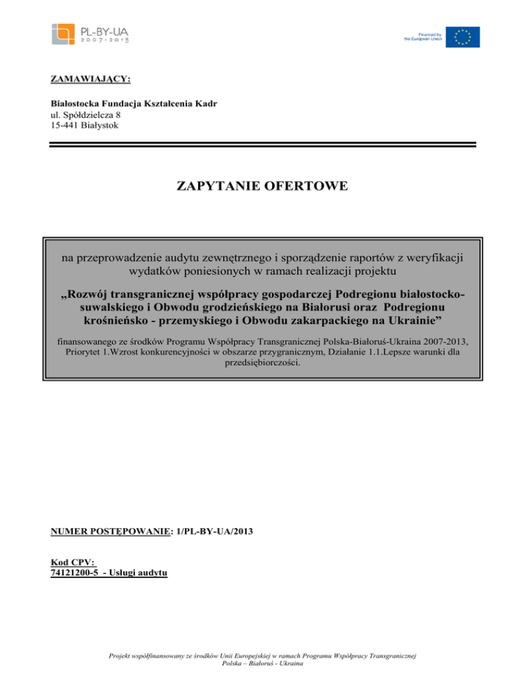 ZAMAWIAJĄCY: Białostocka Fundacja Kształcenia Kadr ul. Spółdzielcza 8 15-441 Białystok ZAPYTANIE OFERTOWE na przeprowadzenie audytu zewnętrznego i sporządzenie raportów z weryfikacji wydatków poniesionych w ramach realizacji projektu „Rozwój transgranicznej współpracy gospodarczej Podregionu białostockosuwalskiego i Obwodu grodzieńskiego na Białorusi oraz Podregionu krośnieńsko - przemyskiego i Obwodu zakarpackiego na Ukrainie” finansowanego ze środków Programu Współpracy Transgranicznej Polska-Białoruś-Ukraina 2007-2013, Priorytet 1.Wzrost konkurencyjności w obszarze przygranicznym, Działanie 1.1.Lepsze warunki dla przedsiębiorczości. NUMER POSTĘPOWANIE: 1/PL-BY-UA/2013 Kod CPV: 74121200-5 - Usługi audytu Projekt współfinansowany ze środków Unii Europejskiej w ramach Programu Współpracy Transgranicznej Polska – Białoruś - Ukraina Białostocka Fundacja Kształcenia Kadr (Zamawiający) zaprasza do składania oferty na przeprowadzenie audytu zewnętrznego i sporządzenie raportów z weryfikacji wydatków poniesionych w ramach realizacji projektu p.n. „Rozwój transgranicznej współpracy gospodarczej Podregionu białostocko-suwalskiego i Obwodu grodzieńskiego na Białorusi oraz Podregionu krośnieńsko - przemyskiego i Obwodu zakarpackiego na Ukrainie” finansowanego ze środków Programu Współpracy Transgranicznej Polska-Białoruś-Ukraina 2007-2013, w ramach Priorytetu 1.Wzrost konkurencyjności w obszarze przygranicznym, Działania 1.1.Lepsze warunki dla przedsiębiorczości. Szczegółowy opis Programu dostępny jest na stronie internetowej www.pl-by-ua.eu/pl. Planowany okres realizacji projektu: 01.11.2013-30.04.2015. Wartość projektu to 157.426,40 EUR, w tym 141.683,76 EUR dofinansowania ze środków UE. Projekt przewiduje wydatkowanie środków zarówno po stronie Wnioskodawcy (118.600,40 EUR) jak i partnerów: ukraińskiego (21.447,00 EUR) oraz białoruskiego (17.379,00 EUR). Celem projektu jest poprawa współpracy jednostek samorządu terytorialnego (JST) oraz przedsiębiorców z sektora MŚP z obszaru 4 regionów objętych projektem przyczyniająca się do rozwoju społeczno-gospodarczego Podregionu białostocko-suwalskiego i Podregionu krośnieńsko-przemyskiego w Polsce, obwodu zakarpackiego na Ukrainie oraz obwodu grodzieńskiego na Białorusi. Projekt przewiduje realizację następujących działań: promocja i informacja (ogłoszenia, artykuły sponsorowane, foldery informacyjno-promocyjne, stworzenie i utrzymanie portalu internetowego), badania (ankiety, raporty), modele współpracy transgranicznej, konferencje połączone z targami (2 konferencje Wnioskodawcy, 1 konferencja partnera ukraińskiego, 1 konferencja partnera białoruskiego) oraz wyjazdy studyjne do Wnioskodawcy oraz partnera ukraińskiego i białoruskiego. Szczegóły zamówienia: Audyt obejmuje analizę dokumentacji oraz stosowanych procedur kontroli wewnętrznej w odniesieniu do przekazywania i rozliczania otrzymanych środków, procedur akceptacji wydatków kwalifikowalnych w zakresie ich zasadności i odpowiedniego udokumentowania oraz sprawozdania realizacji projektu ze szczególnym uwzględnieniem realizacji przyjętych celów projektu i realizacji postanowień umowy grantowej. Zamówienie obejmuje wykonanie jednego audytu cząstkowego oraz jednego audytu końcowego w instytucjach: Białostocka Fundacja Kształcenia Kadr (Wnioskodawca) Fundacja Rozwoju Współpracy Transgranicznej – Ukraina (Partner 1) Uniwersytet Państwowy im. Janka Kupały w Grodnie – Białoruś (Partner 2) Każdy audyt zakończy się sporządzeniem 4 raportów (3 raporty cząstkowe oraz 1 raport skonsolidowany – łącznie 8 raportów) z weryfikacji wydatków w poszczególnych okresach raportowania w języku polskim i angielskim, według wzoru określonego przez Wspólną Instytucję Zarządzającą. Rozwinięcie szczegółowego opisu przedmiotu zamówienia wraz z wyszczególnieniem obowiązków audytora określonych Programem, jak również stawianych mu wymagań zawarte jest w dokumencie „Terms of Reference for an Expenditure Verification of a Grant Contract – external action of the european union” dostępnym na stronie http://www.pl-byua.eu/upload/pl/Annex%20VII%20expenditure%20verification.doc. Audyty cząstkowe będą przeprowadzane w okresie realizacji projektu zaś audyty końcowe zostaną przeprowadzone w terminie do 60 dni po zakończeniu projektu. Audytor musi zostać zaakceptowany przez Wspólny Sekretariat Techniczny Programu Współpracy Transgranicznej Polska-Białoruś-Ukraina 2007-2013. Warunkiem zawarcia umowy na realizację usługi audytu jest akceptacja audytora przez w/w Instytucję. 1. Projekt współfinansowany ze środków Unii Europejskiej w ramach Programu Współpracy Transgranicznej Polska – Białoruś - Ukraina Wymagania dotyczące Oferenta: 2. a) Oferent musi spełniać co najmniej jeden z następujących warunków: ● Audytor lub firma jest członkiem krajowego organu lub stowarzyszenia księgowych lub biegłych rewidentów, która z kolei należy do Międzynarodowej Federacji Księgowych (IFAC). ● Audytor lub firma jest członkiem krajowego organu bądź krajowej instytucji zrzeszających księgowych lub biegłych rewidentów. Pomimo że organizacja ta nie jest członkiem IFAC, Audytor zobowiązuje się do realizacji tego zlecenia zgodnie ze standardami IFAC i standardami etyki ustanowionymi w niniejszym ZWiO. ● Audytor lub firma są zarejestrowani jako biegli rewidenci w rejestrze publicznym organu nadzoru publicznego w kraju członkowskim UE zgodnie z zasadami nadzoru publicznego ustanowionymi w dyrektywie 2006/43/WE Parlamentu Europejskiego i Rady (mającej zastosowanie w odniesieniu do audytorów i firm audytorskich mających siedzibę w krajach członkowskich UE)1. ● Audytor lub firma są zarejestrowani jako biegli rewidenci w rejestrze publicznym organu nadzoru publicznego w kraju trzecim i rejestr ten podlega zasadom nadzoru