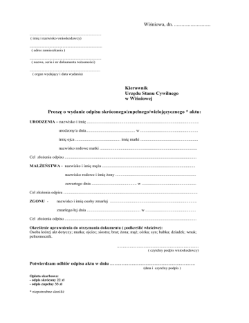 Wiśniowa, dn. ............................. ............................................................................ ( imię i nazwisko wnioskodawcy) ............................................................................. ( adres zamieszkania ) ............................................................................ ( nazwa, seria i nr dokumentu tożsamości) ........................................................................... ( organ wydający i data wydania) Kierownik Urzędu Stanu Cywilnego w Wiśniowej Proszę o wydanie odpisu skróconego/zupełnego/wielojęzycznego * aktu: URODZENIA – nazwisko i imię ........................................................................................................... urodzony/a dnia............................................... w ....................................................... imię ojca ........................................... imię matki ....................................................... nazwisko rodowe matki ............................................................................................. Cel złożenia odpisu .............................................................................................................................. MAŁŻEŃSTWA - nazwisko i imię męża ......................................................................................... nazwisko rodowe i imię żony ............................................................................. zawartego dnia ........................................... w .................................................... Cel złożenia odpisu ................................................................................................................................ ZGONU - nazwisko i imię osoby zmarłej ................................................................................... zmarłego/łej dnia ................................................... w ................................................ Cel złożenia odpisu .............................................................................................................................. Określenie uprawnienia do otrzymania dokumentu ( podkreślić właściwe): Osoba której akt dotyczy; matka; ojciec; siostra; brat; żona; mąż; córka; syn; babka; dziadek; wnuk; pełnomocnik. ....................................................................... ( czytelny podpis wnioskodawcy) Potwierdzam odbiór odpisu aktu w dniu .......................................................................... (data i czytelny podpis ) Opłata skarbowa: - odpis skrócony 22 zł - odpis zupełny 33 zł * niepotrzebne skreślić Wiśniowa, dnia……………….. ………………………………………….. Nazwisko i imię wnioskodawcy ……………………………………………… Adres zamieszkania …………………………………………….. Seria i numer dowodu tożsamości …………………………………………….. Organ wydający i data wydania Kierownik Urzędu Stanu Cywilnego w Wiśniowej Uprzejmie proszę o wydanie: 1) …….. egz. odpisu skróconego/zupełnego aktu …………………….. dotyczącego ……………………………………………………………………………………….. Imię, nazwisko i nazwisko rodowe osoby, której akt dotyczy, pokrewieństwo, data i miejsce zdarzenia 2) …….. egz. odpisu skróconego/zupełnego aktu …………………….. dotyczącego ……………………………………………………………………………………….. Imię, nazwisko i nazwisko rodowe osoby, której akt dotyczy, pokrewieństwo, data i miejsce zdarzenia 3) …….. egz. odpisu skróconego/zupełnego aktu …………………….. dotyczącego ……………………………………………………………………………………….. Imię, nazwisko i nazwisko rodowe osoby, której akt dotyczy, pokrewieństwo, data i miejsce zdarzenia 4) …….. egz. odpisu skróconego/zupełnego aktu …………………….. dotyczącego ……………………………………………………………………………………….. Imię, nazwisko i nazwisko rodowe osoby, której akt dotyczy, pokrewieństwo, data i miejsce zdarzenia 5) …….. egz. odpisu skróconego/zupełnego aktu …………………….. dotyczącego ……………………………………………………………………………………….. Imię, nazwisko i nazwisko rodowe osoby, której akt dotyczy, pokrewieństwo, data i miejsce zdarzenia Odpisy przeznaczone są do złożenia w sprawie ……………………………………………………………… ………………………………………. /czytelny podpis wnioskodawcy/ Potwierdzam odbiór w dniu: ……………………………………. /data i podpis/ Opłata skarbowa: - odpis skrócony 22 zł - odpis zupełny 33 zł Wiśniowa, dn. ............................. ............................................................................ ( imię i nazwisko wnioskodawcy) ............................................................................. ( adres zamieszkania ) ............................................................................ ( nazwa, seria i nr dokumentu tożsamości) ........................................................................... ( organ wydający i data wydania) Kierownik Urzędu Stanu Cywilnego w Wiśniowej Proszę o wydanie 3 egzemplarzy (po raz pierwszy) odpisu skróconego aktu: URODZENIA – nazwisko i imię ........................................................................................................... urodzony/a dnia............................................... w ....................................................... imię ojca ........................................... imię matki ....................................................... nazwisko rodowe matki ....................