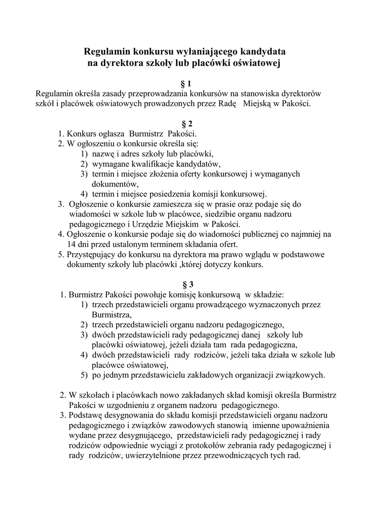 Regulamin konkursu wyłaniającego kandydata na dyrektora szkoły lub placówki oświatowej §1 Regulamin określa zasady przeprowadzania konkursów na stanowiska dyrektorów szkół i placówek oświatowych prowadzonych przez Radę Miejską w Pakości. §2 1. Konkurs ogłasza Burmistrz Pakości. 2. W ogłoszeniu o konkursie określa się: 1) nazwę i adres szkoły lub placówki, 2) wymagane kwalifikacje kandydatów, 3) termin i miejsce złożenia oferty konkursowej i wymaganych dokumentów, 4) termin i miejsce posiedzenia komisji konkursowej. 3. Ogłoszenie o konkursie zamieszcza się w prasie oraz podaje się do wiadomości w szkole lub w placówce, siedzibie organu nadzoru pedagogicznego i Urzędzie Miejskim w Pakości. 4. Ogłoszenie o konkursie podaje się do wiadomości publicznej co najmniej na 14 dni przed ustalonym terminem składania ofert. 5. Przystępujący do konkursu na dyrektora ma prawo wglądu w podstawowe dokumenty szkoły lub placówki ,której dotyczy konkurs. §3 1. Burmistrz Pakości powołuje komisję konkursową w składzie: 1) trzech przedstawicieli organu prowadzącego wyznaczonych przez Burmistrza, 2) trzech przedstawicieli organu nadzoru pedagogicznego, 3) dwóch przedstawicieli rady pedagogicznej danej szkoły lub placówki oświatowej, jeżeli działa tam rada pedagogiczna, 4) dwóch przedstawicieli rady rodziców, jeżeli taka działa w szkole lub placówce oświatowej, 5) po jednym przedstawicielu zakładowych organizacji związkowych. 2. W szkołach i placówkach nowo zakładanych skład komisji określa Burmistrz Pakości w uzgodnieniu z organem nadzoru pedagogicznego. 3. Podstawę desygnowania do składu komisji przedstawicieli organu nadzoru pedagogicznego i związków zawodowych stanowią imienne upoważnienia wydane przez desygnującego, przedstawicieli rady pedagogicznej i rady rodziców odpowiednie wyciągi z protokołów zebrania rady pedagogicznej i rady rodziców, uwierzytelnione przez przewodniczących tych rad. 4. W przypadku gdy członkiem komisji jest współmałżonek, krewny lub powaty osoby kandydującej w konkursie, albo pozostaje z niej w takim stosunku, który może budzić uzasadnione wątpliwości co do jego bezstronności - na wniosek przewodniczącego zostaje wyłączony z udziału w pracach komisji. 5. Przedstawiciel zakładowej lub międzyzakładowej organizacji związkowej nie może być pracownikiem szkoły, której konkurs dotyczy. §4 1. Do konkursu może przystąpić osoba spełniająca warunki określone odrębnymi przepisami. 2. Kandydat zgłaszający się do konkursu przedstawia: 1) zgłoszenie do konkursu, 2) kwestionariusz osobowy, 3) oryginały lub uwierzytelnione kserokopie dokumentów potwierdzających wykształcenie, stopień awansu zawodowego i posiadane kwalifikacje, 4) kartę oceny pracy z ostatnich 5 lat (min. ocena dobra), 5) aktualne zaświadczenie lekarskie o stanie zdrowia, 6) pisemną, własną koncepcję kierowania placówką o którą zabiega kandydat. 3. Przygotowane dokument kandydat zgłaszający się do konkursu składa za pokwitowaniem w sekretariacie Urzędu Miejskiego w Pakości w terminie podanym w ogłoszeniu o konkursie. §5 1. Postępowanie konkursowe obejmuje następujące etapy: 1) ocenę i analizę dokumentów złożonych przez kandydatów, 2) ocenę i analizę ofert i koncepcji działania szkoły lub placówki, 3) rozmowy kwalifikacyjne z kandydatami, 4) ustalenie wyników konkursu. 2. Postępowanie konkursowe określone w ust.1 w zależności od potrzeb przeprowadza się na jednym lub na kilku posiedzeniach komisji 1. 2. 3. 4. 5. 6. §6 Pracą komisji kieruje jej przewodniczący. Komisja pracuje na posiedzeniach, które zwołuje i którym przewodniczy przewodniczący Komisji. Komisja wybiera z-cę przewodniczącego, który go zastępuje w razie jego nieobecności. Dla prawomocności posiedzeń niezbędna jest obecność conajmniej 2/3 składu komisji. Posiedzenia komisji są protokołowane, a protokół podpisują wszyscy obecni na posiedzeniu członkowie komisji. Każdy członek komisji może wnosić uwagi do protokółu. §7 1. W razie stwierdzenia braków w dołączonych do ofert dokumentach Komisja wzywa zainteresowaną osobę do ich uzupełnienia w terminie wyznaczonym przez komisję. Przewodniczący komisji informuje kandydata, że w przypadku nie uzupełnienia braków w terminie wyznaczonym przez komisję nie będzie on dopuszczony do dalszego postępowania konkursowego. 2. Kandydat nie spełniający wymagań określonych regulaminem nie zostaje dopuszczony do dalszego postępowania konkursowego, o czym, przed przystąpieniem komisji do czynności, przewodniczący komisji zawiadamia kandydata. 3. Konkurs przeprowadza się nawet w przypadku zgłoszenia jednego kandydata. §8 1. Komisja przeprowadza rozmowy kwalifikacyjne ze wszystkim i kandatami dopuszczonymi do tego etapu konkursu. 2. Każdy z członków komisji ma prawo zadać kandydatowi pytania z następujących dziedzin: 1) kwalifikacje i przebieg pracy zawodowej kandydata, 2) koncepcja zarządzania i kierowania szkołą lub placówką. §9 1. Po rozmowach i dyskusji przewodniczący zarządza tajne głosowanie, które odbywa się za pomocą karty do głosowania zawierającej nazwiska wszystkich kandydatów. Każdy z członków komisji na swej karcie do głosowania podkreśla nazwisko tylko jednego kandydata. 2. W przypadku podkreślenia wielu nazwisk głos będzie nieważny. Można oddać kartę bez podkreśleń. § 10 Zwycięzcą jest kandydat, który uzyskał więcej niż połowę oddanych głosów ważnych. § 11 W przypadku gdy żaden z kandydatów nie uzyskał wymaganej większości głosów, a jest ich co najmniej trzech, a każdy z nich uzyskał inną liczbę głosów, przewodniczący komisji zarządza ponownie głosowanie nad dwoma kandydatami, którzy uzyskali w pierwszym głosowaniu największą liczbę głosów. Zwycięzcą zostanie kandydat który uzyska więcej niż połowę oddanych głosów ważnych. § 12 Jeżeli