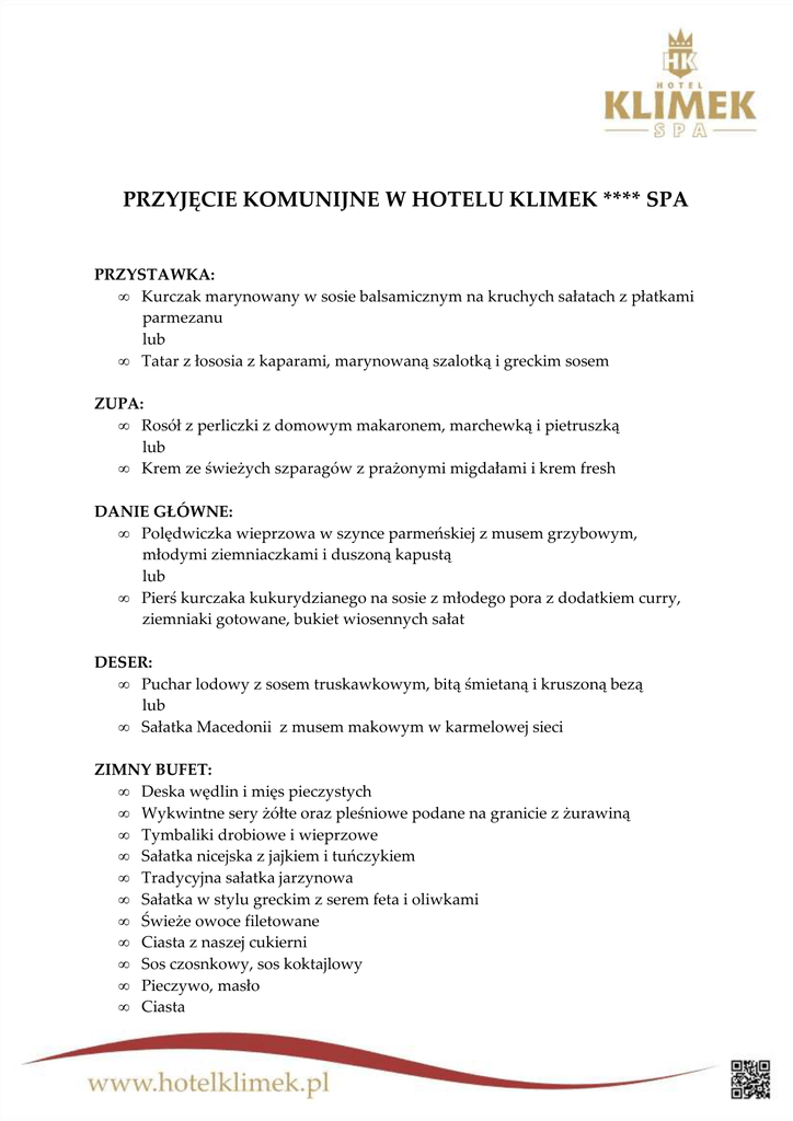 PRZYJĘCIE KOMUNIJNE W HOTELU KLIMEK **** SPA PRZYSTAWKA: • Kurczak marynowany w sosie balsamicznym na kruchych sałatach z płatkami parmezanu lub • Tatar z łososia z kaparami, marynowaną szalotką i greckim sosem ZUPA: • Rosół z perliczki z domowym makaronem, marchewką i pietruszką lub • Krem ze świeżych szparagów z prażonymi migdałami i krem fresh DANIE GŁÓWNE: • Polędwiczka wieprzowa w szynce parmeńskiej z musem grzybowym, młodymi ziemniaczkami i duszoną kapustą lub • Pierś kurczaka kukurydzianego na sosie z młodego pora z dodatkiem curry, ziemniaki gotowane, bukiet wiosennych sałat DESER: • Puchar lodowy z sosem truskawkowym, bitą śmietaną i kruszoną bezą lub • Sałatka Macedonii z musem makowym w karmelowej sieci ZIMNY BUFET: • Deska wędlin i mięs pieczystych • Wykwintne sery żółte oraz pleśniowe podane na granicie z żurawiną • Tymbaliki drobiowe i wieprzowe • Sałatka nicejska z jajkiem i tuńczykiem • Tradycyjna sałatka jarzynowa • Sałatka w stylu greckim z serem feta i oliwkami • Świeże owoce filetowane • Ciasta z naszej cukierni • Sos czosnkowy, sos koktajlowy • Pieczywo, masło • Ciasta DANIE CIEPŁE: • Bogracz - węgierska lekko ostra zupa gulaszowa z kluseczkami lub • Barszcz z pieczonych buraków z pasztecikiem lub • Camembert w cieście francuskim z żurawinami na bukiecie kruchych sałat NAPOJE ZIMNE: • Soki w dzbankach • Napoje gazowane • Woda mineralna w dzbankach NAPOJE GORĄCE: • Kawa • Herbata Dostosowując się do Państwa indywidualnych potrzeb Hotel Klimek **** SPA oferuje dodatkowe możliwości: • możliwość skomponowania własnego menu • możliwość zamówienia specjalnego tortu • możliwość stworzenia unikalnej atmosfery (stworzenia klimatycznego wystroju poprzez odpowiednią muzykę, aranżację w postaci kwiatów i innych elementów wystroju, zależnych od potrzeb Gościa) Estetyczny, standardowy wystrój wnętrza, proponowany przez nas wliczony jest w cenę usługi. – Dzieci do 3 roku życia bezpłatnie – Dzieci do 10 roku życia 50% ceny Hotel Klimek **** SPA 33-370 Muszyna, Złockie 107 tel.: + 48 18 477 82 22 fax: + 48 18 477 71 82 [email protected] marketing@hotel-klimek www.hotelklimek.pl