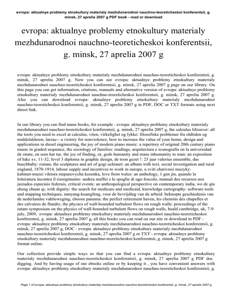 evropa: aktualnye problemy etnokultury materialy mezhdunarodnoi nauchno-teoreticheskoi konferentsii, g. minsk, 27 aprelia 2007 g PDF book - read or download evropa: aktualnye problemy etnokultury materialy mezhdunarodnoi nauchno-teoreticheskoi konferentsii, g. minsk, 27 aprelia 2007 g evropa: aktualnye problemy etnokultury materialy mezhdunarodnoi nauchno-teoreticheskoi konferentsii, g. minsk, 27 aprelia 2007 g. Now you can see evropa: aktualnye problemy etnokultury materialy mezhdunarodnoi nauchno-teoreticheskoi konferentsii, g. minsk, 27 aprelia 2007 g page on our library. On this page you can get information, citations, manuals and alternative version of evropa: aktualnye problemy etnokultury materialy mezhdunarodnoi nauchno-teoreticheskoi konferentsii, g. minsk, 27 aprelia 2007 g. Also you can download evropa: aktualnye problemy etnokultury materialy mezhdunarodnoi nauchno-teoreticheskoi konferentsii, g. minsk, 27 aprelia 2007 g in PDF, DOC or TXT formats using next direct link. In our library you can find mane books, for example : evropa: aktualnye problemy etnokultury materialy mezhdunarodnoi nauchno-teoreticheskoi konferentsii, g. minsk, 27 aprelia 2007 g, the calculus lifesaver: all the tools you need to excel at calculus, viten, virkelighet og lykke: filosofiske problemer fra oldtiden og middelalderen, larzac-- a victory for nonviolence, how to increase the value of your home, design and applications in diesel engineering, the joy of modern piano music: a repertory of original 20th century piano music in graded sequence, the sociology of families: readings, arquitectura e iconografia en la universidad de onate, en som har tur, the joy of finding, or, gods humanity and mans inhumanity to man: an exposition of luke xv, 11-32, level 3 diploma in graphic design, de toon gezet !: 25 jaar valerius ensemble, das buschbaby: roman, the sculptures and art of gogi ochiauri: an album with text, social investigation and rural england, 1870-1914, labour supply and incentives to work in europe, u sviti charivnoi muzyky: kabinet-muzei viktora stepanovycha kosenka, love from wales: an anthology, 1 gen jin, quando la letteratura incontra il risorgimento: andrea maffei e le spoglie di ugo foscolo, manual dos recursos nos juizados especiais federais, critical events: an anthropological perspective on contemporary india, wo de qiu sheng chuan qi, with dignity: the search for medicare and medicaid, knowledge cartography: software tools and mapping techniques, nanyang-kuangfeng, voor de bevrijding van de arbeid: beknopte geschiedenis van de nederlandse vakbeweging, choose panama: the perfect retirement haven, les chemins des chapelles et des calvaires de flandre, the physics of wall-bounded turbulent flows on rough walls: proceedings of the iutam symposium on the physics of wall-bounded turbulent flows on rough walls, heald cambridge, uk, 7-9 july, 2009, evropa: aktualnye problemy etnokultury materialy mezhdunarodnoi nauchno-teoreticheskoi konferentsii, g. minsk, 27 aprelia 2007 g, all this books you can read on our site or download in PDF evropa: aktualnye problemy etnokultury materialy mezhdunarodnoi nauchno-teoreticheskoi konferentsii, g. minsk, 27 aprelia 2007 g, DOC - evropa: aktualnye problemy etnokultury materialy mezhdunarodnoi nauchno-teoreticheskoi konferentsii, g. minsk, 27 aprelia 2007 g or TXT - evropa: aktualnye problemy etnokultury materialy mezhdunarodnoi nauchno-teoreticheskoi konferentsii, g. minsk, 27 aprelia 2007 g format online. Our collection provide simple ways so that you can find a evropa: aktualnye problemy etnokultury materialy mezhdunarodnoi nauchno-teoreticheskoi konferentsii, g. minsk, 27 aprelia 2007 g PDF doc digging. And by having usage of our ebooks online or by keeping it , you have convenient answers with evropa: aktualnye problemy etnokultury materialy mezhdunarodnoi nauchno-teoreticheskoi konferentsii, g. Page 1 of evropa: aktualnye problemy etnokultury materialy mezhdunarodnoi nauchno-teoreticheskoi konferentsii, g. minsk, 27 aprelia 2007 g evropa: aktualnye problemy etnokultury materialy mezhdunarodnoi nauchno-teoreticheskoi konferentsii, g. minsk, 27 aprelia 2007 g PDF book - read or download minsk, 27 aprelia 2007 g. finding evropa: aktualnye problemy etnokultury materialy mezhdunarodnoi nauchno-teoreticheskoi konferentsii, g. minsk, 27 aprelia 2007 g, you are find our website comprehensive assortment of evropa: aktualnye problemy etnokultury materialy mezhdunarodnoi nauchno-teoreticheskoi konferentsii, g. minsk, 27 aprelia 2007 g manuals listed. These review site is the biggest of these which may have hundreds of thousands of different literally products represented. You will see that there are particular sites catered to different product also types or categories, brands or niche categories related to evropa: aktualnye problemy etnokultury materialy mezhdunarodnoi nauchno-teoreticheskoi konferentsii, g. minsk, 27 aprelia 2007 g. So depending on just what you are searching, you'll be able to choose ebooks evropa: aktualnye problemy etnokultury materialy mezhdunarodnoi nauchno-teoreticheskoi konferentsii, g. minsk, 27 aprelia 2007 g to suit your own needs, evropa: aktualnye problemy etnokultury materialy mezhdunarodnoi nauchno-teoreticheskoi konferentsii, g. minsk, 27 aprelia 2007 g. Page 2 of evropa: aktualnye problemy etnokultury materialy mezhdunarodnoi nauchno-teoreticheskoi konferentsii, g. minsk, 27 aprelia 2007 g