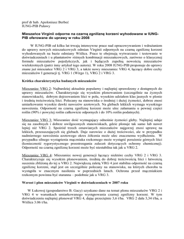prof dr hab. Apoloniusz Berbeć IUNG-PIB Puławy Mieszańce Virginii odporne na czarną zgniliznę korzeni wyhodowane w IUNGPIB oferowane do uprawy w roku 2008 W IUNG-PIB od kilku lat trwają intensywne prace nad opracowywaniem i wdrażaniem do uprawy nowych mieszańcowych odmian Virginii odpornych na czarną zgniliznę korzeni wyhodowanych na bazie odmiany Wiślica. Prace te obejmują wytwarzanie i testowanie w doświadczeniach i u plantatorów różnych kombinacji mieszańcowych, zarówno o klasycznej formule mieszańców pojedyńczych, jak i będących zupełną nowością mieszańców wielokrotnych (patrz inny artykuł tego autora). W roku 2008 IUNG-PIB proponuje do uprawy znane już mieszańce VRG 2 i VRG 3, a także nowy mieszaniec VRG 4, łączący dobre cechy mieszańców I generacji tj. VRG 1 (Wirgo 1), VRG 2 i VRG 3. Krótka charakterystyka badanych mieszańców Mieszaniec VRG 2: Najbardziej aktualnie popularny i najlepiej sprawdzony z dostępnych do uprawy mieszańców. Charakteryzuje się wysokim plonowaniem (szczególnie na żyznych stanowiskach), dobrym dojrzewaniem liści w polu, wysokim udziałem klas jasnych w plonie i średnią treściwością liści. Polecany na stanowiska o średniej i dużej żyzności, dobrze znosi umiarkowanie wysokie dawki nawozów azotowych. Na glebach lekkich wymaga wysokiego nawożenia. Odporność na czarną zgniliznę korzeni może ulec załamaniu u pewnej części roślin (90% i powyżej roślin całkowicie odpornych i do 10% roślin podatnych). Mieszaniec VRG 3: Mieszaniec dość wymagający odnośnie żyzności gleby. Najlepiej udaje się na zasobnych i dobrze uwilgoconych stanowiskach, gdzie plonuje tak samo lub nawet lepiej niż VRG 2. Spośród trzech omawianych mieszańców najgorzej znosi uprawę na lekkich, przesuszających się glebach. Daje surowiec o dużej treściwości, ale w przypadku nadmiernego nawożenia azotowego okres żółcenia może ulec znacznemu wydłużeniu. W przypadku silnego wystąpienia mączniaka rzekomego może wystąpić porażenie górnych liści (konieczność rygorystycznego przestrzegania zaleceń dotyczących ochrony chemicznej). Odporność na czarną zgniliznę korzeni może być niestabilna tak jak u VRG 2. Mieszaniec VRG 4: Mieszaniec nowej generacji łączący niektóre cechy VRG 2 i VRG 3. Charakteryzuje się wysokim plonowaniem, średnią do dobrej treściwością liści i łatwością suszenia zbliżoną do tej u VRG 2. Największą zaletą VRG 4 jest stabilna odporność na czarną zgniliznę korzeni, stąd jest on szczególnie polecany na stanowiska, na których choroba ta wystąpiła w znacznym nasileniu w poprzednich latach. Ochrona przed mączniakiem rzekomym powinna być staranna – podobnie jak u VRG 3. Wzrost i plon mieszańców Virginii w doświadczeniach w 2007 roku W Łukowej (gospodarstwo B. Gacy) uzyskano dane na temat plonu mieszańców VRG 2 i VRG 4 w warunkach umiarkowanego występowania czarnej zgnilizny korzeni. W tym doświadczeniu najlepiej plonował VRG 4, dając przeciętnie 3,6 t/ha. VRG 2 dała 3,34 t/ha, a Wiślica 3.06 t/ha. 3.6 4 3.34 3.06 3.5 3 2.5 2 1.5 1 0.5 0 VRG 2 VRG 4 Wiślica Plon mieszańców VRG 2 i VRG 4 (wysuszone liście w t/ha) w Łukowej Szczegółowiej badano mieszańce VRG 2, VRG 3 i VRG 4 w Głębokim, gmina Uścimów na zachodnim Podlasiu. 128.8 125.5 125.5 125.8 30 114.2 120.0 25 20.3 20.6 20.3 21.1 16.7 100.0 20 80.0 15 60.0 10 40.0 5 20.0 0 0.0 VRG 1 VRG 2 VRG 3 Liczba liści mieszańców Głębokim (2007) VRG 4 Virginii 65 54 54 Wiślica badanych VRG 1 w 57 57 58 VRG 3 VRG 4 Wiślica 55 50 45 40 35 30 25 VRG 2 VRG 3 VRG 4 Wiślica Wysokość roślin mieszańców Virginii badanych w Głębokim (2007) 60 VRG 1 VRG 2 Jak widać na wykresach, liczba wykształconych liści użytkowych nie różniła się bardzo u badanych mieszańców, ale była znacznie wyższa niż u Wiślicy. Spowodowane to było przede wszystkim tym, że badane mieszańce rosły na polu, na którym już od lat występuje czarna zgnilizna korzeni. Liczba dni do ogłowienia u mieszańców Virginii w Głębokim Z tego samego powodu rośliny Wiślicy, jako odmiany podatnej były znacznie niższe niż rośliny mieszańców odpornych. Najbujniejsze były rośliny mieszańca VRG 1. Mieszaniec ten 2 jednak wykazuje w wielu przypadkach słabszą niż inne odmiany treściwość liści, toteż nie występuje on w ofercie odmian na rok bieżący. Najwcześniej fazę różowego pąka (ogławiania) osiągały mieszańce VRG 1 i VRG 2. VRG 3 i VRG 4 były nieco późniejsze, a najpóźniej pąkowała Wiślica. Najwolniejszy wzrost tej ostatniej odmiany był w dużym stopniu spowodowany porażeniem przez czarną zgniliznę korzeni. 3.5 2.96 3.14 2.93 3.03 1.95 23853 25124 23608 24366 VRG 1 VRG 2 VRG 3 VRG 4 15655 25000 3.0 20000 2.5 2.0 15000 1.5 10000 1.0 5000 0.5 0.0 0 VRG 1 VRG 2 VRG 3 VRG 4 Wiślica Plon wysuszonych liści (t/ha) mieszańców Virginii w Głębokim Wiślica Wartość zebranego plonu (zł/ha) mieszańców Virginii w Głębokim W Głębokim najlepiej plonowały mieszańce VRG 2 i VRG 4. W warunkach dość silnego występowania czarnej zgnilizny korzeni na polu, na którym prowadzono doświadczenie zwyżka plonu w stosunku do Wiślicy wynosiła 1,19 t/ha w przypadku VRG 2 i 1,08 t/ha w przypadku VRG 4. W przypadku pozostałych dwóch mieszańców odpowiednie zwyżki plonu również wynosiły ok. 1 t ha.. Ze względu na to, że u wszystkich 4 mieszańców uzyskano podobny układ klas wykupowych, uszeregowanie pod względem plonu przekładało się na dochód z 1 ha uprawy. Najlepiej pod tym względem wypadły VRG 2 i VRG 4. W podsumowaniu, VRG 2 od kilku lat sprawdza się jako odmiana, która z dużym powodzeniem zastępuje Wiślicę w warunkach występowania czarnej zgnilizny korzeni. Z kilkuletnich obserwacji wynika ponadto, że również w warunkach nie występowania tej choroby jest godna polecenia, ze względu na łatwość suszenia nawet w warunkach żyznego stanowiska i wyso