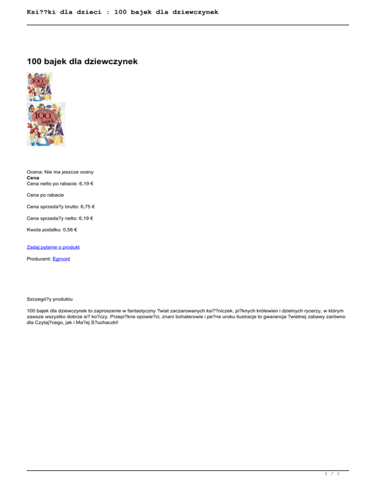 Ksi??ki dla dzieci : 100 bajek dla dziewczynek 100 bajek dla dziewczynek Ocena: Nie ma jeszcze oceny Cena Cena netto po rabacie: 6,19 € Cena po rabacie Cena sprzeda?y brutto: 6,75 € Cena sprzeda?y netto: 6,19 € Kwota podatku: 0,56 € Zadaj pytanie o produkt Producent: Egmont Szczegó?y produktu 100 bajek dla dziewczynek to zaproszenie w fantastyczny ?wiat zaczarowanych ksi??niczek, pi?knych królewien i dzielnych rycerzy, w którym zawsze wszystko dobrze si? ko?czy. Przepi?kne opowie?ci, znani bohaterowie i pe?ne uroku ilustracje to gwarancja ?wietnej zabawy zarówno dla Czytaj?cego, jak i Ma?ej S?uchaczki! 1 / 1 Powered by TCPDF (www.tcpdf.org)