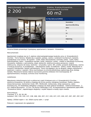 MIESZKANIE na WYNAJEM 2 200 Kraków, Kraków-Krowodrza, Krowoderskich Zuchów 60 m2 678/3814/OMW Secondary ApartmentBuilding 2011 3 14 3 Adjoining 1 Opis Victoria Estate prezentuje 3-pokojowy apartament z tarasem - Krowodrza Nieruchomość: Apartament znajduje się na 3. piętrze czternastopiętrowego budynku przy ul. Krowoderskich Zuchów - Torre Verona. Składa się z sypialni, pokoju, salonu z aneksem kuchennym, łazienki, przedpokoju oraz tarasu. W sypialni - szafa, łóżko dwuosobowe, komoda; pokój - szafa, łóżko jednoosobowe; salon - rozkładana kanapa, stolik, telewizor; aneks - meble w zabudowie kuchennej, zmywarka, lodówka z zamrażarką, okap, piekarnik, elektryczna płyta grzewcza, czajnik elektryczny, ekspres do kawy; łazienka - umywalka, lustro, WC, pralka, grzejnik drabinkowy, wanna z funkcją prysznica; w przedpokoju - zabudowana szafa; na balkonie - ławka i stolik. Mieszkanie w wysokim standardzie, świeżo odmalowane. Taras rozciągający się na długość całego mieszkania z wyjściem z salonu i sypialni. Okna wychodzące na stronę południową zapewniają duży dostęp światła. Mieszkanie bardzo dobrze wyciszone pomimo bliskości linii tramwajowej. W apartamentowcu recepcja, ochrona oraz monitoring. Lokalizacja: Mieszkanie zlokalizowane jest w północnej części Krakowa przy ul. Krowoderskich Zuchów dzielnica Krowodrza. W okolicy znajdują się liczne punkty usługowo-handlowe: Żabka, Awiteks, stacja benzynowa, bankomat, kiosk, KFC, McDonald, restauracja, sklep spożywczy, salon kosmetyczny. W niedalekiej odległości znajdują się dwie galerie handlowe - Galeria Krakowska - 3 km; Galeria Bronowice - 2,5 km. Do Rynku Głównego 3 km. W bezpośrednim sąsiedztwie pętla MPK "Krowodrza Górka", zapewniająca dogodny i szybki dojazd w każdy rejon miasta. Komunikacja: Tramwaj: 3, 5, 18, 50, 69 Autobus: 102, 118, 120, 137, 138, 168, 194, 207, 217, 220, 227, 237, 240, 247, 267, 287, 297, 637 Opłaty: 2550zł najem + ok. 550zł czynsz adm. + prąd Polecam i zapraszam do oglądania! Victoria Estate Małgorzata Wicha tel. +48 511 560 721 email: [email protected] Victoria Estate Powered by TCPDF (www.tcpdf.org)