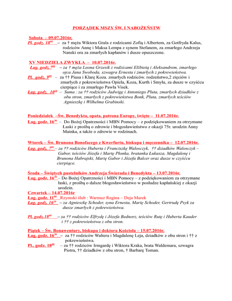 PORZĄDEK MSZY ŚW. I NABOŻEŃSTW Sobota – 09.07.2016r. Pl. godz. 1800 – za † męża Wiktora Grala z rodzicami Zofią i Albertem, za Gotfryda Kalus, rodziców Annę i Maksa Lempa z synem Stefanem, za zmarłego Andrzeja Nanski ora za zmarłych kapłanów i dusze opuszczone. XV NIEDZIELA ZWYKŁA – 10.07.2016r. Łag. godz.700 – za † męża Leona Grzesik z rodzicami Elżbietą i Aleksandrem, zmarłego ojca Jana Swoboda, szwagra Ernesta i zmarłych z pokrewieństwa. 00 Pl. godz. 9 – za †† Piusa i Klarę Koza. zmarłych rodziców. rodzeństwo,2 zięciów i zmarłych z pokrewieństwa Opiela, Koza, Kurth i Smyła, za dusze w czyśćcu cierpiące i za zmarłego Pawła Visek. 30 Łag. godz. 10 – Suma : za †† rodziców Jadwigę i Antoniego Pluta, zmarłych dziadków z obu stron, zmarłych z pokrewieństwa Bonk, Pluta, zmarłych teściów Agnieszkę i Wilhelma Grabinski. Poniedziałek –Św. Benedykta, opata, patrona Europy, święto – 11.07.2016r. Łag. godz. 1630 – Do Bożej Opatrzności i MBN Pomocy – z podziękowaniem za otrzymane Łaski z prośbą o zdrowie i błogosławieństwo z okazji 75r. urodzin Anny Mainka, a także o zdrowie w rodzinach. Wtorek – Św. Brunona Bonofacego z Kwerfurtu, biskupa i męczennika – 12.07.2016r. Łag. godz. 700 – za †† rodziców Huberta i Franciszkę Walosczyk, †† dziadków Walosczyk – Gabor, teściów Józefa i Martę Płonka, bratanka Łukasza, Magdalenę i Brunona Habrajski, Marię Gabor i Józefa Balcer oraz dusze w czyśćcu cierpiące. Środa – Świętych pustelników Andrzeja Świerada i Benedykta – 13.07.2016r. Łag. godz. 1630 – Do Bożej Opatrzności i MBN Pomocy – z podziękowaniem za otrzymane łaski, z prośbą o dalsze błogosławieństwo w posłudze kapłańskiej z okazji urodzin. Czwartek – 14.07.2016r Łag. godz. 1100 Rzymski ślub : Warmuz Regina – Deja Marek Łag. godz. 1630 – za Agnieszkę Schoder, syna Ernesta, Marię Schoder, Gertrudę Psyk za dusze zmarłych z pokrewieństwa. Pl. godz.1800 – za †† rodziców Elfrydę i Józefa Bednorz, teściów Rutę i Huberta Kauder i †† z pokrewieństwa z obu stron. Piątek – Św. Bonawentury, biskupa i doktora Kościoła – 15.07.2016r. Łag. godz. 1630 – za †† rodziców Waltera i Magdalenę Leja, dziadków z obu stron i †† z pokrewieństwa. Pl., godz. 1800 – za †† rodziców Irmgardę i Wiktora Kraka, brata Waldemara, szwagra Piotra, †† dziadków z obu stron, † Barbarę Toman. Sobota –NMP z Góry Karmel – 16.07.2016r. Pl. godz1200 – Rzymski ślub : Kaliciak Patrycja – Juzba Grzegorz. Pl.godz.1300 – Rzymski ślub : Kandora Sandra – Górecki Arkadiusz. Łag. godz.1500 – W intencji rodziny Ziaja. Łag. godz. 1600 – za †† rodziców Paulinę i Teodora Langner z synem Piotrem, † Agnieszkę Schoder z synem Ernestem, za †† z pokrewieństwa Badura – Langner. 00 Pl. godz. 18 – za † męża Wiktora Grala, za dusze †† rodziców Zofię i Alberta Grala za † Gotfryda Kalus, †† rodziców Annę i Maksa Lempa z synem Stefanem, za zmarłego Andrzeja Nanska oraz za zmarłych kapłanów, siostry zakonne i dusze w czyśćcu cierpiące. XVI NIEDZIELA ZWYKŁA – 17.07.2016r. Łag. godz.700 – za †† Józefa i Marię Kandora z córką Martą, synem Józefem, wnukami : Klaudią, Piotrem, Henrykiem, za zmarłych Wilhelma, Franciszka Krawczyk z córkami Klarą, Hildegardą, za syna Horsta i za wszystkie dusze z pokrewieństwa : Kandora, Krawczyk, Opiela,Kuś i Kłysz. 00 Pl. godz. 9 – za † ojca Jana Mańka, † matkę Reginę Gruca, siostrę Renatę Richter, zmarłych szwagrów Piotra i Franciszka oraz za zmarłych dziadków : Mańka, Jonczyk i za zmarłą Apolonię Jelonek. . Łag. godz. 1030 – Suma : za † Annę Bonk, Marię Kopyto, Alberta i Martę Bryłka, Gerarda i Magdalenę Bryłka oraz zmarłych z pokrewieństwa Bonk i Bryłka. OGŁOSZENIA PARAFIALNE. Dziś kolekta na WMSD i instytucje diecezjalne. Od 15 do 19 lipca na Górze Św. Anny – Święto Młodzieży. W niedzielę 17 lipca na Górze Św. Anny – Uroczystość MB Szkaplerznej – obchody kalwaryjskie.