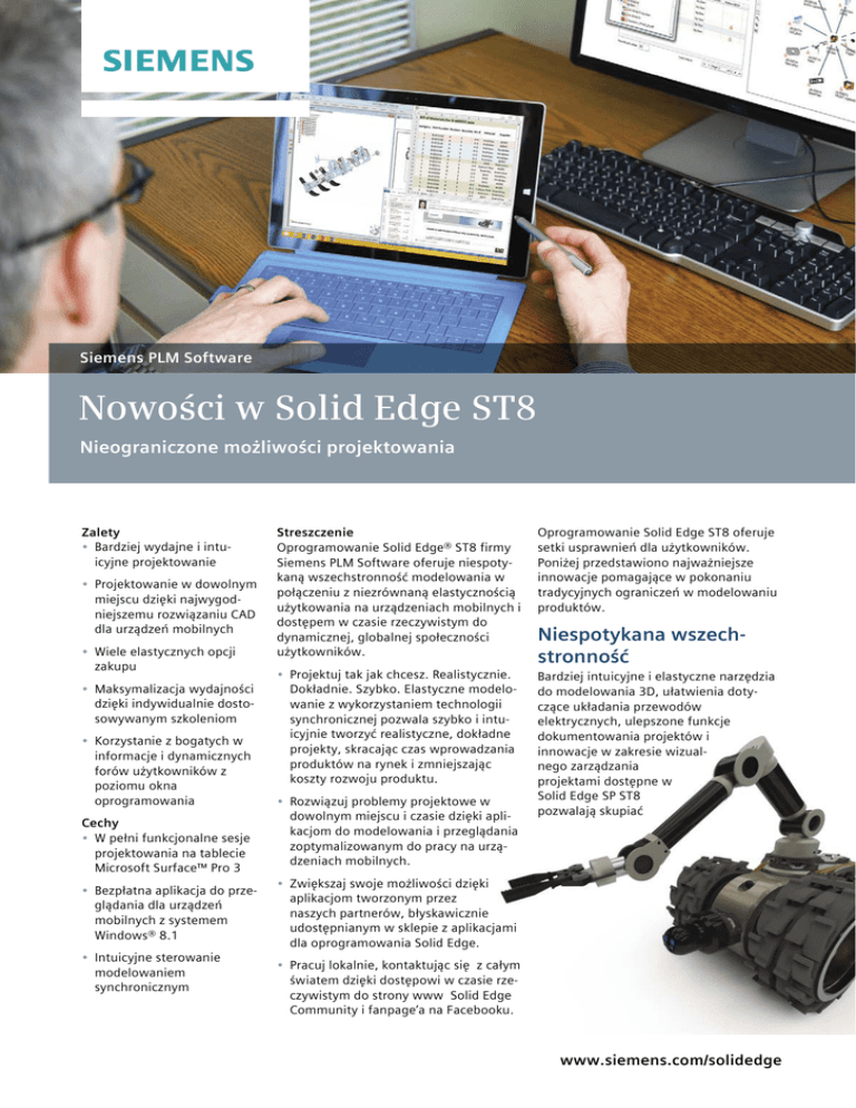 Siemens PLM Software Nowości w Solid Edge ST8 Nieograniczone możliwości projektowania Zalety • Bardziej wydajne i intuicyjne projektowanie • Projektowanie w dowolnym miejscu dzięki najwygodniejszemu rozwiązaniu CAD dla urządzeń mobilnych • Wiele elastycznych opcji zakupu • Maksymalizacja wydajności dzięki indywidualnie dostosowywanym szkoleniom • Korzystanie z bogatych w informacje i dynamicznych forów użytkowników z poziomu okna oprogramowania Cechy • W pełni funkcjonalne sesje projektowania na tablecie Microsoft Surface™ Pro 3 • Bezpłatna aplikacja do przeglądania dla urządzeń mobilnych z systemem Windows® 8.1 • Intuicyjne sterowanie modelowaniem synchronicznym Streszczenie Oprogramowanie Solid Edge® ST8 firmy Siemens PLM Software oferuje niespotykaną wszechstronność modelowania w połączeniu z niezrównaną elastycznością użytkowania na urządzeniach mobilnych i dostępem w czasie rzeczywistym do dynamicznej, globalnej społeczności użytkowników. • Projektuj tak jak chcesz. Realistycznie. Dokładnie. Szybko. Elastyczne modelowanie z wykorzystaniem technologii synchronicznej pozwala szybko i intuicyjnie tworzyć realistyczne, dokładne projekty, skracając czas wprowadzania produktów na rynek i zmniejszając koszty rozwoju produktu. • Rozwiązuj problemy projektowe w dowolnym miejscu i czasie dzięki aplikacjom do modelowania i przeglądania zoptymalizowanym do pracy na urządzeniach mobilnych. Oprogramowanie Solid Edge ST8 oferuje setki usprawnień dla użytkowników. Poniżej przedstawiono najważniejsze innowacje pomagające w pokonaniu tradycyjnych ograniczeń w modelowaniu produktów. Niespotykana wszechstronność Bardziej intuicyjne i elastyczne narzędzia do modelowania 3D, ułatwienia dotyczące układania przewodów elektrycznych, ulepszone funkcje dokumentowania projektów i innowacje w zakresie wizualnego zarządzania projektami dostępne w Solid Edge SP ST8 pozwalają skupiać • Zwiększaj swoje możliwości dzięki aplikacjom tworzonym przez naszych partnerów, błyskawicznie udostępnianym w sklepie z aplikacjami dla oprogramowania Solid Edge. • Pracuj lokalnie, kontaktując się z całym światem dzięki dostępowi w czasie rzeczywistym do strony www Solid Edge Community i fanpage’a na Facebooku. www.siemens.com/solidedge SOLID EDGE Nowości w Solid Edge ST8 Cechy — ciąg dalszy • Usprawnione projektowanie komponentów w dużych złożeniach przyspieszające pracę nad projektem • Dokładna kontrola nad położeniem, rozmieszczeniem i orientacją komponentów względem dowolnej krzywej • Trwałe informacje PMI i inteligentne definiowanie tras ułatwiające układanie przewodów elektrycznych • Łatwe porównywanie rewizji rysunku skracające okres między projektowaniem a produkcją się na projektach, a mniej na samym narzędziu. Możliwość dokładnego symulowania warunków pracy produktu zmniejsza potrzebę tworzenia fizycznych prototypów, co ostatecznie przyspiesza proces modelowania i skraca czas wprowadzania produktów na rynek. Intuicyjne projektowanie napędzane technologią synchroniczną Modelowanie synchroniczne jest jeszcze bardziej intuicyjne dzięki usprawnionemu interfejsowi wyświetlającemu tylko treść zgodną z zamierzeniami. W miarę wprowadzania szybkich zmian w modelu wyświetlane są tylko te informacje, które bezpośrednio wpływają na modyfikacje, co pozwala skoncentrować się na projekcie. • Rozszerzone funkcje wizualnego zarządzania projektami • Krzywa śrubowa Za pomocą punktów charakterystycznych lub geometrii walcowej i stożkowej można tworzyć krzywe śrubowe lub spiralne i nimi sterować. Różne typy skoku znacznie upraszczają konstruowanie szczegółów złożonych powierzchni i rur. Zaawansowane projektowanie konstrukcji spawanych Spoiny zastosowane w jednym złożeniu można zapisać w plikach części i zastosować w złożeniach alternatywnych bez względu na orientację. Jest to duże udogodnienie w projektach maszyn wymagających wielu spoin. • Aktualizowane na żywo informacje ze strony www Solid Edge Community łączącej lokalnych i globalnych użytkowników Elastyczne tworzenie szyków Dzięki usprawnieniu rozpoznawania szyków otworów w importowanej geometrii oprogramowanie Solid Edge rozpoznaje teraz regularne powtórzenia dowolnej geometrii, na przykład szyki kołowe, prostokątne, a nawet zdefiniowane przez użytkownika. Ponadto geometrię można układać w szyki nieregularne. Projektowanie w kontekście Projektowanie wieloelementowych złożeń można uprościć dzięki możliwości umieszczania geometrii z komponentów wyższego poziomu podczas edytowania części i podzłożeń w kontekście złożenia. Ponadto można tworzyć powiązania między częściami bez dostępu z uprawnieniami zapisu do złożenia wyższego poziomu, co umożliwia szybsze zakończenie przedsięwzięć projektowych. Realistyczne modelowanie układu napędowego Osiągnięto dokładną, bardziej realistyczną symulację ruchu napędów łańcuchowych i gąsienic dzięki nowej SOLID EDGE relacji Ścieżka, która umożliwia precyzyjne sterowanie położeniem komponentów wzdłuż krzywej. Ponadto można ustawić te komponenty w szyku wzdłuż ścieżki, dostosowując w razie potrzeby ich rozstawienie i orientację. Jest to bardzo przydatne podczas projektowania maszyn. Modelowanie mechanizmów Podzłożenia mogą teraz wymuszać ruch otaczających komponentów i poruszać się w reakcji na działanie zewnętrznych elementów napędzających. Dzięki temu uzyskuje się dokładną symulację ruchu mechanizmu, która jeszcze bardziej zmniejsza potrzebę budowania fizycznych prototypów. Układanie okablowania na podstawie informacji PMI Oznaczenia zacisków i złączy oraz nazwy styków są definiowane jako trwałe informacje o produkcie i wytwarzaniu (PMI), co łączy logikę wspomaganego komputerowo projektowania układów elektronicznych (ECAD) z geometrią fiz