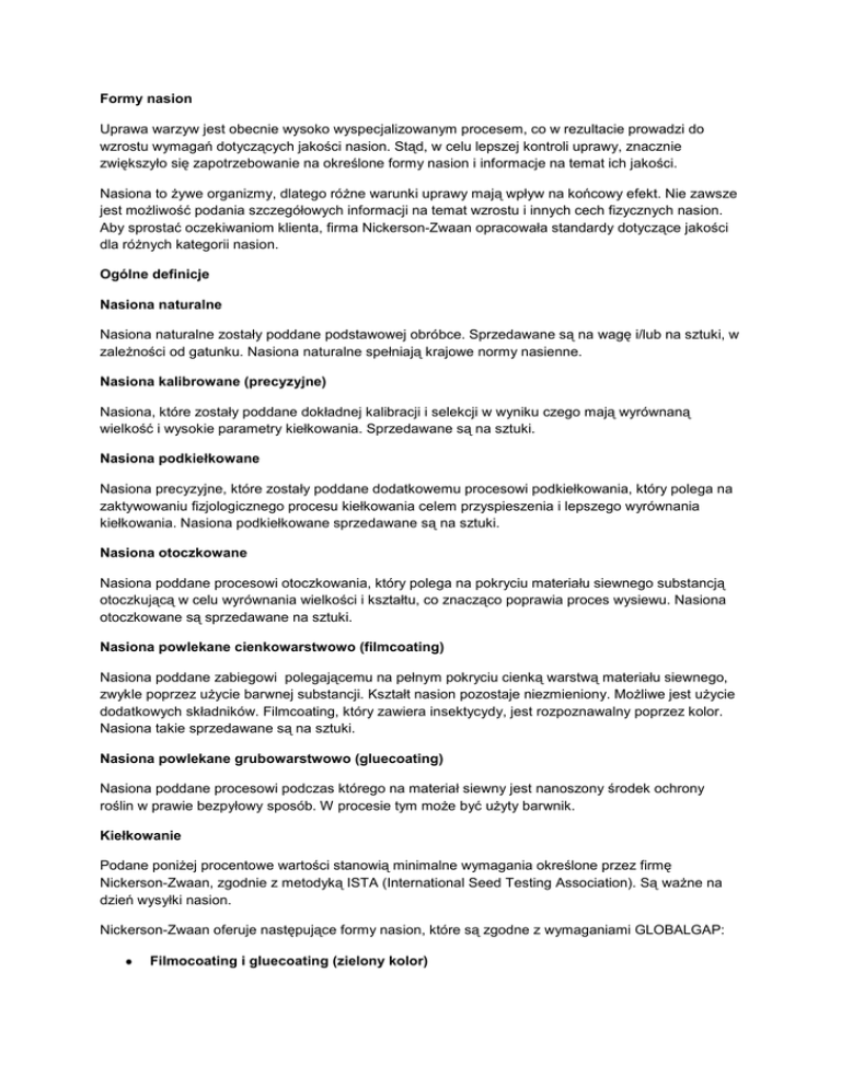 Formy nasion Uprawa warzyw jest obecnie wysoko wyspecjalizowanym procesem, co w rezultacie prowadzi do wzrostu wymagań dotyczących jakości nasion. Stąd, w celu lepszej kontroli uprawy, znacznie zwiększyło się zapotrzebowanie na określone formy nasion i informacje na temat ich jakości. Nasiona to żywe organizmy, dlatego różne warunki uprawy mają wpływ na końcowy efekt. Nie zawsze jest możliwość podania szczegółowych informacji na temat wzrostu i innych cech fizycznych nasion. Aby sprostać oczekiwaniom klienta, firma Nickerson-Zwaan opracowała standardy dotyczące jakości dla różnych kategorii nasion. Ogólne definicje Nasiona naturalne Nasiona naturalne zostały poddane podstawowej obróbce. Sprzedawane są na wagę i/lub na sztuki, w zależności od gatunku. Nasiona naturalne spełniają krajowe normy nasienne. Nasiona kalibrowane (precyzyjne) Nasiona, które zostały poddane dokładnej kalibracji i selekcji w wyniku czego mają wyrównaną wielkość i wysokie parametry kiełkowania. Sprzedawane są na sztuki. Nasiona podkiełkowane Nasiona precyzyjne, które zostały poddane dodatkowemu procesowi podkiełkowania, który polega na zaktywowaniu fizjologicznego procesu kiełkowania celem przyspieszenia i lepszego wyrównania kiełkowania. Nasiona podkiełkowane sprzedawane są na sztuki. Nasiona otoczkowane Nasiona poddane procesowi otoczkowania, który polega na pokryciu materiału siewnego substancją otoczkującą w celu wyrównania wielkości i kształtu, co znacząco poprawia proces wysiewu. Nasiona otoczkowane są sprzedawane na sztuki. Nasiona powlekane cienkowarstwowo (filmcoating) Nasiona poddane zabiegowi polegającemu na pełnym pokryciu cienką warstwą materiału siewnego, zwykle poprzez użycie barwnej substancji. Kształt nasion pozostaje niezmieniony. Możliwe jest użycie dodatkowych składników. Filmcoating, który zawiera insektycydy, jest rozpoznawalny poprzez kolor. Nasiona takie sprzedawane są na sztuki. Nasiona powlekane grubowarstwowo (gluecoating) Nasiona poddane procesowi podczas którego na materiał siewny jest nanoszony środek ochrony roślin w prawie bezpyłowy sposób. W procesie tym może być użyty barwnik. Kiełkowanie Podane poniżej procentowe wartości stanowią minimalne wymagania określone przez firmę Nickerson-Zwaan, zgodnie z metodyką ISTA (International Seed Testing Association). Są ważne na dzień wysyłki nasion. Nickerson-Zwaan oferuje następujące formy nasion, które są zgodne z wymaganiami GLOBALGAP: Filmocoating i gluecoating (zielony kolor) Podczas procesów pokrycia cienkowarstwowego i grubowarstwowego jest użyty jeden lub więcej fungicydów. Fungicydy te chronią nasiona przed patogenami glebowymi i są standardowo stosowane przez firmę Nickerson-Zwaan. Kalibracja i zaprawianie przeciwko insektycydom (czerwony kolor) Zaprawianie insektycydowe polega na pełnym pokryciu materiału siewnego cienką warstwą substancji zawierającą jeden lub więcej fungicydów i jeden insektycyd. Dzięki tym zabiegom można znacznie ograniczyć stosowanie środków ochrony roślin. Metoda ta dopuszczalna jest dla takich gatunków jak kapustne, marchew, cebula i por. Zaprawianie insektycydem okazało się niezawodną metodą ochrony przed śmietką w początkowej fazie uprawy takich gatunków jak kapusta, marchew i cebula, poprzez ograniczenie lub wyeliminowanie rozwoju populacji szkodnika.