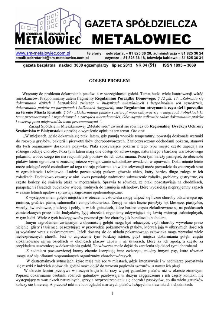 lipiec 2013 - Spółdzielnia Mieszkaniowa "Metalowiec"