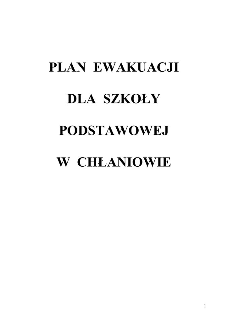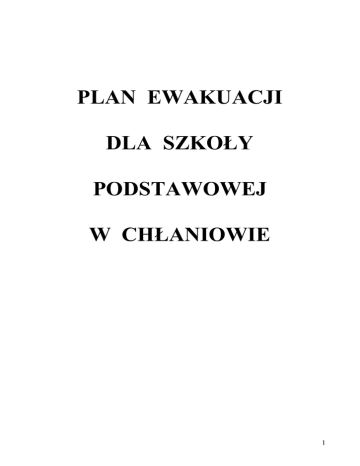 PLAN EWAKUACJI DLA SZKOŁY PODSTAWOWEJ W CHŁANIOWIE 1 I. Charakterystyka obiektu szkolnego Szkoła Podstawowa w Chłaniowie zlokalizowana jest na terenie wsi Chłaniów. W szkole jest 1 oddział przedszkolny i 6 oddziałów klas I-VI. W przedziale czasowym od godziny 730 do 1415 przebywa około 80 uczniów, nauczyciele i personel pomocniczy. Obiekt szkolny to budynek jednopiętrowy, którego konstrukcja: ściany i stropodach wykonane są z materiałów niepalnych. Pokrycie stropodachu wykonane jest z papy. Budynek szkoły składa się z parteru i piętra oraz podpiwniczenia. Na piętrze znajdują się sale lekcyjne, pracownia komputerowa, toalety. Na parter prowadzą dwa zejścia schodami. Znajdują się tu sale lekcyjne, pokój dyrektora, pokój nauczycielski, biblioteka szkolna, kuchnia, zastępcza sala gimnastyczna, szatnia, toalety. Z tej części są dwa wyjścia na zewnątrz. II. Głównym celem ewakuacji jest: 1. Przemieszczenie ludzi z rejonu bezpośredniego zagrożenia do pomieszczeń bezpiecznych lub na zewnątrz budynku w zależności od sytuacji. 2. W razie zagrożenia, niebezpieczeństwa, ewakuacji w pierwszej kolejności podlegają uczniowie, a później pozostali pracownicy szkoły. 3. Kolejność ewakuacji uczniów uzależniona jest od miejsc wystąpienia pożaru lub innego zagrożenia. Najpierw ewakuujemy najmłodszych i najbardziej potrzebujących pomocy( stan zdrowia, stan psychofizyczny). 4. Alarm ewakuacyjny zarządza Dyrektor szkoły lub osoba przez niego upoważniona. 5. Sygnałem alarmowym są: a) trzy długie dzwonki, b) w przypadku braku energii elektrycznej alarm ewakuacyjny ogłasza trzykrotne powtórzenie informacji głosowej ALARM!!! 2 6. W momencie ogłoszenia alarmu dyrektor otwiera drzwi ewakuacyjne. Zapasowe klucze znajdują się u woźnej szkoły. 7. Sposób prowadzenia ewakuacji: Ewakuacją kieruje koordynator do spraw bezpieczeństwa - Ewa KniaźPawelczyk, a w razie jej nieobecności - dyrektor szkoły. Głównym celem ewakuacji jest przemieszczenie uczniów i pracowników z rejonu bezpośredniego zagrożenia do miejsc bezpiecznych - na zewnątrz budynku na boisko szkolne. Decyzja o ewakuacji musi być podana w sposób zdecydowany i zrozumiały. W czasie ewakuacji należy korzystać z dróg i wyjść ewakuacyjnych, możliwie jak najdalej położonych od źródła zagrożenia. Po ogłoszeniu alarmu nauczyciele uczący w danej klasie spokojnie, nie wywołując paniki, głosem zdecydowanym nakazują dzieciom szybkie ustawienie się przy drzwiach. Uczniowie nie zabierają ze sobą żadnych rzeczy, nie pakują przyborów szkolnych. Nauczyciel sprawdza, czy wszyscy uczniowie opuścili klasę i razem z dziećmi udaje się w kierunku schodów i wyjść ewakuacyjnych. W przypadku, gdy zagrożenie znajduje się na przejściach ewakuacyjnych, nauczyciele wraz z uczniami pozostają w klasach, zabezpieczając drzwi przed przedostaniem się do środka dymu. 8. Ewakuacja na I piętrze (sale 1,2,3,4,5,6) przeprowadzają nauczyciele mający w tym czasie lekcje w poszczególnych klasach. Za całość ewakuacji na piętrze odpowiada pan Anna Chmura , a w razie jej nieobecności – pani Alina Harasim. Nauczyciele kierują uczniów w kierunku schodów i wyjścia ewakuacyjnego w kolejności: 1.Uczniowie z sali 1, 2,3. 2. Uczniowie z sali 4, 5. 3.Uczniowie z sali 6, jeżeli zajęcia się tam odbywają( pracownia komputerowa). 3 9. Ewakuacja na dolnym korytarzu przeprowadzają nauczyciele będący w danej chwili w tych pomieszczeniach. Za całość odpowiada pani Bożena Kwiatkowska, a w razie jej nieobecności - pani Maria Koprucha. Osoby odpowiedzialne kierują uczniów w kierunku wyjścia ewakuacyjnego w kolejności: 1. Uczniowie z sali 11. 2. Uczniowie z sali 14, 15. Nad bezpieczeństwem przy drzwiach czuwa osoba pełniąca w danym dniu dyżur. 10. Ewakuację uczniów podczas przerw prowadzą nauczyciele pełniący w danej chwili dyżur. Po wyprowadzeniu dzieci z budynku na zewnątrz, wszystkie klasy kierowane są na boisko szkolne. Uczniowie z nauczycielami wychodzą na chodnik, a następnie przez parking kierują się na boisko. Nauczyciele przeprowadzający ewakuację ustawiają uczniów na boisku, jak najdalej od budynku. Następnie przeliczają uczniów, sprawdzają tym samym czy wszyscy uczniowie opuścili budynek i przekazują informację o stanie osobowym koordynatorowi do spraw bezpieczeństwa. W celu zapewnienia bezpieczeństwa pożarowego dyrektor wraz z koordynatorem zobowiązani są co najmniej raz w roku do praktycznego sprawdzenia organizacji oraz warunków ewakuacji. Ćwiczenia przeprowadza się w terminie nie dłuższym niż trzy miesiące od rozpoczęcia roku szkolnego. Do planu ewakuacji dołączony jest schemat ewakuacji. 4 SCHEMAT EWAKUACJI – I PIĘTRO 5 SCHEMAT EWAKUACJI – PARTER 6