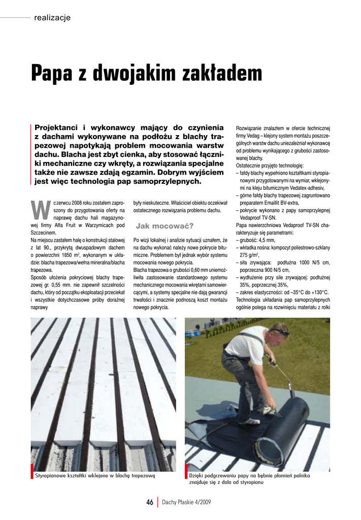 realizacje Papa z dwojakim zakładem Projektanci i wykonawcy mający do czynienia z dachami wykonywane na podłożu z blachy trapezowej napotykają problem mocowania warstw dachu. Blacha jest zbyt cienka, aby stosować łączniki mechaniczne czy wkręty, a rozwiązania specjalne także nie zawsze zdają egzamin. Dobrym wyjściem jest więc technologia pap samoprzylepnych. W czerwcu 2008 roku zostałem zaproszony do przygotowania oferty na naprawę dachu hali magazynowej firmy Alfa Fruit w Warzymicach pod Szczecinem. Na miejscu zastałem halę o konstrukcji stalowej z lat 90., przykrytą dwuspadowym dachem o powierzchni 1850 m2, wykonanym w układzie: blacha trapezowa/wełna mineralna/blacha trapezowa. Sposób ułożenia pokryciowej blachy trapezowej gr. 0,55 mm. nie zapewnił szczelności dachu, który od początku eksploatacji przeciekał i wszystkie dotychczasowe próby doraźnej naprawy były nieskuteczne. Właściciel obiektu oczekiwał ostatecznego rozwiązania problemu dachu. Jak mocować? Po wizji lokalnej i analizie sytuacji uznałem, że na dachu wykonać należy nowe pokrycie bitumiczne. Problemem był jednak wybór systemu mocowania nowego pokrycia. Blacha trapezowa o grubości 0,60 mm uniemożliwiła zastosowanie standardowego systemu mechanicznego mocowania wkrętami samowiercącymi, a systemy specjalne nie dają gwarancji trwałości i znacznie podnoszą koszt montażu nowego pokrycia. Styropianowe kształtki wklejone w blachę trapezową 46 Rozwiązanie znalazłem w ofercie technicznej firmy Vedag – klejony system montażu poszczególnych warstw dachu uniezależniał wykonawcę od problemu wynikającego z grubości zastosowanej blachy. Ostatecznie przyjęto technologię: – fałdy blachy wypełniono kształtkami styropianowymi przygotowanymi na wymiar, wklejonymi na kleju bitumicznym Vedatex-adhesiv, – górne fałdy blachy trapezowej zagruntowano preparatem Emaillit BV-extra, – pokrycie wykonano z papy samoprzylepnej Vedaproof TV-SN. Papa nawierzchniowa Vedaproof TV-SN charakteryzuje się parametrami: – grubość: 4,5 mm, – wkładka nośna: kompozyt poliestrowo-szklany 275 g/m2, – siła zrywająca: podłużna 1000 N/5 cm, poprzeczna 900 N/5 cm, – wydłużenie przy sile zrywającej: podłużnej 35%, poprzecznej 35%, – zakres elastyczności: od –35°C do +130°C. Technologia układania pap samoprzylepnych ogólnie polega na rozwinięciu materiału z rolki Dzięki podgrzewaniu papy na bębnie płomień palnika znajduje się z dala od styropianu Dachy Płaskie 4/2009 realizacje na przygotowanym podłożu, przymiarce, ewentualnym docięciu papy, zdjęciu folii zabezpieczającej od spodu i ostatecznym klejeniu z dociskiem do podłoża. W przypadku układania papy Vedaproof TV-SN w średniej i niskiej temperaturze otoczenia firma Vedag zaleca stosowanie bębna z blachy, na który nawija się papę, następnie płomieniem z palnika aktywuje się bitum i przykleja papę do styropianu. Zastosowanie bębna o średnicy 40–50 cm ma wykluczyć możliwość uszkodzenia styropianu płomieniem z palnika. Z uwagi na realizację robót dekarskich przy bardzo upalnej pogodzie (ponad 30°C), wykorzystaliśmy te warunki i przyklejaliśmy papę bezpośrednio do przygotowanego podłoża bez pomocy palnika. Do wykonania obróbki pasa nadrynnowego zastosowano papę podkładową samoprzylepną Vedatop SU, co było konsekwencją wyboru technologii klejenia „na zimno”. W niektórych miejscach dzięki upałowi papę można było układać bez używania palnika Dwojaki zakład Bardzo interesującym rozwiązaniem technicznym jest zakład papy Vedaproof TV-SN. Ma on szerokość 10 cm, z czego wewnętrzny pasek o szerokości 2 cm jest samoprzylepny, a część zewnętrzną szerokości 8 cm należy zgrzewać palnikiem. W praktyce 2-centymetrowy samoprzylepny pasek zapewnia wstępną szczelność pokrycia na etapie montażu, a na etapie zgrzewania reszty zakładu skutecznie zabezpiecza styropian przed płomieniem palnika. Na pasie nadrynnowym zastosowano papę samoprzylepną Vedatop SU Zakład papy ma 10 cm szerokości, z czego 2 cm to pasek samoprzylepny, a 8 cm zgrzewalny 47 Wstępne zaklejenie samoprzylepnego zakładu zabezpiecza styropian przed płomieniem palnika Dachy Płaskie 4/2009 realizacje Dach w 7 dni Pracownicy firmy wykonawczej docenili zalety technologii samoprzylepnej Realizację podzielono na następujące etapy: – przygotowanie podłoża, – montaż hydroizolacji, – wykonanie obróbek dekarskich wentylatorów i krawędzi dachu, – zgrzewanie zakładów. Zespół pięciu pracowników wszystkie prace wykonał w 7 dni, z czego najbardziej pracochłonne było przygotowanie podłoża – wklejanie kształtek styropianowych. Moi pracownicy bardzo szybko opanowali nową technologię uszczelniania dachu papą samoprzylepną i docenili jej „czystość”. Lekkie, ale bardzo mocne pokrycie bitumiczne w układzie klejonym nie tylko skutecznie uszczelniło, ale dodatkowo usztywniło bardzo wiotki dach blaszany. Dłuższa gwarancja Standardowo udzielam 3 lat gwarancji na wykonane przez moją firmę pokrycie dachu, jednak w przypadku tej realizacji udzieliłem 5 lat gwarancji pod warunkiem corocznych przeglądów dachu. Natomiast z informacji technicznych producenta papy VEDAG wynika, że nowa technologia modyfikacji bitumu HT (jaką zastosowano w papie Vedaproof TV-SN) w porównaniu ze standardową modyfikacją elastomerami znacznie wydłuża trwałość prawidłowo wykonanego pokrycia dachu. Bez obaw mogłem więc udzielić dłuższej gwarancji na wykonawstwo. Na koniec właściciel obiektu wyraził swoje zadowolenie z nowego pokrycia dachu, płacąc należność przed terminem. Odebrałem to jako dowód najwyższego uznania. Ułożona papa dodatkowo usztywniła wiotki dach Jacek Karwowski Usługi Dekarskie Szczecin www.dachykarwowski.pl Nowy, szczelny dach, zadowolony inwestor… 48 Dachy Płaskie 4/2009
