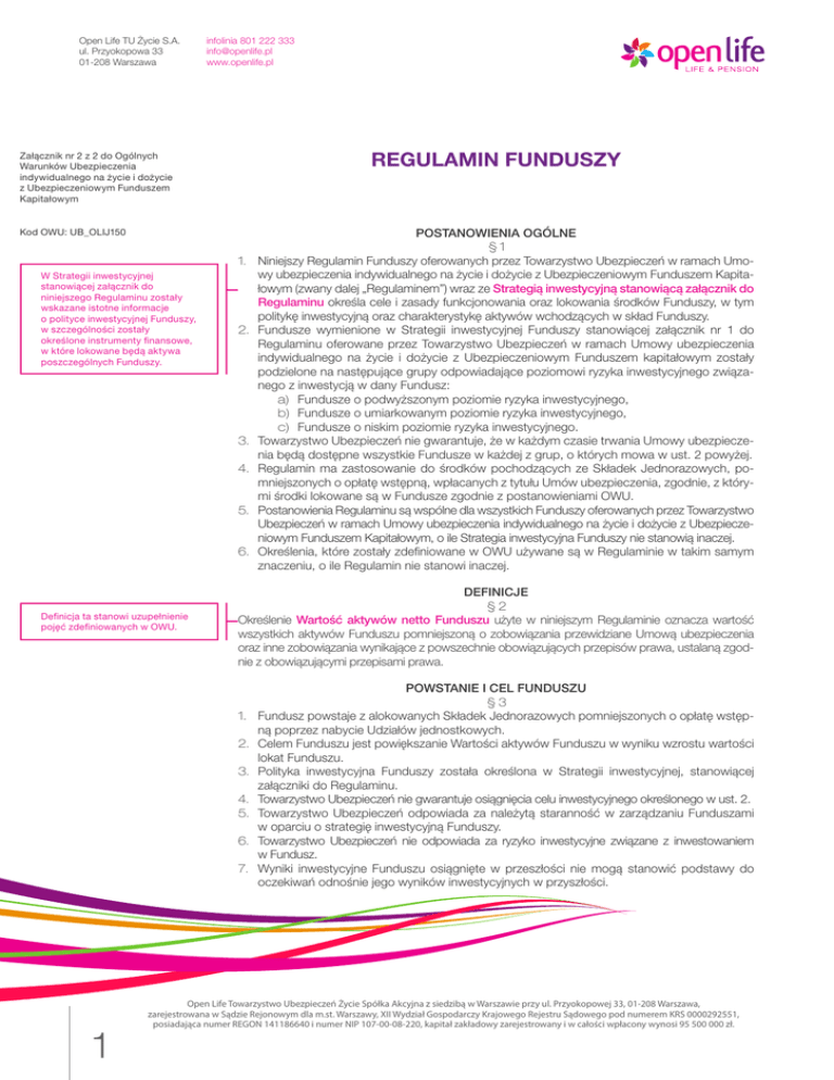 Open Life TU Życie S.A. ul. Przyokopowa 33 01-208 Warszawa infolinia 801 222 333 [email protected] www.openlife.pl REGULAMIN FUNDUSZY Załącznik nr 2 z 2 do Ogólnych Warunków Ubezpieczenia indywidualnego na życie i dożycie z Ubezpieczeniowym Funduszem Kapitałowym Kod OWU: UB_OLIJ150 1. W Strategii inwestycyjnej stanowiącej załącznik do niniejszego Regulaminu zostały wskazane istotne informacje o polityce inwestycyjnej Funduszy, w szczególności zostały określone instrumenty finansowe, w które lokowane będą aktywa poszczególnych Funduszy. 2. 3. 4. 5. 6. Definicja ta stanowi uzupełnienie pojęć zdefiniowanych w OWU. DEFINICJE § 2 Określenie Wartość aktywów netto Funduszu użyte w niniejszym Regulaminie oznacza wartość wszystkich aktywów Funduszu pomniejszoną o zobowiązania przewidziane Umową ubezpieczenia oraz inne zobowiązania wynikające z powszechnie obowiązujących przepisów prawa, ustalaną zgodnie z obowiązującymi przepisami prawa. 1. 2. 3. 4. 5. 6. 7. 1 POSTANOWIENIA OGÓLNE § 1 Niniejszy Regulamin Funduszy oferowanych przez Towarzystwo Ubezpieczeń w ramach Umowy ubezpieczenia indywidualnego na życie i dożycie z Ubezpieczeniowym Funduszem Kapitałowym (zwany dalej „Regulaminem”) wraz ze Strategią inwestycyjną stanowiącą załącznik do Regulaminu określa cele i zasady funkcjonowania oraz lokowania środków Funduszy, w tym politykę inwestycyjną oraz charakterystykę aktywów wchodzących w skład Funduszy. Fundusze wymienione w Strategii inwestycyjnej Funduszy stanowiącej załącznik nr 1 do Regulaminu oferowane przez Towarzystwo Ubezpieczeń w ramach Umowy ubezpieczenia indywidualnego na życie i dożycie z Ubezpieczeniowym Funduszem kapitałowym zostały podzielone na następujące grupy odpowiadające poziomowi ryzyka inwestycyjnego związanego z inwestycją w dany Fundusz: a) Fundusze o podwyższonym poziomie ryzyka inwestycyjnego, b) Fundusze o umiarkowanym poziomie ryzyka inwestycyjnego, c) Fundusze o niskim poziomie ryzyka inwestycyjnego. Towarzystwo Ubezpieczeń nie gwarantuje, że w każdym czasie trwania Umowy ubezpieczenia będą dostępne wszystkie Fundusze w każdej z grup, o których mowa w ust. 2 powyżej. Regulamin ma zastosowanie do środków pochodzących ze Składek Jednorazowych, pomniejszonych o opłatę wstępną, wpłacanych z tytułu Umów ubezpieczenia, zgodnie, z którymi środki lokowane są w Fundusze zgodnie z postanowieniami OWU. Postanowienia Regulaminu są wspólne dla wszystkich Funduszy oferowanych przez Towarzystwo Ubezpieczeń w ramach Umowy ubezpieczenia indywidualnego na życie i dożycie z Ubezpieczeniowym Funduszem Kapitałowym, o ile Strategia inwestycyjna Funduszy nie stanowią inaczej. Określenia, które zostały zdefiniowane w OWU używane są w Regulaminie w takim samym znaczeniu, o ile Regulamin nie stanowi inaczej. POWSTANIE I CEL FUNDUSZU § 3 Fundusz powstaje z alokowanych Składek Jednorazowych pomniejszonych o opłatę wstępną poprzez nabycie Udziałów jednostkowych. Celem Funduszu jest powiększanie Wartości aktywów Funduszu w wyniku wzrostu wartości lokat Funduszu. Polityka inwestycyjna Funduszy została określona w Strategii inwestycyjnej, stanowiącej załączniki do Regulaminu. Towarzystwo Ubezpieczeń nie gwarantuje osiągnięcia celu inwestycyjnego określonego w ust. 2. Towarzystwo Ubezpieczeń odpowiada za należytą staranność w zarządzaniu Funduszami w oparciu o strategię inwestycyjną Funduszy. Towarzystwo Ubezpieczeń nie odpowiada za ryzyko inwestycyjne związane z inwestowaniem w Fundusz. Wyniki inwestycyjne Funduszu osiągnięte w przeszłości nie mogą stanowić podstawy do oczekiwań odnośnie jego wyników inwestycyjnych w przyszłości. Open Life Towarzystwo Ubezpieczeń Życie Spółka Akcyjna z siedzibą w Warszawie przy ul. Przyokopowej 33, 01-208 Warszawa, zarejestrowana w Sądzie Rejonowym dla m.st. Warszawy, XII Wydział Gospodarczy Krajowego Rejestru Sądowego pod numerem KRS 0000292551, posiadająca numer REGON 141186640 i numer NIP 107-00-08-220, kapitał zakładowy zarejestrowany i w całości wpłacony wynosi 95 500 000 zł. Open Life TU Życie S.A. ul. Przyokopowa 33 01-208 Warszawa 1. 2. 3. 4. 1. 2. 3. 4. 5. 6. 7. infolinia 801 222 333 [email protected] www.openlife.pl RYZYKA INWESTYCYJNE ZWIĄZANE Z INWESTYCJĄ W FUNDUSZE § 4 Gromadzenie i inwestowanie Składki Jednorazowej pomniejszonej o opłatę wstępną w ramach Funduszy oferowanych przez Towarzystwo Ubezpieczeń w ramach Umowy ubezpieczenia wiąże się z ryzykiem inwestycyjnym, tj.: 1) ryzykiem rynkowym, przez które rozumie się ryzyko utraty części Składki Jednorazowej, gdyż w Okresie ubezpieczenia Wartość udziału jednostkowego może ulegać znacznym wahaniom ze względu na zmiany wartości instrumentów finansowych wchodzących w skład aktywów Funduszu; 2) ryzykiem ograniczonej płynności, które jest związane z brakiem możliwości dokonywania częściowych wypłat Wartości wykupu w trakcie trwania ochrony ubezpieczeniowej lub realizacji przeniesienia środków w przypadku gdy Fundusz zawiesił nabywanie lub umarzanie Udziałów jednostkowych w przypadkach, o których mowa w § 6 ust. 6 i w § 7 ust. 5; 3) ryzykiem podatkowym, przez które należy rozumieć zmianę obowiązujących przepisów prawa lub ich wykładni skutkującą koniecznością pobrania i odprowadzenia przez Towarzystwo Ubezpieczeń jakiejkolwiek kwoty na poczet zobowiązań podatkowych wpływających na kwotę należnego Świadczenia z tytułu Umowy ubezpieczenia. W ubezpieczeniu na życie i dożycie z ubezpieczeniowym funduszem kapitałowym Ubezpieczający ponosi ryzyko inwestycyjne związane z inwestowaniem w ramach Funduszu. Ryzyko rynkowe można monitorować sprawdzając Wartość udziału jednostkowego. Informację o Wartości udziału jednostkowego oraz przewidziane przepisami prawa sprawozdania Funduszu dostępne są na stronie internetowej Towarzystwa Ubezpieczeń oraz w siedzibie Towarz