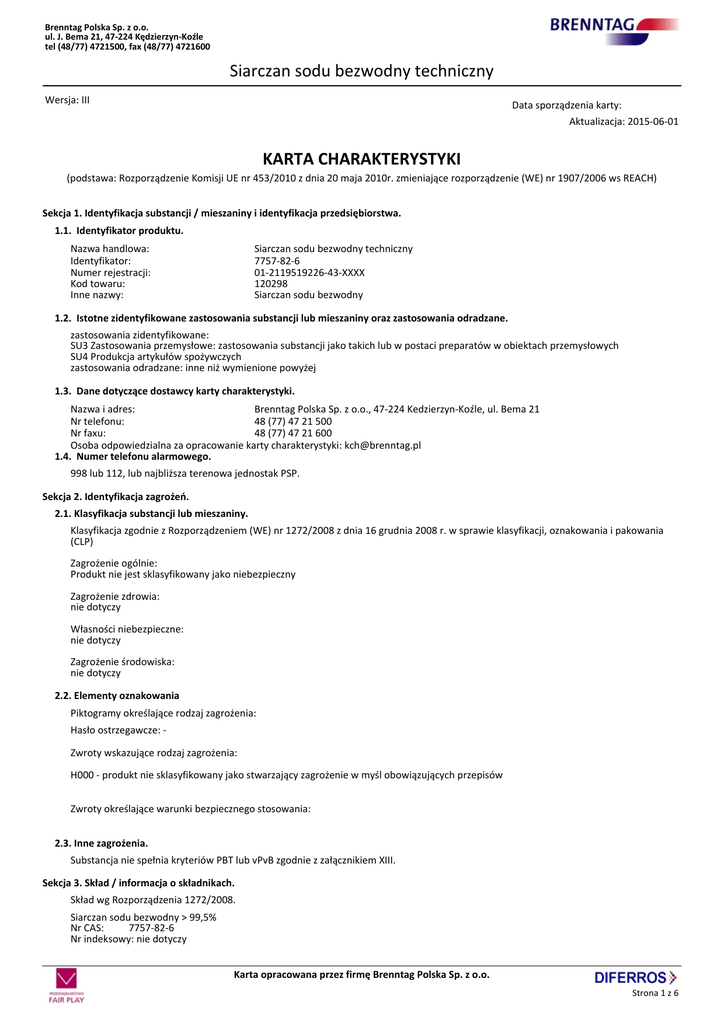 Brenntag Polska Sp. z o.o. ul. J. Bema 21, 47-224 Kędzierzyn-Koźle tel (48/77) 4721500, fax (48/77) 4721600 Siarczan sodu bezwodny techniczny Wersja: III Data sporządzenia karty: __________ Aktualizacja: 2015-06-01 KARTA CHARAKTERYSTYKI (podstawa: Rozporządzenie Komisji UE nr 453/2010 z dnia 20 maja 2010r. zmieniające rozporządzenie (WE) nr 1907/2006 ws REACH) Sekcja 1. Identyfikacja substancji / mieszaniny i identyfikacja przedsiębiorstwa. 1.1. Identyfikator produktu. Nazwa handlowa: Identyfikator: Numer rejestracji: Kod towaru: Inne nazwy: Siarczan sodu bezwodny techniczny 7757-82-6 01-2119519226-43-XXXX 120298 Siarczan sodu bezwodny 1.2. Istotne zidentyfikowane zastosowania substancji lub mieszaniny oraz zastosowania odradzane. zastosowania zidentyfikowane: SU3 Zastosowania przemysłowe: zastosowania substancji jako takich lub w postaci preparatów w obiektach przemysłowych SU4 Produkcja artykułów spożywczych zastosowania odradzane: inne niż wymienione powyżej 1.3. Dane dotyczące dostawcy karty charakterystyki. Nazwa i adres: Brenntag Polska Sp. z o.o., 47-224 Kedzierzyn-Koźle, ul. Bema 21 Nr telefonu: 48 (77) 47 21 500 Nr faxu: 48 (77) 47 21 600 Osoba odpowiedzialna za opracowanie karty charakterystyki: [email protected] 1.4. Numer telefonu alarmowego. 998 lub 112, lub najbliższa terenowa jednostak PSP. Sekcja 2. Identyfikacja zagrożeń. 2.1. Klasyfikacja substancji lub mieszaniny. Klasyfikacja zgodnie z Rozporządzeniem (WE) nr 1272/2008 z dnia 16 grudnia 2008 r. w sprawie klasyfikacji, oznakowania i pakowania (CLP) Zagrożenie ogólnie: Produkt nie jest sklasyfikowany jako niebezpieczny Zagrożenie zdrowia: nie dotyczy Własności niebezpieczne: nie dotyczy Zagrożenie środowiska: nie dotyczy 2.2. Elementy oznakowania Piktogramy określające rodzaj zagrożenia: Hasło ostrzegawcze: Zwroty wskazujące rodzaj zagrożenia: H000 - produkt nie sklasyfikowany jako stwarzający zagrożenie w myśl obowiązujących przepisów Zwroty określające warunki bezpiecznego stosowania: 2.3. Inne zagrożenia. Substancja nie spełnia kryteriów PBT lub vPvB zgodnie z załącznikiem XIII. Sekcja 3. Skład / informacja o składnikach. Skład wg Rozporządzenia 1272/2008. Siarczan sodu bezwodny > 99,5% Nr CAS: 7757-82-6 Nr indeksowy: nie dotyczy Karta opracowana przez firmę Brenntag Polska Sp. z o.o. Strona 1 z 6 Brenntag Polska Sp. z o.o. ul. J. Bema 21, 47-224 Kędzierzyn-Koźle tel (48/77) 4721500, fax (48/77) 4721600 Siarczan sodu bezwodny techniczny Nr WE: 231-820-9 Sekcja 4. Środki pierwszej pomocy. 4.1. Opis środków pierwszej pomocy. Wdychanie: W razie narażenia inhalacyjnego wyprowadzić poszkodowanego na świeże powietrze, zapewnić spokój. Kontakt ze skórą: W razie kontaktu ze skórą zmyć wodą z mydłem. Kontakt z oczami: W razie dostania się do oczu natychmiast płukać dużą ilością wody przez ok. 10 minut. Usunąć soczewki kontaktowe (jeśli są noszone). Skontaktować się z lekarzem. Spożycie: W razie połnięcia podać do wypicia dużą ilosć wody. Przy spożyciu większych ilości skontaktować się z lekarzem. 4.2. Najważniejsze ostre i opóźnione objawy oraz skutki narażenia. Produkt może powodować podrażnienie skóry, spojówki oka (łzawienie i pieczenie) oraz podrażnienie dróg oddechowych. W razie spożycia: bóle brzucha, biegunka, mdłości, wymioty 4.3. Wskazania dotyczące wszelkiej natychmiastowej pomocy lekarskiej i szczególnego postępowania z poszkodowanym. brak dostępnych danych Sekcja 5. Postępowanie w przypadku pożaru. 5.1. Środki gaśnicze. Pożary w obecności produktu gasić środkami odpowiednimi dla palących się materiałów. 5.2. Szczególne zagrożenia związane z substancją lub mieszaniną. Produkt niepalny. W wyniku rozkladu wydzielają się tlenki sodu, tlenki siarki 5.3. Informacje dla straży pożarnej. Stosować środki ochrony indywidualnej w zależności od palacych się materiałów. Sekcja 6. Postępowanie w przypadku niezamierzonego uwolnienia do środowiska. 6.1. Indywidualne środki ostrożności, wyposażenie ochronne i procedury w sytuacjach awaryjnych. Stosować środki ochrony osobistej (gdy tworzą się pyły użyć respiratora typu P1, google ochronne/szczelne okulary ochronne). 6.2. Środki ostrożności w zakresie ochrony środowiska. Zapobiec rozprzestrzenianiu się produktu, zabezpieczyć studzienki ściekowe 6.3. Metody i materiały zapobiegające rozprzestrzenianiu się skażenia i służące do usuwania skażenia. Rozsypany produkt zebrać mechanicznie do zamykanego pojemnika i przekazać do zniszczenia. Pozostałości spłukac dużą ilością goracej wody. Popłuczyny zebrać i usunąc jako odpad niebezpieczny. 6.4. Odniesienia do innych sekcji. Usuwać zgodnie z zaleceniami przedstawionymi w sekcji 13 Sekcja 7. Postępowanie z substancjami i mieszaninami oraz ich magazynowanie. 7.1. Środki ostrożności dotyczące bezpiecznego postępowania. Unikać tworzenia pyłu. Chronić przed rozpuszczalnikami. 7.2. Warunki bezpiecznego magazynowania, łącznie z informacjami dotyczącymi wszelkich wzajemnych niezgodności. Przechowywać w suchych i przewiewnych pomieszczeniach. Chronić przed wilgocią - produkt zwiększa swoją objętość na skutek powstania dekahydratu oraz ulega zbryleniu. Nie przechowywać w opakowaniach z aluminium. 7.3. Szczególne zastosowania końcowe. brak dostępnych danych Sekcja 8. Kontrola narażenia / środki ochrony indywidualnej. 8.1. Parametry dotyczące kontroli. NDS, NDSCh - nie ustalono (wg Rozporządzenia MIPS z dn. 6 czerwca 2014, Dz.U. 2014, poz.817) Karta opracowana przez firmę Brenntag Polska Sp. z o.o. Strona 2 z 6 Brenntag Polska Sp. z o.o. ul. J. Bema 21, 47-224 Kędzierzyn-Koźle tel (48/77) 4721500, fax (48/77) 4721600 Siarczan sodu bezwodny techniczny Zalecenia dotyczące procedury monitoringu zawartości składników niebezpiecznych w powietrzu – metodyka pomiarów: --Rozporządzenie Ministra Zdrowia z dnia 2 luty 2011 r. w sprawie badań