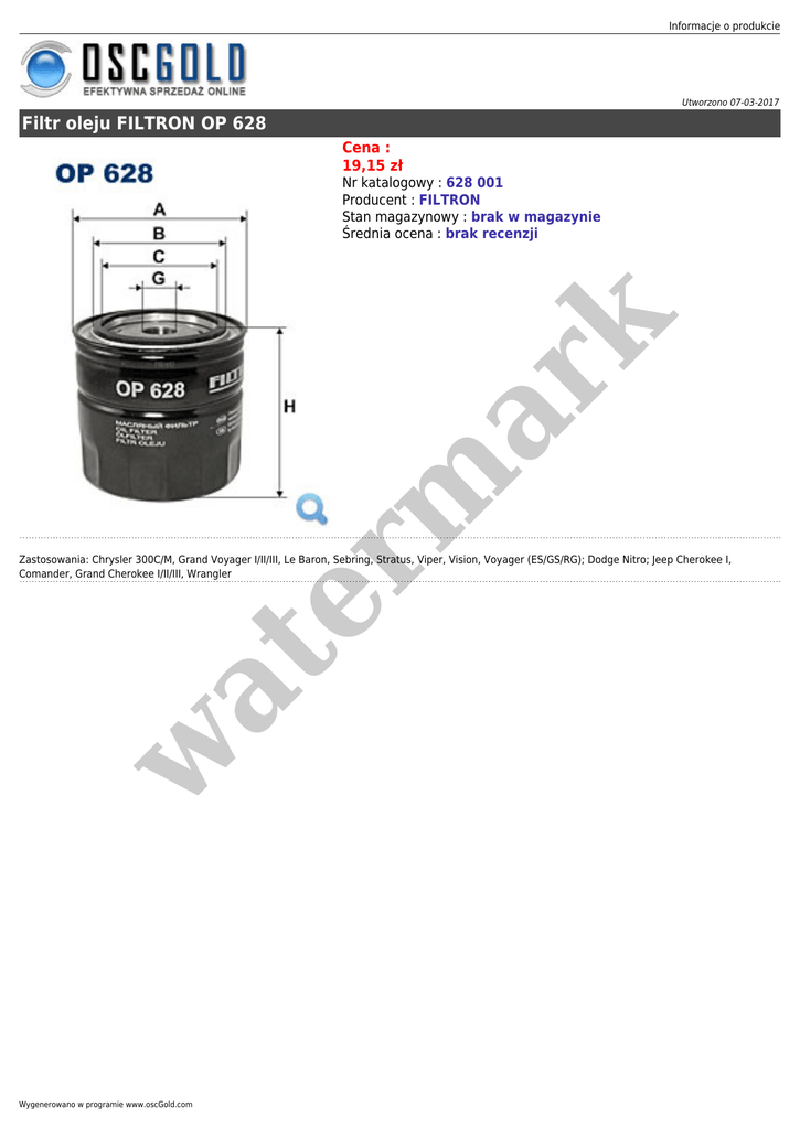 Informacje o produkcie Utworzono 07-03-2017 Filtr oleju FILTRON OP 628 Cena : 19,15 zł er m ar k Nr katalogowy : 628 001 Producent : FILTRON Stan magazynowy : brak w magazynie Średnia ocena : brak recenzji w at Zastosowania: Chrysler 300C/M, Grand Voyager I/II/III, Le Baron, Sebring, Stratus, Viper, Vision, Voyager (ES/GS/RG); Dodge Nitro; Jeep Cherokee I, Comander, Grand Cherokee I/II/III, Wrangler Wygenerowano w programie www.oscGold.com
