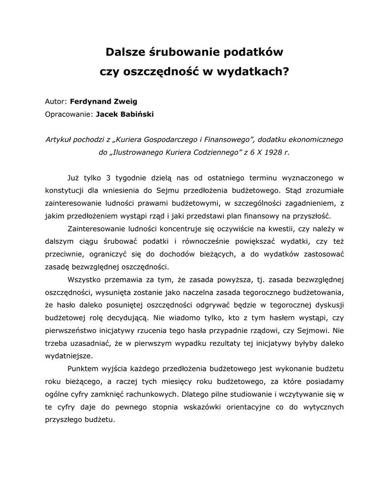 Dalsze śrubowanie podatków czy oszczędność w wydatkach? Autor: Ferdynand Zweig Opracowanie: Jacek Babiński Artykuł pochodzi z „Kuriera Gospodarczego i Finansowego”, dodatku ekonomicznego do „Ilustrowanego Kuriera Codziennego” z 6 X 1928 r. Już tylko 3 tygodnie dzielą nas od ostatniego terminu wyznaczonego w konstytucji dla wniesienia do Sejmu przedłożenia budżetowego. Stąd zrozumiałe zainteresowanie ludności prawami budżetowymi, w szczególności zagadnieniem, z jakim przedłożeniem wystąpi rząd i jaki przedstawi plan finansowy na przyszłość. Zainteresowanie ludności koncentruje się oczywiście na kwestii, czy należy w dalszym ciągu śrubować podatki i równocześnie powiększać wydatki, czy też przeciwnie, ograniczyć się do dochodów bieżących, a do wydatków zastosować zasadę bezwzględnej oszczędności. Wszystko przemawia za tym, że zasada powyższa, tj. zasada bezwzględnej oszczędności, wysunięta zostanie jako naczelna zasada tegorocznego budżetowania, że hasło daleko posuniętej oszczędności odgrywać będzie w tegorocznej dyskusji budżetowej rolę decydującą. Nie wiadomo tylko, kto z tym hasłem wystąpi, czy pierwszeństwo inicjatywy rzucenia tego hasła przypadnie rządowi, czy Sejmowi. Nie trzeba uzasadniać, że w pierwszym wypadku rezultaty tej inicjatywy byłyby daleko wydatniejsze. Punktem wyjścia każdego przedłożenia budżetowego jest wykonanie budżetu roku bieżącego, a raczej tych miesięcy roku budżetowego, za które posiadamy ogólne cyfry zamknięć rachunkowych. Dlatego pilne studiowanie i wczytywanie się w te cyfry daje do pewnego stopnia wskazówki orientacyjne co do wytycznych przyszłego budżetu. Posiadamy już obliczenia w przedmiocie wykonania tegorocznego budżetu za okres kwiecień – sierpień br., czyli za pierwszych pięć miesięcy bieżącego roku skarbowego (patrz „Wiadomości Statystyczne” nr 18 z 20 września 1928 roku.). Cóż te cyfry wykazują? Ustalmy dla orientacji pewne zasadnicze grupy faktów: I. Przede wszystkim należy stwierdzić, że dochody w roku bieżącym utrzymują się na poziomie znacznie wyższym, niż w roku ubiegłym. W pierwszych pięciu miesiącach uzyskaliśmy w dochodach 1.157 mln złotych czyli o 147 mln zł więcej niż w tym samym czasie roku ubiegłego. W stosunku do budżetu uzyskaliśmy dochody przekraczające znacznie normę, a mianowicie w ciągu pięciu miesięcy 43.5 proc całorocznego budżetu (gdy norma odpowiada 41.6 proc.), a w cyfrach bezwzględnych okrągło o 50 mln zł więcej, niż preliminowaliśmy. II. Wydatki wzrosły w tempie jeszcze wyższym, niż dochody. Wynosiły one w ciągu pięciu miesięcy 1104 mln zł, a o 237 mln zł więcej, niż w tym samym czasie roku ubiegłego. W stosunku do budżetu wydatki znacznie przekroczyły normę budżetową, dały bowiem w ciągu pięciu miesięcy 43,7 proc budżetu (norma wynosi 41,6 proc.), co nastąpiło częściowo także z powodu wypłaty 15-procentowego dodatku urzędniczego. III. Nadwyżka kasowa wynosiła w ciągu pięciu miesięcy br. — 50.5 mln zł, gdy w tym samym czasie ubiegłego roku przedstawiała kwotę 130 mln zł. Nadwyżka ta także i w ciągu poszczególnych miesięcy tego roku wykazuje tendencję kurczenia się. Wynosiła ona w maju 13.7, w czerwcu 10.4, w lipcu 9.9, w sierpniu 7.2 mln zł. IV. O ile chodzi o strukturę dochodów budżetowych, to przede wszystkim należy stwierdzić dalszy wybitny rozwój podatków bezpośrednich. Uzyskały one w ciągu 5-ciu miesięcy tego roku dalszy rekord, dając 55.3 proc. całorocznego budżetu. W stosunku do tego samego czasu roku ubiegłego dały one nadwyżkę wpływów aż o 78 mln zł. W dziale podatków bezpośrednich wybitny rozwój dochodów wykazuje podatek przemysłowy i dochodowy. Jeśli wpływy z podatku przemysłowego utrzymują się nadal na tym poziomie, który osiągnęły w ciągu kwietnia do lipca br., to dadzą one 333 mln zł. gdy w budżecie preliminowane są tylko kwotą 281 mln zł. Podatek dochodowy dałby w całym roku 228 mln wobec preliminowanej kwoty 170 mln zł. Natomiast nie dopisał podatek gruntowy. W okresie kwiecień-lipiec br. dał on tylko 11 mln zł, wobec preliminowanej kwoty całorocznej 63 mln zł. Podatek od nieruchomości również zawiódł oczekiwania, pozostając na poziomie niższym od preliminarza. Natomiast odsetki zwłoki, kary i grzywny podatkowe figurują nadmiernie wysoką kwotą 12,4 mln w ciągu pięciu miesięcy. Podatki pośrednie dały bardzo dobre rezultaty, zwłaszcza w dziale podatku cukrowego. Wpływy celne po waloryzacji ceł i wobec silnie powiększającego się importu, wykazały dalszy rekord. Natomiast podatek majątkowy zawiódł zupełnie, dając w ciągu pięciu miesięcy tylko 18.1 proc. całorocznego budżetu. V. O ile chodzi o monopole i przedsiębiorstwa, to dochody z nich nie dosięgły ogólnej linii rozwoju naszych dochodów budżetowych. Monopole dały wprawdzie w ciągu 5 miesięcy 352 mln zł, tj. do 57 mln więcej niż w tym samym czasie roku ubiegłego, jednakże w stosunku do całorocznego budżetu stanowi to tylko 40,3 proc., tj. pozostały poniżej normy. Natomiast dochody z przedsiębiorstw państwowych spadły bardzo silnie. Wpłaty przedsiębiorstw są minimalne, o wiele niższe niż w roku ubiegłym. W ciągu pięciu miesięcy wpłynęło do kas skarbowych z przedsiębiorstw tylko 36 mln zł, tj. o 55 mln mniej niż w tym samym czasie roku ubiegłego. Pozostaje to jednakże w związku nie z niższą rentownością przedsiębiorstw, ale z dużymi pracami inwestycyjnymi, które przedsiębiorstwa, a zwłaszcza koleje, prowadzą własnymi środkami drogą umniejszenia wpłat do skarbu państwa. — Jeśli powyższe uwzględnimy, to dojdziemy do przekonania, że rzeczywiste dochody skarbowe w ciągu 5 miesięcy br. były wyższe od wykazanych w zamknięciach rachunkowych. Gdyby bowiem państwo budżetowało czyste nadwyżki przedsiębiorstw państwowy