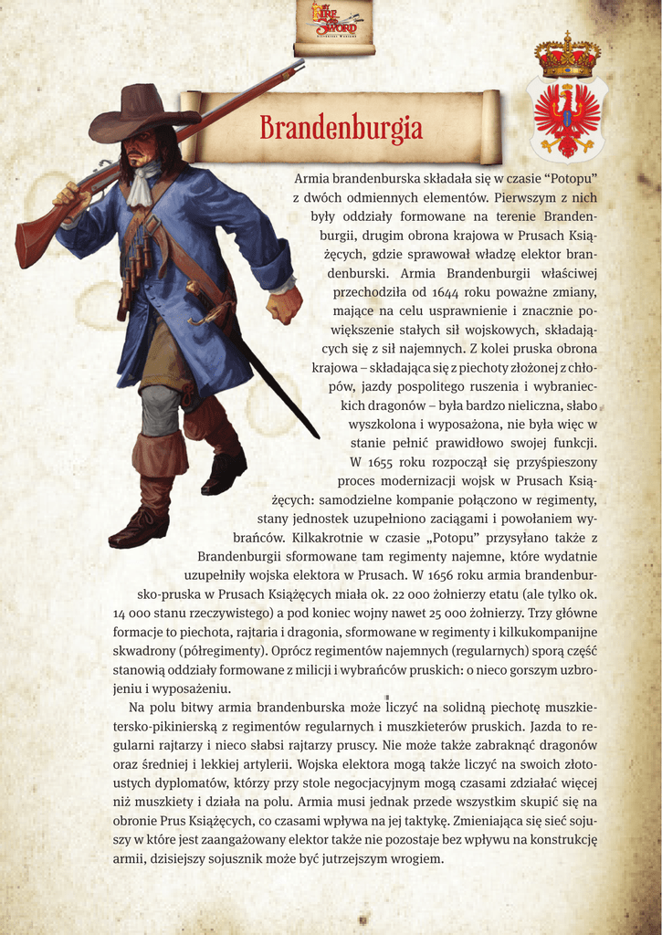 Brandenburgia Armia brandenburska składała się w czasie “Potopu” z dwóch odmiennych elementów. Pierwszym z nich były oddziały formowane na terenie Brandenburgii, drugim obrona krajowa w Prusach Książęcych, gdzie sprawował władzę elektor brandenburski. Armia Brandenburgii właściwej przechodziła od 1644 roku poważne zmiany, mające na celu usprawnienie i znacznie powiększenie stałych sił wojskowych, składających się z sił najemnych. Z kolei pruska obrona krajowa – składająca się z piechoty złożonej z chłopów, jazdy pospolitego ruszenia i wybranieckich dragonów – była bardzo nieliczna, słabo wyszkolona i wyposażona, nie była więc w stanie pełnić prawidłowo swojej funkcji. W 1655 roku rozpoczął się przyśpieszony proces modernizacji wojsk w Prusach Książęcych: samodzielne kompanie połączono w regimenty, stany jednostek uzupełniono zaciągami i powołaniem wybrańców. Kilkakrotnie w czasie „Potopu” przysyłano także z Brandenburgii sformowane tam regimenty najemne, które wydatnie uzupełniły wojska elektora w Prusach. W 1656 roku armia brandenbursko-pruska w Prusach Książęcych miała ok. 22 000 żołnierzy etatu (ale tylko ok. 14 000 stanu rzeczywistego) a pod koniec wojny nawet 25 000 żołnierzy. Trzy główne formacje to piechota, rajtaria i dragonia, sformowane w regimenty i kilkukompanijne skwadrony (półregimenty). Oprócz regimentów najemnych (regularnych) sporą część stanowią oddziały formowane z milicji i wybrańców pruskich: o nieco gorszym uzbrojeniu i wyposażeniu. Na polu bitwy armia brandenburska może liczyć na solidną piechotę muszkietersko-pikinierską z regimentów regularnych i muszkieterów pruskich. Jazda to regularni rajtarzy i nieco słabsi rajtarzy pruscy. Nie może także zabraknąć dragonów oraz średniej i lekkiej artylerii. Wojska elektora mogą także liczyć na swoich złotoustych dyplomatów, którzy przy stole negocjacyjnym mogą czasami zdziałać więcej niż muszkiety i działa na polu. Armia musi jednak przede wszystkim skupić się na obronie Prus Książęcych, co czasami wpływa na jej taktykę. Zmieniająca się sieć sojuszy w które jest zaangażowany elektor także nie pozostaje bez wpływu na konstrukcję armii, dzisiejszy sojusznik może być jutrzejszym wrogiem.