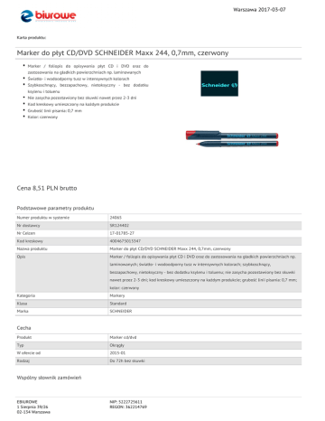 Warszawa 2017-03-07 Karta produktu: Marker do płyt CD/DVD SCHNEIDER Maxx 244, 0,7mm, czerwony Marker / foliopis do opisywania płyt CD i DVD oraz do zastosowania na gładkich powierzchniach np. laminowanych Światło- i wodoodporny tusz w intensywnych kolorach Szybkoschnący, bezzapachowy, nietoksyczny - bez dodatku ksylenu i toluenu Nie zasycha pozostawiony bez skuwki nawet przez 2-3 dni Kod kreskowy umieszczony na każdym produkcie Grubość linii pisania: 0,7 mm Kolor: czerwony Cena 8,51 PLN brutto Podstawowe parametry produktu Numer produktu w systemie 24065 Nr dostawcy SR124402 Nr Celcen 17-01785-27 Kod kreskowy 4004675013347 Nazwa produktu Marker do płyt CD/DVD SCHNEIDER Maxx 244, 0,7mm, czerwony Opis Marker / foliopis do opisywania płyt CD i DVD oraz do zastosowania na gładkich powierzchniach np. laminowanych; światło- i wodoodporny tusz w intensywnych kolorach; szybkoschnący, bezzapachowy, nietoksyczny - bez dodatku ksylenu i toluenu; nie zasycha pozostawiony bez skuwki nawet przez 2-3 dni; kod kreskowy umieszczony na każdym produkcie; grubość linii pisania: 0,7 mm; kolor: czerwony Kategoria Markery Klasa Standard Marka SCHNEIDER Cecha Produkt Marker cd/dvd Typ Okrągły W ofercie od 2015-01 Rodzaj Do 72h bez skuwki Wspólny słownik zamówień EBIUROWE 1 Sierpnia 39/26 02-134 Warszawa NIP: 5222725611 REGON: 362214769 Warszawa 2017-03-07 Karta katalogowa produktu cd. Marker do płyt CD/DVD SCHNEIDER Maxx 244, 0,7mm, czerwony CPV 30192125-3 Pisaki Wymiary Końcówka (mm) 0,7 Grubość linii (mm) 0,7 Certyfikaty Nowy produkt w ofercie Standard Hit Standard Kolor Kolor Czerwony Serdecznie zapraszamy do współpracy EBIUROWE zespół. EBIUROWE 1 Sierpnia 39/26 02-134 Warszawa NIP: 5222725611 REGON: 362214769
