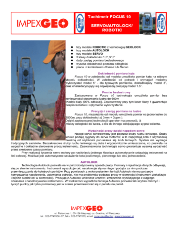 ● ● ● ● ● ● ● trzy modele ROBOTIC z technologią GEOLOCK trzy modele AUTOLOCK trzy modele SERVO 3 klasy dokładności 1,5”,3”,5” duży zasięg pomiaru bezlustrowego wysoka dokładność pomiaru odległości praca z kontrolerem Nomad lub Recon Dokładność pomiaru kąta Focus 10 w zależności od modelu umożliwia pomiar kąta na różnym stopniu dokładności. W zależności od potrzeb i wymagań możemy wykorzystać model 5” - dla typowych pomiarów, dokładniejszy model 3”, oraz charakteryzujący się największą precyzją model 1.5”. Pomiar bezlustrowy Zastosowana w Focus 10 technologia umożliwia pomiar bez konieczności stosowania lustra do 600m [Kodak biały (90% odbicia)]. Zastosowany przy tym laser klasy 1 gwarantuje bezpieczeństwo i optymalne wykorzystanie. Precyzja i zasięg pomiaru na lustro Focus 10, niezależnie od modelu umożliwia pomiar na jedno lustro do 2500m, przy dokładności ±( 3mm + 3ppm ). Dzięki zastosowanej technologii operator ma pewność, iż mierzy odległość do lustra, a nie do innego odbijającego sygnał obiektu. Wydajność pracy dzięki napędom servo Napęd servo kontrolowany jest poprzez śruby ruchu leniwego. Śruby leniwe podają sygnały do servo motorów, a te napędzają koła z szybkością zależną od szybkości poruszania się śrub leniwych. System nie wymaga tradycyjnych zacisków. Bezzakresowe śruby ruchu leniwego są duże i ergonomicznie umieszczone, co pozwala na wygodne i dokładne sterowanie pracą instrumentu. Zaawansowana technologia servo gwarantuje wysoką wydajność przez skrócenie czasu pomiaru. Przy realizacji tyczenia servo motory po naciśnięciu jednego klawisza automatycznie ustawiają instrument na linii celowej. Możliwe jest automatyczne ustawienie koła poziomego, pionowego lub obu jednocześnie. AUTOLOCK Technologia Autolock pozwala na w pół zrobotyzowany sposób pracy. Pomiary i rejestracja danych odbywają się po stronie instrumentu. Instrument wyszukuje cel, nacelowuje się na niego i podąża za nim podczas przemieszczania do kolejnych punktów. Przy pomiarach z wykorzystaniem funkcji Autolock nie ma potrzeby korygowania nacelowania, ustawiania ostrości, nie ma problemów podczas pracy w ciemności (instrument zlokalizuje i będzie śledził cel w ciemności). Pracując z Autolock unikniesz urazów i zmęczenia wynikającego z ciągłego obracania i nacelowywania instrumentu. W wiekszości wypadków funkcja Autolock pozwala tak szybko mierzyć i tyczyć punkty jak tylko pomiarowy jest w stanie przemieszczać się z punktu na punkt. ROBOTIC Wersja Robotic oferuje te same zalety, co wersja Autolock, a dodatkowo pozwala na bardziej efektywne przemieszczanie przy tyczeniu i/lub pracę przy udziale jednej osoby mniej. Pomiar zrobotyzowany to nie tylko redukcja zatrudnienia i wzrost wydajności, to również zwiększona dokładność pomiarów i możliwość inicjowania, kontroli i rejestracji danych na mierzonym punkcie gdzie wszelkie błędy i odchyłki mogą być łatwo zidentyfikowane. GEOLOCK Technologia Geolock pozwala na bardziej wydajne szukanie lustra przez instrument w wersji Robotic, dzięki wykorzystaniu odbiornika GPS w kontrolerze podczas pomiaru. Instrument szybciej namierzy lustro dzięki znanej pozycji GPS kontrolera. Jest to kolejny krok na drodze zwiększania wydajności i automatyzacji pomiaru. Zintegrowane pomiary Tachimetr Focus 10 wyposażony jest w klawiaturę Focus CU. Alfanumeryczna klawiatura wraz z dużym wyświetlaczem pozwala na łatwą i szybką obsługę instrumentu. Dodatkowo, można sterować pracą instrumentu za pomocą kontrolera RECON (servo,autolock,robotic) lub kontrolera NOMAD (servo,autolock,robotic), z programem SP Field Surveyor 2.0. Kontrolery można wykorzystać jako rejestrator GPS. Czyni to z urządzeń pomiarowych Spectry Precision szeroko rozbudowany system. Źródło światła laserowego Dioda laserowa o długości fali 870nm, Laser klasy 1 Rozbieżność wiązki Pozioma: 0.4 mrad (2cm/50m) Pionowa: 0.8 mrad (4cm/50m) Ogólne Poprawka atmosferyczna -60 do 195 ppm ciągła Poziomowanie Libella pudełkowa w spodarce: 8'/2mm Libella elektroniczna dwuosiowa wyświetlana na wyświetlaczu: rozdzielczość 6" (20cc) Zaciski i śruby ruchu leniwego napędy servo, niekończący się tryb dokładnego pozycjonowania Centrowanie System centrowania: 3-pin Pionownik optyczny: Pionownik optyczny w spodarce Powiększenie: 2.4 x Luneta Powiększenie: 26 x (30 x opcjonalnie) Średnica: 40 mm Minimalna ogniskowa: 1.7 m do nieskończoności Pole widzenia: 2.6m / 100m Podświetlenie krzyża nitek: zmienne (15 poziomów) Temperatura pracy -20°C do +50°C Zasilanie Bateria wewnętrzna: Ładowalna bateria NiMH, 12V, 1.8 Ah, Bateria zewnętrzna: Ładowalna bateria NiMH, 12V, 3.8-11.4 Ah, Waga Instrument z kontrolerem Focus CU: 6.4 kg Spodarka: 0.7 kg Bateria wewnętrzna: 0.4 kg Dane szczegółowe Pomiar kąta Dokładność [Odchylenie standardowe (DIN 18723)] Model 1.5” 1.5” Model 3” 3” Model 5” 5” Minimalny odczyt poziomy i pionowy Pomiar standardowy: 1" (1cc) Kompensator automatyczny Dwuosiowy ±6' Pomiar odległości Dokładność na lustro Pomiar standardowy: ±( 3mm + 3ppm ) pomiar bezlustrowy Pomiar standardowy: ±( 3mm + 3ppm ) Minimalny zasięg na lustro , bez lustra, na folię 2m Czas pomiaru Tryb z lustrem Pomiar standardowy: 3s Pomiar normalny: 3s Tryb bezlustrowy Pomiar standardowy: 3-7s Pomiar normalny: 3-7s Zasięg (standardowe warunki) Pomiar na lustro 1 lustro 2500m 3 lustra 3500m Pomiar bez lustra Kodak biały (90% odbicia): 600m Robotic Zasięg do 1200m Precyzja wskaźnika na 200m <2mm Pomiar kąta do 1”(1cc) Śledzenie 2”(5cc) Pole wyszukiwania lustra 400 gradów lub zdefiniowane Czas wyszukiwania lustra 2-10 sekund