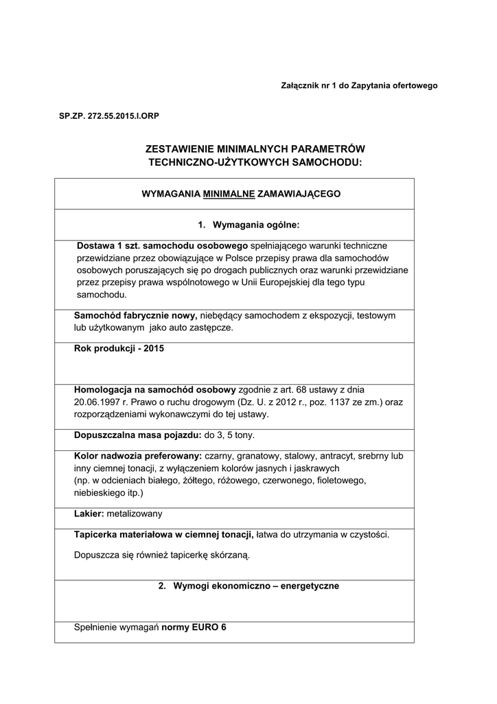 Załącznik nr 1 do Zapytania ofertowego SP.ZP. 272.55.2015.I.ORP ZESTAWIENIE MINIMALNYCH PARAMETRÓW TECHNICZNO-UŻYTKOWYCH SAMOCHODU: WYMAGANIA MINIMALNE ZAMAWIAJĄCEGO 1. Wymagania ogólne: Dostawa 1 szt. samochodu osobowego spełniającego warunki techniczne przewidziane przez obowiązujące w Polsce przepisy prawa dla samochodów osobowych poruszających się po drogach publicznych oraz warunki przewidziane przez przepisy prawa wspólnotowego w Unii Europejskiej dla tego typu samochodu. Samochód fabrycznie nowy, niebędący samochodem z ekspozycji, testowym lub użytkowanym jako auto zastępcze. Rok produkcji - 2015 Homologacja na samochód osobowy zgodnie z art. 68 ustawy z dnia 20.06.1997 r. Prawo o ruchu drogowym (Dz. U. z 2012 r., poz. 1137 ze zm.) oraz rozporządzeniami wykonawczymi do tej ustawy. Dopuszczalna masa pojazdu: do 3, 5 tony. Kolor nadwozia preferowany: czarny, granatowy, stalowy, antracyt, srebrny lub inny ciemnej tonacji, z wyłączeniem kolorów jasnych i jaskrawych (np. w odcieniach białego, żółtego, różowego, czerwonego, fioletowego, niebieskiego itp.) Lakier: metalizowany Tapicerka materiałowa w ciemnej tonacji, łatwa do utrzymania w czystości. Dopuszcza się również tapicerkę skórzaną. 2. Wymogi ekonomiczno – energetyczne Spełnienie wymagań normy EURO 6 3. Silnik Silnik benzynowy turbodoładowany z bezpośrednim wtryskiem paliwa Paliwo: benzyna bezołowiowa Klasa silnika w przedziale: od 1,4l do 1,6l Moc silnika: 150 kW Pojemność zbiornika paliwa: 60 litrów System start&stop 4. Napęd Skrzynia biegów: manualna 6 biegowa + 1 wsteczny Elektroniczny układ stabilizacji toru jazdy ESP lub równoważny Napęd: na koła przednie Tempomat 5. Układ hamulcowy Systemy: system zapobiegający blokowaniu kół podczas hamowania + system rozdziału sił hamowania lub systemy równoważne Hamulce: tarczowe przednie i tylne 6. Układ kierowniczy Wspomaganie układu kierowniczego Kierownica regulowana przynajmniej w jednej płaszczyźnie (przód-tył) 7. Podwozie Samochód na zamontowanych nowych oponach zimowych na felgach stalowych, rozmiarem dedykowanym dla oferowanej marki i wersji samochodu, z kołpakami Dodatkowy komplet nowych opon letnich na felgach aluminiowych, rozmiarem dedykowanym dla oferowanej marki samochodu 8. Nadwozie Typ: sedan, liftback lub hatchback Ilość drzwi: 4 dla wersji sedan lub 5 dla wersji liftback i hatchback z możliwością dostępu do bagażnika bez otwierania kabiny pasażerów Ilość miejsc: 5 Rozstaw osi: 2790 mm Pojemność bagażnika: 450 l z pełnowymiarowym kołem zapasowym lub zestawem naprawczym, bez składania foteli Szyby boczne: elektrycznie sterowane z przodu i z tyłu, z czujnikiem przeszkody, z możliwością opuszczania i podnoszenia jednym przyciśnięciem przycisku Szyby boczne przynajmniej przedziału pasażerskiego (II rząd siedzeń) oraz szyba tylna przyciemniane fabrycznie lub przy pomocy specjalnych folii albo szyby przyciemniane o wysokim stopniu filtracji Tylna i przednia szyba: ogrzewana Lusterka: - wsteczne wewnętrzne fotochromatyczne, - boczne: elektrycznie regulowane, podgrzewane i składające się Światła: Preferowane: - światła mijania i drogowe w technologii LED Dopuszcza się reflektory bi-ksenonowe lub ksenonowe Klimatyzacja: automatyczna dwustrefowa Fotele: − Fotel kierowcy regulowany w dwóch płaszczyznach + regulacja odcinka lędźwiowego, − Fotel obok kierowcy regulowany w dwóch płaszczyznach, − Fotele przestrzeni pasażerskiej dzielone i składane, − Wszystkie fotele wyposażone w zagłówki (preferowane regulowane) System ułatwiający ruszanie na wzniesieniach Poduszki i kurtyny powietrzne: − Poduszki czołowe i boczne przednie kierowcy i pasażera − Poduszka kolanowa − Boczne kurtyny Zabezpieczenia: − Zamek centralny łącznie z przestrzenią bagażową z pilotem, (również w − − − kluczyku) Immobiliser, Autoalarm honorowany przez firmy ubezpieczeniowe Czujnik parkowania przód i tył 9. Wyposażenie dodatkowe samochodu Radio CD MP3 + głośniki min 2 w przedziale kierowcy i 2 w przedziale pasażerskim System monitorowania ciśnienia powietrza w oponach System monitorowania koncentracji kierowcy Komputer pokładowy w języku polskim Fabryczny system nawigacji satelitarnej z wgranymi mapami Europy w języku polskim z możliwością aktualizacji Oświetlenie w podsufitce + gniazdo 12V w kabinie i w przedziale bagażnika Komplet dywaników welurowych Apteczka Trójkąt ostrzegawczy Atestowana gaśnica o wadze dostosowanej do oferowanego modelu samochodu Zestaw podręcznych narzędzi, w którego skład wchodzi, co najmniej: podnośnik samochodowy, klucz do kół Czujniki deszczu 10. Gwarancja fabryczna Gwarancja na 24 miesiące na podzespoły mechaniczne bez limitu przebiegu kilometrów Gwarancja na 10 lat na perforację nadwozia Gwarancja na 2 lata na powłokę lakierniczą