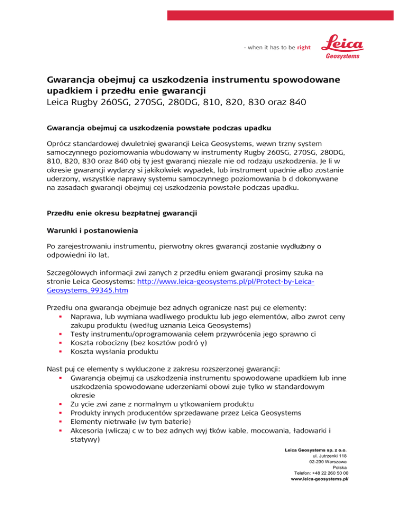 Gwarancja obejmuj ca uszkodzenia instrumentu spowodowane upadkiem i przedłu enie gwarancji Leica Rugby 260SG, 270SG, 280DG, 810, 820, 830 oraz 840 Gwarancja obejmuj ca uszkodzenia powstałe podczas upadku Oprócz standardowej dwuletniej gwarancji Leica Geosystems, wewn trzny system samoczynnego poziomowania wbudowany w instrumenty Rugby 260SG, 270SG, 280DG, 810, 820, 830 oraz 840 obj ty jest gwarancj niezale nie od rodzaju uszkodzenia. Je li w okresie gwarancji wydarzy si jakikolwiek wypadek, lub instrument upadnie albo zostanie uderzony, wszystkie naprawy systemu samoczynnego poziomowania b d dokonywane na zasadach gwarancji obejmuj cej uszkodzenia powstałe podczas upadku. Przedłu enie okresu bezpłatnej gwarancji Warunki i postanowienia Po zarejestrowaniu instrumentu, pierwotny okres gwarancji zostanie wydłużony o odpowiedni ilo lat. Szczególowych informacji zwi zanych z przedłu eniem gwarancji prosimy szuka na stronie Leica Geosystems: http://www.leica-geosystems.pl/pl/Protect-by-LeicaGeosystems_99345.htm Przedłu ona gwarancja obejmuje bez adnych ogranicze nast puj ce elementy: Naprawa, lub wymiana wadliwego produktu lub jego elementów, albo zwrot ceny zakupu produktu (według uznania Leica Geosystems) Testy instrumentu/oprogramowania celem przywrócenia jego sprawno ci Koszta robocizny (bez kosztów podró y) Koszta wysłania produktu Nast puj ce elementy s wykluczone z zakresu rozszerzonej gwarancji: Gwarancja obejmuj ca uszkodzenia instrumentu spowodowane upadkiem lub inne uszkodzenia spowodowane uderzeniami obowi zuje tylko w standardowym okresie Zu ycie zwi zane z normalnym u ytkowaniem produktu Produkty innych producentów sprzedawane przez Leica Geosystems Elementy nietrwałe (w tym baterie) Akcesoria (wliczaj c w to bez adnych wyj tków kable, mocowania, ładowarki i statywy) Leica Geosystems sp. z o.o. ul. Jutrzenki 118 02-230 Warszawa Polska Telefon: +48 22 260 50 00 www.leica-geosystems.pl/ W dowolnym momencie, podczas trwania pierwotnego okresu gwarancji, istnieje mo liwo jej przedłużenia po zarejest rowaniu inst rument u. Wydł użenie okresu gwarancji jest mo liwe tylko podczas trwania pierwotnego okresu gwarancji. Po wyga ni ciu pierwotnego okresu gwarancji, nie b dzie mo liwe jej przedłu enie. Maksymalny mo liwy okres gwarancji (razem z wydlu eniem) to 5 lat licz c od daty zakupu produktu. Szczegółowych informacji na temat produktów obj tych programem przedłu onej gwarancji prosimy szuka u lokalnych przedstawicieli Leica Geosystems. Leica Geosystems sp. z o.o. ul. Jutrzenki 118 02-230 Warszawa Polska Telefon: +48 22 260 50 00 www.leica-geosystems.pl/