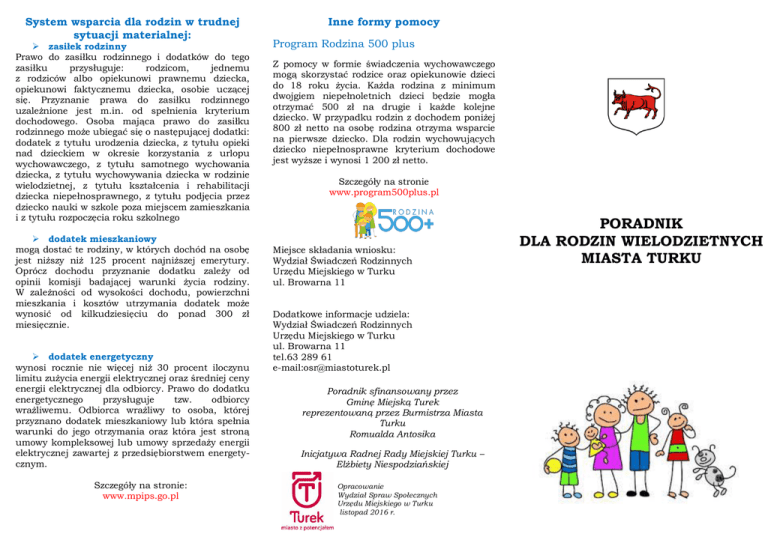 System wsparcia dla rodzin w trudnej sytuacji materialnej: zasiłek rodzinny Prawo do zasiłku rodzinnego i dodatków do tego zasiłku przysługuje: rodzicom, jednemu z rodziców albo opiekunowi prawnemu dziecka, opiekunowi faktycznemu dziecka, osobie uczącej się. Przyznanie prawa do zasiłku rodzinnego uzależnione jest m.in. od spełnienia kryterium dochodowego. Osoba mająca prawo do zasiłku rodzinnego może ubiegać się o następującej dodatki: dodatek z tytułu urodzenia dziecka, z tytułu opieki nad dzieckiem w okresie korzystania z urlopu wychowawczego, z tytułu samotnego wychowania dziecka, z tytułu wychowywania dziecka w rodzinie wielodzietnej, z tytułu kształcenia i rehabilitacji dziecka niepełnosprawnego, z tytułu podjęcia przez dziecko nauki w szkole poza miejscem zamieszkania i z tytułu rozpoczęcia roku szkolnego dodatek mieszkaniowy mogą dostać te rodziny, w których dochód na osobę jest niższy niż 125 procent najniższej emerytury. Oprócz dochodu przyznanie dodatku zależy od opinii komisji badającej warunki życia rodziny. W zależności od wysokości dochodu, powierzchni mieszkania i kosztów utrzymania dodatek może wynosić od kilkudziesięciu do ponad 300 zł miesięcznie. dodatek energetyczny wynosi rocznie nie więcej niż 30 procent iloczynu limitu zużycia energii elektrycznej oraz średniej ceny energii elektrycznej dla odbiorcy. Prawo do dodatku energetycznego przysługuje tzw. odbiorcy wrażliwemu. Odbiorca wrażliwy to osoba, której przyznano dodatek mieszkaniowy lub która spełnia warunki do jego otrzymania oraz która jest stroną umowy kompleksowej lub umowy sprzedaży energii elektrycznej zawartej z przedsiębiorstwem energetycznym. Szczegóły na stronie: www.mpips.go.pl Inne formy pomocy Program Rodzina 500 plus Z pomocy w formie świadczenia wychowawczego mogą skorzystać rodzice oraz opiekunowie dzieci do 18 roku życia. Każda rodzina z minimum dwojgiem niepełnoletnich dzieci będzie mogła otrzymać 500 zł na drugie i każde kolejne dziecko. W przypadku rodzin z dochodem poniżej 800 zł netto na osobę rodzina otrzyma wsparcie na pierwsze dziecko. Dla rodzin wychowujących dziecko niepełnosprawne kryterium dochodowe jest wyższe i wynosi 1 200 zł netto. Szczegóły na stronie www.program500plus.pl Miejsce składania wniosku: Wydział Świadczeń Rodzinnych Urzędu Miejskiego w Turku ul. Browarna 11 Dodatkowe informacje udziela: Wydział Świadczeń Rodzinnych Urzędu Miejskiego w Turku ul. Browarna 11 tel.63 289 61 e-mail:[email protected] Poradnik sfinansowany przez Gminę Miejską Turek reprezentowaną przez Burmistrza Miasta Turku Romualda Antosika Inicjatywa Radnej Rady Miejskiej Turku – Elżbiety Niespodziańskiej Opracowanie Wydział Spraw Społecznych Urzędu Miejskiego w Turku listopad 2016 r. PORADNIK DLA RODZIN WIELODZIETNYCH MIASTA TURKU Ogólnopolska Karta Dużej Rodziny Wielkopolska Karta Dużej Rodziny Turkowska Karta Dużej Rodziny Ogólnopolska Karta Dużej Rodziny to system zniżek Wielkopolska Karta Rodziny zapewnia rodzinom Turkowska Karta Dużej Rodziny stwarza system i dodatkowych uprawnień dla rodzin, które mają na wielodzietnym korzystanie na preferencyjnych ulg, zwolnień i preferencji rodzinom wielodzietnym utrzymaniu warunkach zamieszkującym na terenie Turku mającym na przynajmniej troje dzieci zarówno w instytucjach publicznych i w firmach prywatnych. z katalogu oferty kulturalnej, oświatowej, rekreacyjnej i transportowej poprzez system zniżek wprowadzony przez utrzymaniu przynajmniej troje dzieci. Podmioty przystępujące do Programu ,,Wielkopolska Karta Rodziny”. Karta wydawana jest bezpłatnie: rodzicom bezterminowo, dzieciom – do 18 roku życia lub do ukończenia nauki, maksymalnie do 25 roku życia, w przypadku osób niepełnosprawnych karta wydawana jest na czas orzeczenia o niepełnosprawności. Lista miejsc i wysokość zniżek dostępna na: www.rodzina.gov.pl. Karta wydawana jest bezpłatnie: rodzinie mającej na Dodatkowe informacje udziela: Wydział Spraw Społecznych Urzędu Miejskiego w Turku tel.63 289 61 44/45 e-mail:[email protected] utrzymaniu rodzicom bezterminowo, dzieciom – do 18 roku życia przynajmniej troje dzieci do 18 roku życia lub do ukończenia nauki, maksymalnie do lub do ukończenia nauki, maksymalnie 25 do 26 roku życia; w przypadku osób niepełnosprawnych karta wydawana jest na niepełnosprawnych karta wydawana jest czas orzeczenia o niepełnosprawności. roku życia, w przypadku osób na czas orzeczenia o niepełnosprawności. Lista miejsc i wysokość zniżek dostępna na: www.rops.poznan.pl Miejsce składania wniosku: Urząd Miejski w Turku Biuro Obsługi Klienta ul. Kaliska 59. Karta wydawana jest bezpłatnie: na okres nie dłuższy niż 24 miesiące Miejsce składania wniosku: Urząd Miejski w Turku Biuro Obsługi Klienta ul. Kaliska 59. Dodatkowe informacje udziela: Wydział Spraw Społecznych Urzędu Miejskiego w Turku tel.63 289 61 44/45 e-mail:[email protected] Lista miejsc i wysokość zniżek dostępna na: www.miastoturek.pl Miejsce składania wniosku: Urząd Miejski w Turku Biuro Obsługi Klienta ul. Kaliska 59. Dodatkowe informacje udziela: Wydział Spraw Społecznych Urzędu Miejskiego w Turku tel.63 289 61 44/45 e-mail:[email protected]