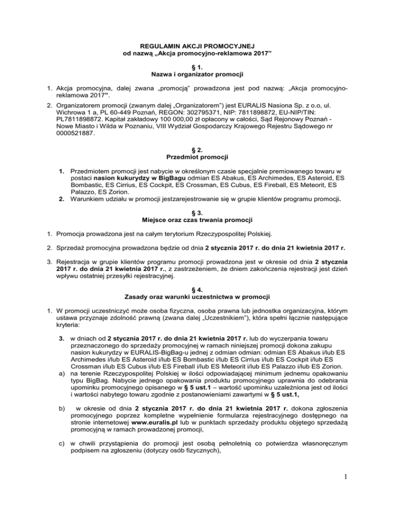 REGULAMIN AKCJI PROMOCYJNEJ od nazwą „Akcja promocyjno-reklamowa 2017” § 1. Nazwa i organizator promocji 1. Akcja promocyjna, dalej zwana „promocją” prowadzona jest pod nazwą: „Akcja promocyjnoreklamowa 2017”. 2. Organizatorem promocji (zwanym dalej „Organizatorem”) jest EURALIS Nasiona Sp. z o.o, ul. Wichrowa 1 a, PL 60-449 Poznań, REGON: 302795371, NIP: 7811898872, EU-NIP/TIN: PL7811898872. Kapitał zakładowy 100 000,00 zł opłacony w całości, Sąd Rejonowy Poznań Nowe Miasto i Wilda w Poznaniu, VIII Wydział Gospodarczy Krajowego Rejestru Sądowego nr 0000521887. § 2. Przedmiot promocji 1. Przedmiotem promocji jest nabycie w określonym czasie specjalnie premiowanego towaru w postaci nasion kukurydzy w BigBagu odmian ES Abakus, ES Archimedes, ES Asteroid, ES Bombastic, ES Cirrius, ES Cockpit, ES Crossman, ES Cubus, ES Fireball, ES Meteorit, ES Palazzo, ES Zorion. 2. Warunkiem udziału w promocji jestzarejestrowanie się w grupie klientów programu promocji. § 3. Miejsce oraz czas trwania promocji 1. Promocja prowadzona jest na całym terytorium Rzeczypospolitej Polskiej. 2. Sprzedaż promocyjna prowadzona będzie od dnia 2 stycznia 2017 r. do dnia 21 kwietnia 2017 r. 3. Rejestracja w grupie klientów programu promocji prowadzona jest w okresie od dnia 2 stycznia 2017 r. do dnia 21 kwietnia 2017 r., z zastrzeżeniem, że dniem zakończenia rejestracji jest dzień wpływu ostatniej przesyłki rejestracyjnej. § 4. Zasady oraz warunki uczestnictwa w promocji 1. W promocji uczestniczyć może osoba fizyczna, osoba prawna lub jednostka organizacyjna, którym ustawa przyznaje zdolność prawną (zwana dalej „Uczestnikiem”), która spełni łącznie następujące kryteria: 3. w dniach od 2 stycznia 2017 r. do dnia 21 kwietnia 2017 r. lub do wyczerpania towaru przeznaczonego do sprzedaży promocyjnej w ramach niniejszej promocji dokona zakupu nasion kukurydzy w EURALIS-BigBag-u jednej z odmian odmian: odmian ES Abakus i/lub ES Archimedes i/lub ES Asteroid i/lub ES Bombastic i/lub ES Cirrius i/lub ES Cockpit i/lub ES Crossman i/lub ES Cubus i/lub ES Fireball i/lub ES Meteorit i/lub ES Palazzo i/lub ES Zorion. a) na terenie Rzeczypospolitej Polskiej w ilości odpowiadającej minimum jednemu opakowaniu typu BigBag. Nabycie jednego opakowania produktu promocyjnego uprawnia do odebrania upominku promocyjnego opisanego w § 5 ust.1 – wartość upominku uzależniona jest od ilości i wartości nabytego towaru zgodnie z postanowieniami zawartymi w § 5 ust.1, b) w okresie od dnia 2 stycznia 2017 r. do dnia 21 kwietnia 2017 r. dokona zgłoszenia promocyjnego poprzez kompletne wypełnienie formularza rejestracyjnego dostępnego na stronie internetowej www.euralis.pl lub w punktach sprzedaży produktu objętego sprzedażą promocyjną w ramach prowadzonej promocji, c) w chwili przystąpienia do promocji jest osobą pełnoletnią co potwierdza własnoręcznym podpisem na zgłoszeniu (dotyczy osób fizycznych), 1 2. Uczestnik dokonuje zgłoszenia samodzielnie, we własnym imieniu i zobowiązany jest do podania wszystkich danych wymaganych w formularzu rejestracyjnym, tj.: imię i nazwisko, miejsce zamieszkania, adres e-mail, numer telefonu kontaktowego, dowód zakupu co najmniej jednego opakowania typu BigBag z nasionami kukurydzy jednej z odmian: odmian ES Abakus i/lub ES Archimedes i/lub ES Asteroid i/lub ES Bombastic i/lub ES Cirrius i/lub ES Cockpit i/lub ES Crossman i/lub ES Cubus i/lub ES Fireball i/lub ES Meteorit i/lub ES Palazzo i/lub ES Zorion. (kopia faktury zakupu) oświadczenie w przedmiocie wyrażenia zgody na przetwarzanie danych osobowych Uczestnika na potrzeby promocji na rzecz Organizatora, w szczególności na dowolne publikowanie danych uczestników przez Organizatora na stronie www.euralis.pl 3. Uczestnik przystępując do promocji oświadcza, iż nabycie produktu było dokonane wyłącznie przez niego i nie narusza praw osób trzecich. W przypadku, gdyby oświadczenie, o którym mowa powyżej okazało się nieprawdziwe, a osoby trzecie wystąpiły wobec Organizatora lub podmiotów z nim współpracujących z roszczeniami z tytułu naruszenia ich praw do upominku promocyjnego, Uczestnik zobowiązuje się do zwolnienia Organizatora lub takich podmiotów z odpowiedzialności prawnej. 4. Dokonując zgłoszenia promocyjnego Uczestnik wyraża na warunkach określonych w niniejszym regulaminie. zgodę na udział w promocji 5. Jeden Uczestnik może dokonać zgłoszenia dowolnej liczby zgłoszeń i może otrzymać więcej niż jeden upominek w promocji. 6. Zgłoszenia nieprawidłowe i niekompletne nie będą brały udziału w promocji. § 5. Nagrody 1. Nagrodami/upominkami w promocji są: Piła do gałęzi STIHL o wartości ok. 100 zł brutto za zakup nasion w 1 opakowaniu BigBag. Odtwarzacz mp3 iPod Shuffle wartości ok. 250 zł brutto za zakup nasion w 2 opakowaniach BigBag Asystent kierowcy Yanosik o wartości ok. 450 zł brutto za zakup nasion w 3 opakowaniach BigBag Grill gazowy o wartości brutto ok. 1.000 zł brutto za zakup nasion w 4 opakowaniach BigBag Smartphone Samsung Galaxy lub Deskorolka elektryczna SKYMASTER o wartości brutto ok. 1.500 zł brutto wraz z częścią gotówkową w kwocie do 150 zł (przeznaczoną na należny podatek dochodowy zgodnie z zapisem art. 21 ustawy o podatku dochodowym od osób fizycznych) za zakup nasion w 5 opakowaniach BigBag 2. Uczestnikowi promocji nie przysługuje zamiana na inną nagrodę o wyższej wartości, ani jej ekwiwalent rzeczowy lub pieniężny. Zamiana na inną nagrodę przysługuje tylko w przypadku dokonania przez uczestnika wyboru nagrody o wartości niższej, aniżeli oferowana zgodnie z niniejszym regulaminem. Odbierając nagrodę/upominek, Uczestnik zrzeka się jakichkolwiek roszczeń i pretensji względem Organizatora promocji. Uczestnicy ponoszą pełną odpowiedzialność za jakiekolwiek szkody lub straty spowodowane lub zgłaszane jako spowodowane przez udział w promocji lub też przez wykor