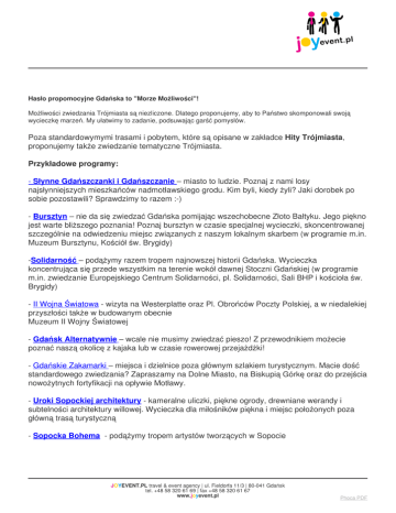 Hasło propomocyjne Gdańska to "Morze Możliwości"! Możliwości zwiedzania Trójmiasta są niezliczone. Dlatego proponujemy, aby to Państwo skomponowali swoją wycieczkę marzeń. My ułatwimy to zadanie, podsuwając garść pomysłów. Poza standardowymymi trasami i pobytem, które są opisane w zakładce Hity Trójmiasta, proponujemy także zwiedzanie tematyczne Trójmiasta. Przykładowe programy: - Słynne Gdańszczanki i Gdańszczanie – miasto to ludzie. Poznaj z nami losy najsłynniejszych mieszkańców nadmotławskiego grodu. Kim byli, kiedy żyli? Jaki dorobek po sobie pozostawili? Sprawdzimy to razem :-) - Bursztyn – nie da się zwiedzać Gdańska pomijając wszechobecne Złoto Bałtyku. Jego piękno jest warte bliższego poznania! Poznaj bursztyn w czasie specjalnej wycieczki, skoncentrowanej szczególnie na odwiedzeniu miejsc związanych z naszym lokalnym skarbem (w programie m.in. Muzeum Bursztynu, Kościół św. Brygidy) -Solidarność – podążymy razem tropem najnowszej historii Gdańska. Wycieczka koncentrująca się przede wszystkim na terenie wokół dawnej Stoczni Gdańskiej (w programie m.in. zwiedzanie Europejskiego Centrum Solidarności, pl. Solidarności, Sali BHP i kościoła św. Brygidy) - II Wojna Światowa - wizyta na Westerplatte oraz Pl. Obrońców Poczty Polskiej, a w niedalekiej przyszłości także w budowanym obecnie Muzeum II Wojny Światowej - Gdańsk Alternatywnie – wcale nie musimy zwiedzać pieszo! Z przewodnikiem możecie poznać naszą okolicę z kajaka lub w czasie rowerowej przejażdżki! - Gdańskie Zakamarki – miejsca i dzielnice poza głównym szlakiem turystycznym. Macie dość standardowego zwiedzania? Zapraszamy na Dolne Miasto, na Biskupią Górkę oraz do przejścia nowożytnych fortyfikacji na opływie Motławy. - Uroki Sopockiej architektury - kameralne uliczki, piękne ogrody, drewniane werandy i subtelności architektury willowej. Wycieczka dla miłośników piękna i miejsc położonych poza główną trasą turystyczną - Sopocka Bohema - podążymy tropem artystów tworzących w Sopocie JOYEVENT.PL travel & event agency | ul. Fieldorfa 11/3 | 80-041 Gdańsk tel. +48 58 320 61 69 | fax +48 58 320 61 67 www.joyevent.pl Phoca PDF - Gdynia - Miasto z Morza i Marzeń - zwiedzanie portu gdyńskiego - Twórcy Gdyni - najsłynniejsze osoby związane z powstaniem miasta - Gdyński Modernizm - trasa przybliżająca perły gdyńskiej architektury Planujesz zorganizować klasową wycieczkę „z klasą”? Szukasz transportu, przewodnika, pilota, programu wycieczki? Nasze biuro podróży z przyjemnością Ci w tym pomoże. Joytrip.pl to organizator wycieczek szkolnych nastawiony przede wszystkim na satysfakcję klientów. W ramach turystyki szkolnej oferujemy autorskie programy wyjazdów szkolnych, zielonych szkół, biwaków i wycieczek krajoznawczych. Najchętniej wybierane przez naszych klientów programy i regiony to: Kraków, Warszawa, Lwów, Praga, Łeba, Zakopane, Poznań, Mazury, Pomorze, Bieszczady, Tatry, Szlak Piastowski, Pomorze. Podróżujemy zawsze bezpiecznie autokarem, busem lub pociągiem. Każda z naszych wycieczek daje możliwość aktywnego wypoczynku, naturalnego poszerzenia wiedzy uczniów i ich integracji przez zabawę, której tak często brakuje w dobie intensywnej komputeryzacji. JOYEVENT.PL travel & event agency | ul. Fieldorfa 11/3 | 80-041 Gdańsk tel. +48 58 320 61 69 | fax +48 58 320 61 67 www.joyevent.pl Phoca PDF