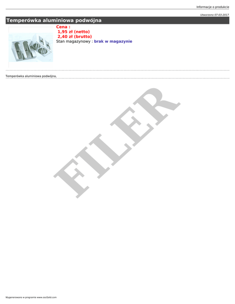 Informacje o produkcie Utworzono 07-03-2017 Temperówka aluminiowa podwójna Cena : 1,95 zł (netto) 2,40 zł (brutto) Stan magazynowy : brak w magazynie FI LE R Temperówka aluminiowa podwójna, Wygenerowano w programie www.oscGold.com