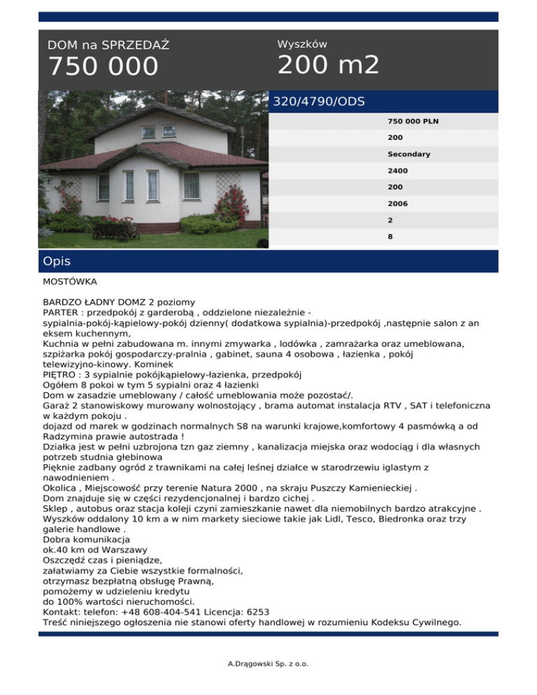 DOM na SPRZEDAŻ 750 000 Wyszków 200 m2 320/4790/ODS 750 000 PLN 200 Secondary 2400 200 2006 2 8 Opis MOSTÓWKA BARDZO ŁADNY DOMZ 2 poziomy PARTER : przedpokój z garderobą , oddzielone niezależnie sypialnia-pokój-kąpielowy-pokój dzienny( dodatkowa sypialnia)-przedpokój ,następnie salon z an eksem kuchennym, Kuchnia w pełni zabudowana m. innymi zmywarka , lodówka , zamrażarka oraz umeblowana, szpiżarka pokój gospodarczy-pralnia , gabinet, sauna 4 osobowa , łazienka , pokój telewizyjno-kinowy. Kominek PIĘTRO : 3 sypialnie pokójkąpielowy-łazienka, przedpokój Ogółem 8 pokoi w tym 5 sypialni oraz 4 łazienki Dom w zasadzie umeblowany / całość umeblowania może pozostać/. Garaż 2 stanowiskowy murowany wolnostojący , brama automat instalacja RTV , SAT i telefoniczna w każdym pokoju . dojazd od marek w godzinach normalnych S8 na warunki krajowe,komfortowy 4 pasmówką a od Radzymina prawie autostrada ! Działka jest w pełni uzbrojona tzn gaz ziemny , kanalizacja miejska oraz wodociąg i dla własnych potrzeb studnia głebinowa Pięknie zadbany ogród z trawnikami na całej leśnej działce w starodrzewiu iglastym z nawodnieniem . Okolica , Miejscowość przy terenie Natura 2000 , na skraju Puszczy Kamienieckiej . Dom znajduje się w części rezydencjonalnej i bardzo cichej . Sklep , autobus oraz stacja koleji czyni zamieszkanie nawet dla niemobilnych bardzo atrakcyjne . Wyszków oddalony 10 km a w nim markety sieciowe takie jak Lidl, Tesco, Biedronka oraz trzy galerie handlowe . Dobra komunikacja ok.40 km od Warszawy Oszczędź czas i pieniądze, załatwiamy za Ciebie wszystkie formalności, otrzymasz bezpłatną obsługę Prawną, pomożemy w udzieleniu kredytu do 100% wartości nieruchomości. Kontakt: telefon: +48 608-404-541 Licencja: 6253 Treść niniejszego ogłoszenia nie stanowi oferty handlowej w rozumieniu Kodeksu Cywilnego. A.Drągowski Sp. z o.o. Bożenna Szkrabko tel. 608404541 email: [email protected] A.Drągowski Sp. z o.o. Powered by TCPDF (www.tcpdf.org)