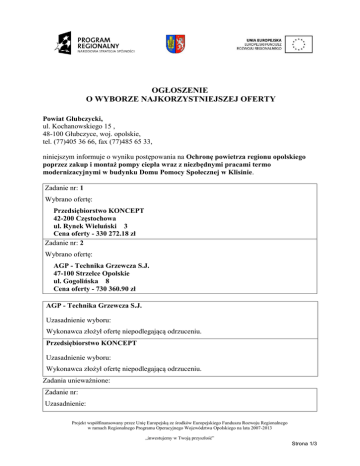 OGŁOSZENIE O WYBORZE NAJKORZYSTNIEJSZEJ OFERTY Powiat Głubczycki, ul. Kochanowskiego 15 , 48-100 Głubczyce, woj. opolskie, tel. (77)405 36 66, fax (77)485 65 33, niniejszym informuje o wyniku postępowania na Ochronę powietrza regionu opolskiego poprzez zakup i montaż pompy ciepła wraz z niezbędnymi pracami termo modernizacyjnymi w budynku Domu Pomocy Społecznej w Klisinie. Zadanie nr: 1 Wybrano ofertę: Przedsiębiorstwo KONCEPT 42-200 Częstochowa ul. Rynek Wieluński 3 Cena oferty - 330 272.18 zł Zadanie nr: 2 Wybrano ofertę: AGP - Technika Grzewcza S.J. 47-100 Strzelce Opolskie ul. Gogolińska 8 Cena oferty - 730 360.90 zł AGP - Technika Grzewcza S.J. Uzasadnienie wyboru: Wykonawca złożył ofertę niepodlegającą odrzuceniu. Przedsiębiorstwo KONCEPT Uzasadnienie wyboru: Wykonawca złożył ofertę niepodlegającą odrzuceniu. Zadania unieważnione: Zadanie nr: Uzasadnienie: Projekt współfinansowany przez Unię Europejską ze środków Europejskiego Funduszu Rozwoju Regionalnego w ramach Regionalnego Programu Operacyjnego Województwa Opolskiego na lata 2007-2013 „inwestujemy w Twoją przyszłość” Strona 1/3 Streszczenie oceny i porównania złożonych ofert Zadanie częściowe 1 - Wymiana stolarki okiennej i docieplenie stropu w Domu Pomocy Społecznej w Klisinie 1 - Wymiana stolarki okiennej i docieplenie stropu w Domu Pomocy Społecznej w Klisinie 2 - Montaż pomp ciepła w Domu Pomocy Społecznej w Klisinie 2 - Montaż pomp ciepła w Domu Pomocy Społecznej w Klisinie 2 - Montaż pomp ciepła w Domu Pomocy Społecznej w Klisinie 2 - Montaż pomp ciepła w Domu Pomocy Społecznej w Klisinie 2 - Montaż pomp ciepła w Domu Pomocy Społecznej w Klisinie 2 - Montaż pomp ciepła w Domu Pomocy Społecznej w Klisinie 2 - Montaż pomp ciepła w Domu Pomocy Społecznej w Klisinie 2 - Montaż pomp ciepła w Domu Pomocy Społecznej w Klisinie Nazwa i adres wykonawcy BETBRUK ul. Żeromskiego 27/a 48-100 Głubczyce Przedsiębiorstwo KONCEPT ul. Rynek Wieluński 3 42-200 Częstochowa LP INS-STAL Przedsiębiorstwo HandlowoInstalacyjne ul. Konradowa 3/c 48-303 Nysa AGP - Technika Grzewcza S.J. ul. Gogolińska 8 47-100 Strzelce Opolskie INNO Project Piotr Kuraszyk Rzeczyca ul. Polna 6 21-560 Międzyrzec Podlaski K&K Kapica Karpiak ul. Szkolna 46 44-200 Rybnik HIBERNATUS Sp. z o.o ul. Iwańskiego 9 34-100 Wadowice Przedsiębiorstwo Handlowo Usługowe PROMONT Sp.J. ul. Cygana 1 45-131 Opole GALMET Sp. z o.o Sp. K. ul. Raciborska 36 48-100 Głubczyce SUN GALLO S.C. ul. Milionowa 21 93-105 Łódź Nazwa kryterium – liczba pkt Razem 1 - Cena (koszt) - 278.40 278,40 1 - Cena (koszt) - 300.00 300,00 1 - Cena (koszt) - 269.85 269,85 1 - Cena (koszt) - 300.00 300,00 1 - Cena (koszt) - 283.83 283,83 1 - Cena (koszt) - 278.31 278,31 1 - Cena (koszt) - 268.86 268,86 1 - Cena (koszt) - 243.48 243,48 1 - Cena (koszt) - 242.91 242,91 1 - Cena (koszt) - 221.01 221,01 W toku postępowania odrzucone zostały następujące oferty: Lp.: 1 Nr oferty, nazwa i adres wykonawcy: 6 OZE INSTALATOR Michał Napierkowski Kielczewo ul. Ogrodowa 14 /B 64-000 Kościan Uzasadnienie odrzucenia oferty: Art. 89. ust.1 pkt 5 Oferta została odrzucona ponieważ wykonawca został wykluczony Projekt współfinansowany przez Unię Europejską ze środków Europejskiego Funduszu Rozwoju Regionalnego w ramach Regionalnego Programu Operacyjnego Województwa Opolskiego na lata 2007-2013 „inwestujemy w Twoją przyszłość” Strona 2/3 oraz wykluczono z postępowania następujących wykonawców: Lp.: 1 Nazwa i adres wykonawcy: Uzasadnienie wykluczenia wykonawcy: OZE INSTALATOR Michał Napierkowski Kielczewo ul. Ogrodowa 14 /B 64-000 Kościan Art. 24 ust. 2 pkt 2 Wykonawca w wyznaczonym terminie nie dokonał wpłaty wymaganej kwoty wadium Głubczyce dnia: 2014-05-15 Projekt współfinansowany przez Unię Europejską ze środków Europejskiego Funduszu Rozwoju Regionalnego w ramach Regionalnego Programu Operacyjnego Województwa Opolskiego na lata 2007-2013 „inwestujemy w Twoją przyszłość” Strona 3/3