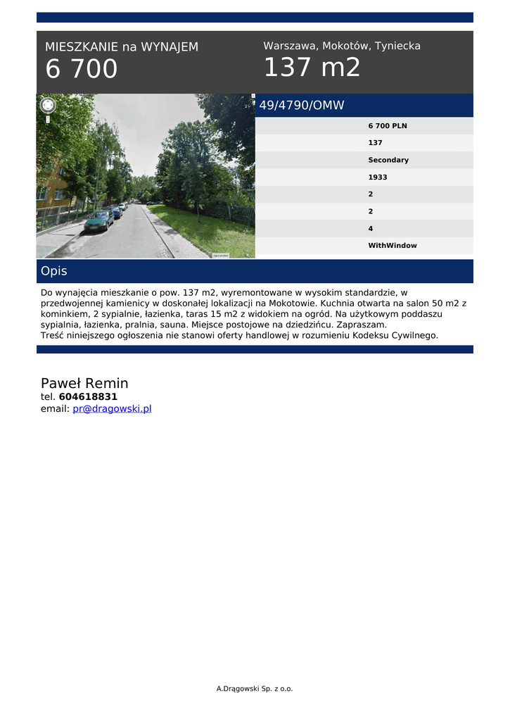 MIESZKANIE na WYNAJEM 6 700 Warszawa, Mokotów, Tyniecka 137 m2 49/4790/OMW 6 700 PLN 137 Secondary 1933 2 2 4 WithWindow Opis Do wynajęcia mieszkanie o pow. 137 m2, wyremontowane w wysokim standardzie, w przedwojennej kamienicy w doskonałej lokalizacji na Mokotowie. Kuchnia otwarta na salon 50 m2 z kominkiem, 2 sypialnie, łazienka, taras 15 m2 z widokiem na ogród. Na użytkowym poddaszu sypialnia, łazienka, pralnia, sauna. Miejsce postojowe na dziedzińcu. Zapraszam. Treść niniejszego ogłoszenia nie stanowi oferty handlowej w rozumieniu Kodeksu Cywilnego. Paweł Remin tel. 604618831 email: [email protected] A.Drągowski Sp. z o.o. Powered by TCPDF (www.tcpdf.org)