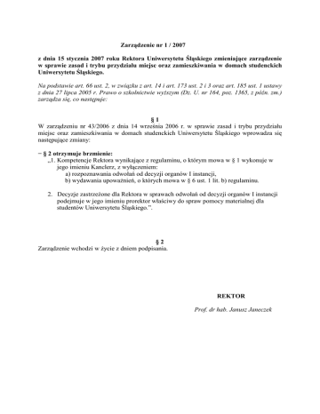Zarządzenie nr 1 / 2007 z dnia 15 stycznia 2007 roku Rektora Uniwersytetu Śląskiego zmieniające zarządzenie w sprawie zasad i trybu przydziału miejsc oraz zamieszkiwania w domach studenckich Uniwersytetu Śląskiego. Na podstawie art. 66 ust. 2, w związku z art. 14 i art. 173 ust. 2 i 3 oraz art. 185 ust. 1 ustawy z dnia 27 lipca 2005 r. Prawo o szkolnictwie wyŜszym (Dz. U. nr 164, poz. 1365, z późn. zm.) zarządza się, co następuje: §1 W zarządzeniu nr 43/2006 z dnia 14 września 2006 r. w sprawie zasad i trybu przydziału miejsc oraz zamieszkiwania w domach studenckich Uniwersytetu Śląskiego wprowadza się następujące zmiany: − § 2 otrzymuje brzmienie: „1. Kompetencje Rektora wynikające z regulaminu, o którym mowa w § 1 wykonuje w jego imieniu Kanclerz, z wyłączeniem: a) rozpoznawania odwołań od decyzji organów I instancji, b) wydawania upowaŜnień, o których mowa w § 6 ust. 1 lit. b) regulaminu. 2. Decyzje zastrzeŜone dla Rektora w sprawach odwołań od decyzji organów I instancji podejmuje w jego imieniu prorektor właściwy do spraw pomocy materialnej dla studentów Uniwersytetu Śląskiego.”. §2 Zarządzenie wchodzi w Ŝycie z dniem podpisania. REKTOR Prof. dr hab. Janusz Janeczek