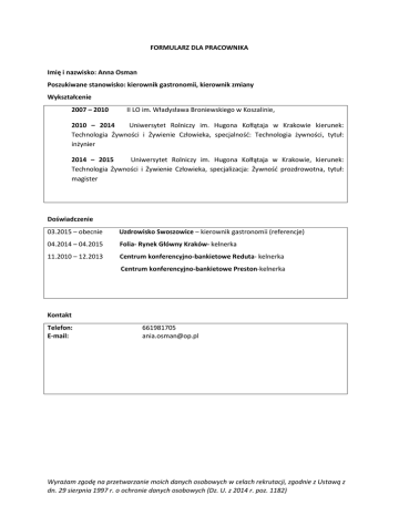 FORMULARZ DLA PRACOWNIKA Imię i nazwisko: Anna Osman Poszukiwane stanowisko: kierownik gastronomii, kierownik zmiany Wykształcenie 2007 – 2010 II LO im. Władysława Broniewskiego w Koszalinie, 2010 – 2014 Uniwersytet Rolniczy im. Hugona Kołłątaja w Krakowie kierunek: Technologia Żywności i Żywienie Człowieka, specjalność: Technologia żywności, tytuł: inżynier 2014 – 2015 Uniwersytet Rolniczy im. Hugona Kołłątaja w Krakowie, kierunek: Technologia Żywności i Żywienie Człowieka, specjalizacja: Żywność prozdrowotna, tytuł: magister Doświadczenie 03.2015 – obecnie Uzdrowisko Swoszowice – kierownik gastronomii (referencje) 04.2014 – 04.2015 Folia- Rynek Główny Kraków- kelnerka 11.2010 – 12.2013 Centrum konferencyjno-bankietowe Reduta- kelnerka Centrum konferencyjno-bankietowe Preston-kelnerka Kontakt Telefon: E-mail: 661981705 [email protected] Wyrażam zgodę na przetwarzanie moich danych osobowych w celach rekrutacji, zgodnie z Ustawą z dn. 29 sierpnia 1997 r. o ochronie danych osobowych (Dz. U. z 2014 r. poz. 1182)