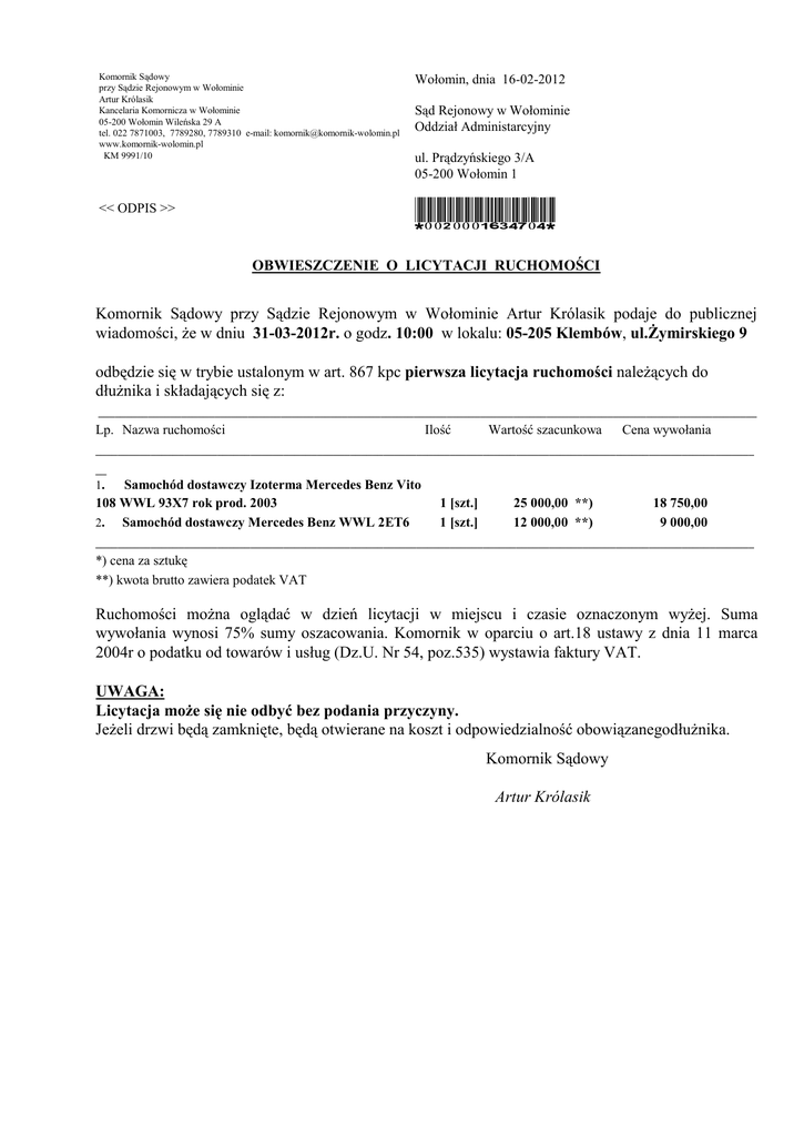 Komornik Sądowy przy Sądzie Rejonowym w Wołominie Artur Królasik Kancelaria Komornicza w Wołominie 05-200 Wołomin Wileńska 29 A tel. 022 7871003, 7789280, 7789310 e-mail: [email protected] www.komornik-wolomin.pl KM 9991/10 Wołomin, dnia 16-02-2012 << ODPIS >> *0020001634704* Sąd Rejonowy w Wołominie Oddział Administarcyjny ul. Prądzyńskiego 3/A 05-200 Wołomin 1 OBWIESZCZENIE O LICYTACJI RUCHOMOŚCI Komornik Sądowy przy Sądzie Rejonowym w Wołominie Artur Królasik podaje do publicznej wiadomości, że w dniu 31-03-2012r. o godz. 10:00 w lokalu: 05-205 Klembów, ul.Żymirskiego 9 odbędzie się w trybie ustalonym w art. 867 kpc pierwsza licytacja ruchomości należących do dłużnika i składających się z: _______________________________________________________________________________________________________________________ Lp. Nazwa ruchomości Ilość Wartość szacunkowa Cena wywołania _______________________________________________________________________________________________________________________ __ 1. Samochód dostawczy Izoterma Mercedes Benz Vito 108 WWL 93X7 rok prod. 2003 2. Samochód dostawczy Mercedes Benz WWL 2ET6 1 [szt.] 1 [szt.] 25 000,00 **) 12 000,00 **) 18 750,00 9 000,00 _______________________________________________________________________________________________________________________ *) cena za sztukę **) kwota brutto zawiera podatek VAT Ruchomości można oglądać w dzień licytacji w miejscu i czasie oznaczonym wyżej. Suma wywołania wynosi 75% sumy oszacowania. Komornik w oparciu o art.18 ustawy z dnia 11 marca 2004r o podatku od towarów i usług (Dz.U. Nr 54, poz.535) wystawia faktury VAT. UWAGA: Licytacja może się nie odbyć bez podania przyczyny. Jeżeli drzwi będą zamknięte, będą otwierane na koszt i odpowiedzialność obowiązanegodłużnika. Komornik Sądowy Artur Królasik