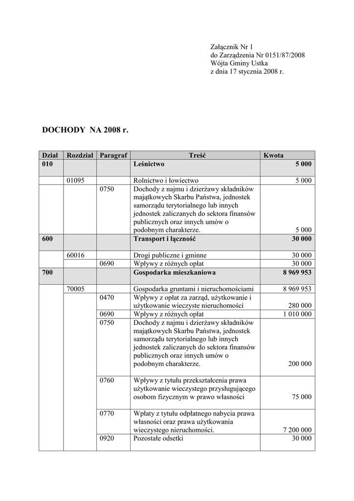 Załącznik Nr 1 do Zarządzenia Nr 0151/87/2008 Wójta Gminy Ustka z dnia 17 stycznia 2008 r. DOCHODY NA 2008 r. Dział 010 Rozdział Paragraf 01095 0750 600 60016 0690 700 70005 0470 0690 0750 0760 0770 0920 Treść Kwota Leśnictwo 5 000 Rolnictwo i łowiectwo Dochody z najmu i dzierŜawy składników majątkowych Skarbu Państwa, jednostek samorządu terytorialnego lub innych jednostek zaliczanych do sektora finansów publicznych oraz innych umów o podobnym charakterze. Transport i łączność 5 000 5 000 30 000 Drogi publiczne i gminne Wpływy z róŜnych opłat Gospodarka mieszkaniowa 30 000 30 000 8 969 953 Gospodarka gruntami i nieruchomościami Wpływy z opłat za zarząd, uŜytkowanie i uŜytkowanie wieczyste nieruchomości Wpływy z róŜnych opłat Dochody z najmu i dzierŜawy składników majątkowych Skarbu Państwa, jednostek samorządu terytorialnego lub innych jednostek zaliczanych do sektora finansów publicznych oraz innych umów o podobnym charakterze. 8 969 953 280 000 1 010 000 200 000 Wpływy z tytułu przekształcenia prawa uŜytkowanie wieczystego przysługującego osobom fizycznym w prawo własności 75 000 Wpłaty z tytułu odpłatnego nabycia prawa własności oraz prawa uŜytkowania wieczystego nieruchomości. Pozostałe odsetki 7 200 000 30 000 6290 750 75011 2010 75023 0690 0970 2360 751 75101 2010 756 75601 0350 0910 75615 Środki na dofinansowanie własnych inwestycji gmin (związków gmin), powiatów (związków powiatów) samorządów, województw, pozyskane z innych źródeł Administracja publiczna Urzędy wojewódzkie Dotacje celowe otrzymane z budŜetu państwa na realizację zadań bieŜących z zakresu administracji rządowej oraz innych zadań zleconych gminie ( związkom gmin) ustawami. Urzędy gmin ( miast i miast na prawach powiatu) Wpływy z róŜnych opłat Wpływy z róŜnych dochodów Dochody jednostek samorządu terytorialnego związane z realizacja zadań z zakresu administracji rządowej oraz innych zadań zleconych ustawami Urzędy naczelnych organów władzy państwowej, kontroli i ochrony prawa oraz sądownictwa. Urzędy naczelnych organów władzy państwowej, kontroli i ochrony prawa Dotacje celowe otrzymane z budŜetu państwa na realizację zadań bieŜących z zakresu administracji rządowej oraz innych zadań zleconych gminie ( związkom gmin) ustawami. Dochody od osób prawnych, od osób fizycznych i od innych jednostek nie posiadających osobowości prawnej oraz wydatki związane z ich poborem. Wpływy z podatku dochodowego od osób fizycznych Podatek od działalności gospodarczej osób fizycznych, opłacany w formie karty podatkowej. Odsetki od nieterminowych wpłat z tytułu podatków i opłat Wpływy z podatku rolnego, podatku leśnego, podatku od czynności cywilnoprawnych, podatków i opłat lokalnych od osób prawnych i innych jednostek organizacyjnych 174 953 78 850 66 000 66 000 12 850 10 000 1 500 1 350 1 242 1 242 1 242 13 459 964 131 000 130 000 1 000 5 792 100 0310 0320 0330 0340 0500 Podatek od nieruchomości Podatek rolny Podatek leśny Podatek od środków transportowych Podatek od czynności cywilnoprawnych 0910 Odsetki od nieterminowych wpłat z tytułu podatków i opłat. Rekompensaty utraconych dochodów w podatkach i opłatach lokalnych Wpływy z podatku rolnego, podatku leśnego, podatku od spadków i darowizn, podatku od czynności cywilno-prawnych oraz podatków i opłat lokalnych od osób fizycznych. Podatek od nieruchomości Podatek rolny Podatek leśny Podatek od środków transportowych Podatek od spadków i darowizn Wpływy z opłaty targowej Wpływy z opłaty miejscowej Podatek od czynności cywilnoprawnych Odsetki od nieterminowych wpłat z tytułu podatków i opłat Wpływy z innych opłat stanowiących dochody jednostek samorządu terytorialnego na podstawie ustaw Wpływy z opłaty skarbowej Wpływy z opłaty eksploatacyjnej Wpływy z opłat za zezwolenia na sprzedaŜ alkoholu Wpływy z innych lokalnych opłat pobieranych przez jednostki samorządu terytorialnego na podstawie odrębnych ustaw Udziały gmin w podatkach stanowiących dochód budŜetu państwa Podatek dochodowy od osób fizycznych Podatek dochodowy od osób prawnych RóŜne rozliczenia 3 164 864 2 264 864 900 000 3 378 720 Część oświatowa subwencji ogólnej dla jednostek samorządu terytorialnego Subwencje ogólne z budŜetu państwa RóŜne rozliczenia finansowe Pozostałe odsetki 3 298 720 3 298 720 80 000 80 000 2680 75616 0310 0320 0330 0340 0360 0430 0440 0500 0910 75618 0410 0460 0480 0490 75621 0010 0020 758 75801 2920 75814 0920 5 200 000 220 000 85 000 150 000 20 000 20 000 97 100 4 041 000 2 500 000 420 000 6 000 70 000 20 000 100 000 350 000 500 000 75 000 331 000 70 000 1 000 240 000 20 000 801 80195 2030 852 85212 0970 2010 85213 2010 85214 2010 2030 85219 2030 85228 0970 Oświata i wychowanie 12 792 Pozostała działalność 12 792 Dotacje celowe otrzymane z budŜetu państwa na realizacje własnych zadań bieŜących gmin (związków gmin) Pomoc społeczna Świadczenia rodzinne, zaliczka alimentacyjna oraz składki na ubezpieczenia emerytalne i rentowe z ubezpieczenia społecznego Wpływy z róŜnych dochodów Dotacje celowe otrzymane z budŜetu państwa na realizacje zadań bieŜących z zakresu administracji rządowej oraz innych zadań zleconych gminom (związkom gmin) ustawami Składki na ubezpieczenie zdrowotne opłacane za osoby pobierające niektóre świadczenia z pomocy społecznej oraz niektóre świadczenia rodzinne. Dotacje celowe otrzymane z budŜetu państwa na realizacje zadań bieŜących z zakresu administracji rządowej oraz innych zadań zleconych gminom (związkom gmin) ustawami Zasiłki i pomoc w naturze oraz składki na ubezpieczenia emerytalne i rentowe Dotacje celowe otrzymane z budŜetu państwa na realizacje zadań bieŜących z zakresu administracji rządowej oraz innych zadań zleconych gminom (związkom gmin) ustawami Dotacje celowe otrzymane z budŜetu państwa na realizację wł