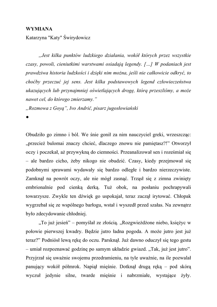 WYMIANA Katarzyna "Katy" Świrydowicz „Jest kilka punktów ludzkiego działania, wokół których przez wszystkie czasy, powoli, cieniutkimi warstwami osiadają legendy. […] W podaniach jest prawdziwa historia ludzkości i dzięki nim można, jeśli nie całkowicie odkryć, to choćby przeczuć jej sens. Jest kilka podstawowych legend człowieczeństwa ukazujących lub przynajmniej oświetlających drogę, którą przeszliśmy, a może nawet cel, do którego zmierzamy.” „Rozmowa z Goyą”, Ivo Andrič, pisarz jugosłowiański ● Obudziło go zimno i ból. We śnie gonił za nim nauczyciel greki, wrzeszcząc: „przecież bulomai znaczy chcieć, dlaczego znowu nie pamiętasz?!” Otworzył oczy i poczekał, aż przywykną do ciemności. Przeanalizował sen i roześmiał się – ale bardzo cicho, żeby nikogo nie obudzić. Czasy, kiedy przejmował się podobnymi sprawami wydawały się bardzo odległe i bardzo nierzeczywiste. Zamknął na powrót oczy, ale nie mógł zasnąć. Trząsł się z zimna zwinięty embrionalnie pod cienką derką. Tuż obok, na posłaniu pochrapywali towarzysze. Zwykle ten dźwięk go uspokajał, teraz zaczął irytować. Chłopak wygrzebał się ze wspólnego barłogu, wstał i wyszedł przed szałas. Na zewnątrz było zdecydowanie chłodniej. „To już jesień” – pomyślał ze złością. „Rozgwieżdżone niebo, księżyc w połowie pierwszej kwadry. Będzie jutro ładna pogoda. A może jutro jest już teraz?” Podniósł lewą rękę do oczu. Parsknął. Już dawno oduczył się tego gestu – umiał rozpoznawać godzinę po samym układzie gwiazd. „Tak, już jest jutro”. Przyjrzał się uważnie swojemu przedramieniu, na tyle uważnie, na ile pozwalał panujący wokół półmrok. Napiął mięśnie. Dotknął drugą ręką – pod skórą wyczuł jedynie silne, twarde mięśnie i nabrzmiałe, wystające żyły. „Schudłem dobre dziesięć kilo. Ciekawe, czy ktoś by mnie poznał, gdybym wrócił? Wyrosła mi broda. Mam dłuższe włosy… Czy będę mógł kiedykolwiek wrócić?” – pytanie, odsuwane na skraj świadomości, wróciło. „Dlaczego moja teoria zawiodła, ale tak naprawdę? Co zrobiłem źle? Gdzie się pomyliłem? Dlaczego, dlaczego, dlaczego…” Rozbudzony umysł pracował wyjątkowo intensywnie. ● Rudowłosa Gwinneth siedziała w ostatnim rzędzie sali wykładowej i udawała, że słucha. Profesor po raz kolejny monotonnym głosem opowiadał o Napoleonie, ale losy Megalomana z Korsyki zajmowały ją średnio, a właściwie – wcale. Przez grube szkła okularów stojący pod tablicą wykładowca jawił się jako rozmazana barwna plama. To, co pisał na tablicy zlewało się w jedno i także stanowiło dla niej rodzaj plamy. Próbowała uważać, ale bezskutecznie; umysł szybko przestał podążać za głosem prowadzącego. Po chwili nie wiedziała już, o czym mówi. Myśli skupiła na leżącym na ławce zdjęciu. Z dużej, kolorowej fotografii uśmiechał się szarowłosy chłopak. „Jakie to dziwne” – myślała Gwinneth. „Uśmiecha się, ale ten uśmiech jest zaprzeczeniem wszystkiego tego, co wyrażają oczy, mimika i postawa. Uśmiecha się, lecz się nie śmieje. Zamyślił się, a smutne, bezbrzeżnie smutne oczy patrzą przed siebie, daleko przed siebie, prawdopodobnie na coś za fotografującym. Na co on patrzył?” Profesor opowiadał dalej, nie zwracając uwagi, czy ktoś słucha. Dwóch kujonów – pasjonatów notowało pilnie w pierwszej ławce, reszta grupy zajmowała się różnymi rzeczami, których na wykładzie teoretycznie nie powinno się robić. Kilku chłopaków, którzy siedzieli tuż obok, grało w kropki na kratkowanej kartce formatu A4. Dziewczyna dwa rzędy dalej czytała książkę. „No właśnie, na co patrzył? I kim właściwie był czy też – kim jest?” – Gwinneth odwróciła zdjęcie. Z tyłu było coś w rodzaju podpisu, niechlujne, pospieszne pismo, długopis ledwo dotykał papieru: „dla Basi od Olafa”. „Olaf, więc miał na imię Olaf...” Znalazła to zdjęcie poprzedniego dnia w wypożyczonym z biblioteki podręczniku. Ktoś, kto miał książkę przed nią, założył nim rozdział o późnej kulturze rzymskiej. Fotografia była ciekawie, dobrze skomponowana, prawidłowo, ostro naświetlona, interesująca. Ten, kto zrobił to zdjęcie z pewnością znał się na technice i miał dobry sprzęt. Na pierwszym planie gruby pień drzewa, z widoczną fakturą kory. O drzewo opiera się chłopak, wysoki, smukły i szarowłosy; prawdopodobnie w wieku studenckim. Patrzy odważnie wprost w obiektyw. W zimnych, zamyślonych oczach nie ma uśmiechu. Wygląda trochę jak święty z bizantyjskiego obrazu, przynajmniej tak go sportretowano. Gwinneth nie miała pojęcia, dlaczego tak dużo myśli o tym zdjęciu i dlaczego wydaje się ono takie niezwykłe. Czuła, że coś jest z tym zdjęciem i jego bohaterem nie w porządku; coś jest nie tak. Nie potrafiła zapomnieć o szarowłosym chłopaku, o jego zimnych, przenikliwych oczach. Poszła nawet do biblioteki, żeby dowiedzieć się, kto przed nią wypożyczał tą książkę. Niemiła pani przerwała na chwilę picie kawy, a potem wyrecytowała wyuczoną, sztywną formułkę na temat ustawy o ochronie danych osobowych. Gwinneth zrezygnowała z dalszych poszukiwań, ale zdjęcie nie dawało jej spokoju. Często myślała o tym chłopaku, w czasie drogi na uniwersytet, w stołówce, na wykładach. – Gwinneth – szturchnął ją kolega, jeden z tych, którzy grali w kropki – to już koniec wykładu. Wychodzimy. ● Tego dnia, oprócz nudnych zajęć, czekało Gwinneth jeszcze jedno niemiłe przeżycie. Spotkanie z Władkiem... Tak nazywała profesora fizyki, który wypłacał jej stypendium. Bardzo go nie lubiła, zawsze czuła się przy nim głupio i niezręcznie, a poza tym miała poczucie, że coś przed nią ukrywa i że jest to bardzo istotne. Od czternastego roku życia wychowywała się w domu dziecka