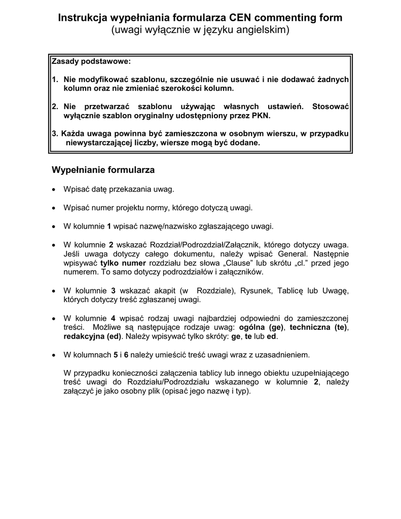 Instrukcja wypełniania formularza CEN commenting form (uwagi wyłącznie w języku angielskim) Zasady podstawowe: 1. Nie modyfikować szablonu, szczególnie nie usuwać i nie dodawać żadnych kolumn oraz nie zmieniać szerokości kolumn. 2. Nie przetwarzać szablonu używając własnych ustawień. wyłącznie szablon oryginalny udostępniony przez PKN. Stosować 3. Każda uwaga powinna być zamieszczona w osobnym wierszu, w przypadku niewystarczającej liczby, wiersze mogą być dodane. Wypełnianie formularza • Wpisać datę przekazania uwag. • Wpisać numer projektu normy, którego dotyczą uwagi. • W kolumnie 1 wpisać nazwę/nazwisko zgłaszającego uwagi. • W kolumnie 2 wskazać Rozdział/Podrozdział/Załącznik, którego dotyczy uwaga. Jeśli uwaga dotyczy całego dokumentu, należy wpisać General. Następnie wpisywać tylko numer rozdziału bez słowa „Clause” lub skrótu „cl.” przed jego numerem. To samo dotyczy podrozdziałów i załączników. • W kolumnie 3 wskazać akapit (w Rozdziale), Rysunek, Tablicę lub Uwagę, których dotyczy treść zgłaszanej uwagi. • W kolumnie 4 wpisać rodzaj uwagi najbardziej odpowiedni do zamieszczonej treści. Możliwe są następujące rodzaje uwag: ogólna (ge), techniczna (te), redakcyjna (ed). Należy wpisywać tylko skróty: ge, te lub ed. • W kolumnach 5 i 6 należy umieścić treść uwagi wraz z uzasadnieniem. W przypadku konieczności załączenia tablicy lub innego obiektu uzupełniającego treść uwagi do Rozdziału/Podrozdziału wskazanego w kolumnie 2, należy załączyć je jako osobny plik (opisać jego nazwę i typ).