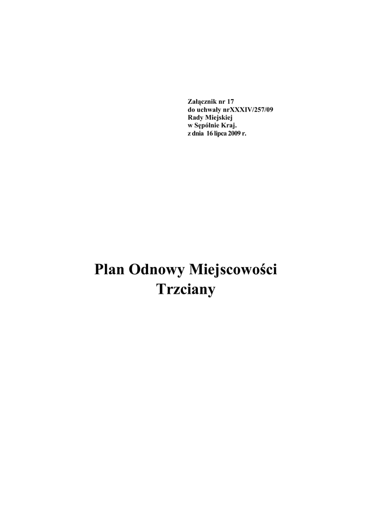 Załącznik nr 17 do uchwały nrXXXIV/257/09 Rady Miejskiej w Sępólnie Kraj. z dnia 16 lipca 2009 r. Plan Odnowy Miejscowości Trzciany Plan rozwoju miejscowości Trzciany 1. Wprowadzenie 2. Charakterystyka miejscowości oraz planowane kierunki jej rozwoju 3. Inwentaryzacja zasobów służąca ujęciu stanu rzeczywistego (analiza zasobów) 4. Ocena mocnych i słabych stron miejscowości (analiza SWOT) 5. Harmonogram planowanego przedsięwzięcia 6. Krótki opis przedsięwzięć planowanych na lata 2007-2013(arkusz planowania długoterminowego i krótkoterminowego) 7. Określenie sposobu realizacji Plan Odnowy Miejscowości Trzciany to dokument, który określa strategię działań w sferze społeczno – gospodarczej na lata 2009 – 2016. Podstawą opracowania planu jest Plan Rozwoju Lokalnego Gminy Sępólno Krajeńskie na lata 2007 – 2013 i Strategia Rozwoju Gminy Sępólno Krajeńskie na lata 2004 – 2013 przyjęta uchwałą Rady Miejskiej Sępólna Krajeńskiego XXXIII/341/2001 z dnia 20 czerwca 2001 r. Niniejszy plan jest planem otwartym stwarzającym możliwość aktualizacji w zależności od potrzeb społecznych i uwarunkowań finansowych. Oznacza to, że mogą być dopisywane nowe zadania, a także to, że może zmienić się kolejność ich realizacji w zależności od uruchomienia i dostępu do funduszy Unii Europejskiej. 2. Wprowadzenie. Uwarunkowania Planu Odnowy Miejscowości polegają na tym, że ma on zdecentralizowany, lokalny charakter, obejmuje ograniczony teren jednej miejscowości i przygotowywany jest (przy udziale przedstawicieli gminy) z inicjatywy i przez mieszkańców miejscowości. Specyfika planu polega na tym, że jest on ukierunkowany na zagadnienia cywilizacyjno-kulturowe, koncentruje się na prostych, lokalnych przedsięwzięciach, które prowadzić mają do poprawy standardu i jakości życia mieszkańców. Ma mniej pro-gospodarczy, a bardziej pro-społeczny i pro-kulturowy charakter. I dzięki temu może stanowić doskonałe uzupełnienie strategii rozwoju całej gminy, która zazwyczaj koncentruje się na zagadnieniach infrastrukturalnych i gospodarczych. Celem planu jest podtrzymanie lub odtworzenie atrakcyjności wsi jako miejsca zamieszkania i zaplanowanie oraz przeprowadzenie tego w sposób dostępny, oczekiwany i popierany oraz wykonalny dla lokalnej społeczności. Jest to szczególnie ważne w dzisiejszej sytuacji, gdy miasta oferują konkurencyjną alternatywę zamieszkania, a rolnictwo traci swą atrakcyjność jako źródło utrzymania, co prowadzi m.in. do migracji młodych ludzi, szczególnie tych lepiej wykształconych ze wsi do miasta. Idea odnowy wsi wyrasta z przekonania, że odnowiona, doinwestowana i ożywiona kulturowo wieś odzyska swoją atrakcyjność jako miejsce zamieszkania, zapewni swoim mieszkańcom godziwy standard i jakość życia oraz zdoła zatrzymać młodzież na miejscu. Nie jako „minimiasto”, wysoko zurbanizowana i konkurująca z ośrodkami miejskimi bogactwem oferty, ale właśnie jako „nowa wieś”, nowoczesna, lecz ceniąca i zachowująca swój wiejski charakter i kulturową specyfikę. Plan Odnowy ma więc charakter „planu małych kroków”, ale w kierunku wielkich celów. Małych kroków, które podejmowane przez mieszkańców przy finansowym i organizacyjnym wsparciu gminy doprowadzić mają do trwałej poprawy miejscowych warunków życia. 2. Charakterystyka miejscowości oraz planowane kierunki jej Rozwoju. Miejscowość Trzciany położona jest w północnej części Gminy Sępólno Krajeńskie w ciągu drogi wojewódzkiej nr 241Sępólno-Tucłiola i na skrzyżowaniu drogi gminnej Wałdowo – Trzciany - Mała Cerkwica – Kamień Krajeński. W naszej miejscowości znajduje się właśnie skrzyżowanie tych dróg (gminnej z wojewódzką). Z południowej strony otaczającą lasy leśnictwa Komierowo oraz jeziora: Kuchenne, apinek, Głęboczek. Z północnej graniczy z sąsiednią Gminą Kamień Krajeński. W naszej miejscowości znajduje się dworek byłych właścicieli majątku p. Bothe, który obecnie jest w posiadaniu ich córki pani Kłosowskiej, która obecnie w nim zamieszkuje. Przy szosie wojewódzkiej znajduje się też cmentarz rodzinny rodziny Bothe. Miejscowość Trzciany jest wsią rolniczą zamieszkałą przez częściowo rodziny wielopokoleniowe a częściowo osadnicze z południa Polski. Zamieszkuje ją 290 osób. Indywidualnie gospodarstwa rolne o średniej wielkości nastawione na produkcję mieszaną. LICZBA MIESZKAŃCÓW – 216 osób (stan na 31 grudnia 2007 r.) SOŁTYS: Tadeusz Gapa (II kadencja) RADA SOŁECKA: FIAŁKOWSKI Władysław - członek GOSTOMSKI Kazimierz – członek KNAPIK Bogusława – członek SKÓRCZEWSKA Ewa – członek Sołectwo Trzciany posiada częściowe uzbrojenie terenu w postaci instalacji wodociągowej (tylko wieś) energetycznej i telefonicznej. Przy drodze wojewódzkiej biegnie też instalacja kanalizacyjna z Zakładu mleczarskiego „Lacpol” z Zalesia. Całe sołectwo jest w granicach Krajeńskiego Parku Krajobrazowego. Planowane kierunki rozwoju to: 1. zwodociągowanie Sołectwa (wybudowania) 2. kanalizacja 3. remont i doposażenie świetlicy w sprzęt oraz meble (kontynuacja) 4. wyposażenie placu zabaw i ogrodzenie ( kontynuacja) 5. chodnik przez wieś i polbruk przed świetlicą 3. Inwentaryzacja zasobów służąca ujęciu stanu rzeczywistego. - budynki mieszkalne jednorodzinne - 55 sieć energetyczna sieć telefoniczna świetlica sklep spożywczy dworek zabytkowy 2 studnie głębinowe droga wojewódzka drogi gminne – 7,1 km budynki wielorodzinne - 4 indywidualne gospodarstwa rolne – 26 (prowadzące produkcję) 4. Ocena mocnych i słabych stron miejscowości (analiza SWOT) 4.1. Mocne strony miejscowości Miejscowość Trzciany położona jest przy drodze wojewódzkiej nr 241 Sępólno - Tuchola oraz drodze gminnej Wałdowo w kierunku Mała Cerkwica - Kamień Krajeński w „Krajeńskim Parku Krajobrazowym". Otaczający ją z południ