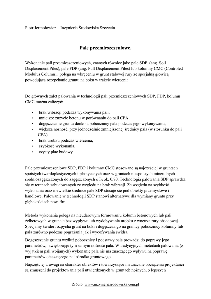 Piotr Jermołowicz – Inżynieria Środowiska Szczecin Pale przemieszczeniowe. Wykonanie pali przemieszczeniowych, znanych również jako pale SDP (ang. Soil Displacement Piles), pale FDP (ang. Full Displacement Piles) lub kolumny CMC (Controled Modulus Column), polega na wkręceniu w grunt stalowej rury ze specjalną głowicą powodującą rozepchanie gruntu na boku w trakcie wiercenia. Do głównych zalet palowania w technologii pali przemieszczeniowych SDP, FDP, kolumn CMC można zaliczyć: • • • • • • • brak wibracji podczas wykonywania pali, mniejsze zużycie betonu w porównaniu do pali CFA, dogęszczanie gruntu dookoła pobocznicy pala podczas jego wykonywania, większa nośność, przy jednocześnie zmniejszonej średnicy pala (w stosunku do pali CFA) brak urobku podczas wiercenia, szybkość wykonania, czysty plac budowy. Pale przemieszczeniowe SDP, FDP i kolumny CMC stosowane są najczęściej w gruntach spoistych twardoplastycznych i plastycznych oraz w gruntach niespoistych mineralnych średniozagęszczonych do zagęszczonych o ID ok. 0,70. Technologia palowania SDP sprawdza się w terenach zabudowanych ze względu na brak wibracji. Ze względu na szybkość wykonania oraz niewielkie średnice pale SDP stosuje się pod obiekty przemysłowe i handlowe. Palowanie w technologii SDP stanowi alternatywę dla wymiany gruntu przy głębokościach pow. 5m. Metoda wykonania polega na nieudarowym formowaniu kolumn betonowych lub pali żelbetowych w gruncie bez wypływu lub wydobywania urobku z wnętrza rury obsadowej. Specjalny świder rozpycha grunt na boki i dogęszcza go na granicy pobocznicy kolumny lub pala zarówno podczas pogrążania jak i wycofywania świdra. Dogęszczenie gruntu wzdłuż pobocznicy i podstawy pala prowadzi do poprawy jego parametrów, zwiększając tym samym nośność pala. W tradycyjnych metodach palowania (z wyjątkiem pali wbijanych) wykonanie pala nie ma znaczącego wpływu na poprawę parametrów otaczającego pal ośrodka gruntowego. Najczęściej z uwagi na charakter obiektów i towarzyszące im znaczne obciążenia projektanci są zmuszeni do projektowania pali utwierdzonych w gruntach nośnych, o lepszych Źródło: www.inzynieriasrodowiska.com.pl parametrach, pomijając w zasadzie nośność warstw słabych, leżących powyżej. Niejednokrotnie występują duże miąższości warstw słabych, co pociąga za sobą konieczność zastosowania większych długości projektowanych pali. Stosując pale przemieszczeniowe, dzięki dogęszczeniu gruntu w procesie wiercenia można lepiej wykorzystać warstwy słabe, prowadząc do optymalizacji ekonomicznej posadowienia obiektu. W związku z powyższym metoda ta charakteryzuje się wysoką efektywnością w gruntach słabonośnych, tj. np. gliny, iły i pyły w stanie plastycznym lub miękkoplastycznym jak również piaski drobne i pylaste w stanie luźnym oraz w gruntach pochodzenia antropogenicznego (nasypy niekontrolowane, zwałowiska). Metoda pali przemieszczeniowych znajduje zastosowanie w zakresie wzmacniania gruntów, zarówno pod fundamenty obiektów kubaturowych jak również w budownictwie drogowym i mostowym. Źródło: www.inzynieriasrodowiska.com.pl