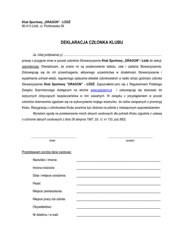 Klub Sportowy „DRAGON” - ŁÓDŹ 90-413 Łódź, ul. Piotrkowska 59 DEKLARACJA CZŁONKA KLUBU Ja, niżej podpisana(-y) ....................................................................................................................... proszę o przyjęcie mnie w poczet członków Stowarzyszenia Klub Sportowy „DRAGON”- Łódź do sekcji: szermierczej. Oświadczam, że znane mi są postanowienia statutu, cele i zadania Stowarzyszenia. Zobowiązuję się do ich przestrzegania, aktywnego uczestnictwa w działalności Stowarzyszenia i wypełniania uchwał władz, regularnego opłacania składek członkowskich a nadto strzec godności członka Stowarzyszenia Klub Sportowy ”DRAGON” - ŁÓDŹ. Zapoznałem(-am) się z Regulaminem Polskiego Związku Szermierczego dostępnym na stronie www.pzszerm.pl i zobowiązuję się stosować do wytycznych dotyczących bezpieczeństwa w nim zawartych. W związku z przystąpieniem w poczet członków dobrowolnie zgadzam się na wykorzystanie mojego wizerunku do celów związanych z promocją Klubu. Rezygnacja z członkostwa Klubu powinna być złożona na piśmie z miesięcznym wypowiedzeniem. Wyrażam zgodę na przetwarzanie moich danych osobowych dla potrzeb Klubu (zgodnie z ustawą o ochronie danych osobowych z dnia 29 sierpnia 1997, Dz. U. nr 133, poz.883). ....................................................... /data/ ....................................................... /podpis/ Przedstawiam poniżej dane osobowe: Nazwisko i imiona: ___________________________________________________ Imiona rodziców: ___________________________________________________ Data i miejsce urodzenia: ___________________________________________________ Pesel: ___________________________________________________ Miejsce zamieszkania: ___________________________________________________ Miejsce pracy lub szkoła: ___________________________________________________ Obywatelstwo: ___________________________________________________ Nr telefonu / e-mail: ___________________________________________________ Decyzja: Zarządu Klubu Sportowego „DRAGON” – Łódź postanowił przyjąć / nie przyjmować *) ___________________________________________________ w poczet członków Klubu z dniem ___________________________________________________ …...................................................... /podpis Prezesa lub osoby upoważnionej/ ZEZWOLENIE RODZICÓW / OPIEKUNÓW Ja, niżej podpisana(-y) …………….................................................................................................... zezwalam mojemu dziecku na przynależność do sekcji: szermierczej Klubu Sportowego „DRAGON” – ŁÓDŹ. Numer telefonu rodziców / opiekunów …………………………….………………….......................... ....................................................... /data/ *) niepotrzebne skreślić ....................................................... /podpisy rodzica lub prawnego opiekuna/