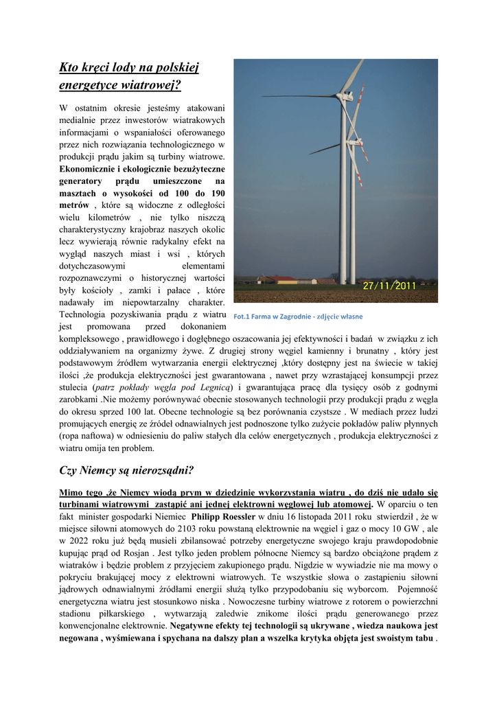 Kto kręci lody na polskiej energetyce wiatrowej? W ostatnim okresie jesteśmy atakowani medialnie przez inwestorów wiatrakowych informacjami o wspaniałości oferowanego przez nich rozwiązania technologicznego w produkcji prądu jakim są turbiny wiatrowe. Ekonomicznie i ekologicznie bezuŜyteczne generatory prądu umieszczone na masztach o wysokości od 100 do 190 metrów , które są widoczne z odległości wielu kilometrów , nie tylko niszczą charakterystyczny krajobraz naszych okolic lecz wywierają równie radykalny efekt na wygląd naszych miast i wsi , których dotychczasowymi elementami rozpoznawczymi o historycznej wartości były kościoły , zamki i pałace , które nadawały im niepowtarzalny charakter. Technologia pozyskiwania prądu z wiatru Fot.1 Farma w Zagrodnie - zdjęcie własne jest promowana przed dokonaniem kompleksowego , prawidłowego i dogłębnego oszacowania jej efektywności i badań w związku z ich oddziaływaniem na organizmy Ŝywe. Z drugiej strony węgiel kamienny i brunatny , który jest podstawowym źródłem wytwarzania energii elektrycznej ,który dostępny jest na świecie w takiej ilości ,Ŝe produkcja elektryczności jest gwarantowana , nawet przy wzrastającej konsumpcji przez stulecia (patrz pokłady węgla pod Legnicą) i gwarantująca pracę dla tysięcy osób z godnymi zarobkami .Nie moŜemy porównywać obecnie stosowanych technologii przy produkcji prądu z węgla do okresu sprzed 100 lat. Obecne technologie są bez porównania czystsze . W mediach przez ludzi promujących energię ze źródeł odnawialnych jest podnoszone tylko zuŜycie pokładów paliw płynnych (ropa naftowa) w odniesieniu do paliw stałych dla celów energetycznych , produkcja elektryczności z wiatru omija ten problem. Czy Niemcy są nierozsądni? Mimo tego ,Ŝe Niemcy wiodą prym w dziedzinie wykorzystania wiatru , do dziś nie udało się turbinami wiatrowymi zastąpić ani jednej elektrowni węglowej lub atomowej. W oparciu o ten fakt minister gospodarki Niemiec Philipp Roessler w dniu 16 listopada 2011 roku stwierdził , Ŝe w miejsce siłowni atomowych do 2103 roku powstaną elektrownie na węgiel i gaz o mocy 10 GW , ale w 2022 roku juŜ będą musieli zbilansować potrzeby energetyczne swojego kraju prawdopodobnie kupując prąd od Rosjan . Jest tylko jeden problem północne Niemcy są bardzo obciąŜone prądem z wiatraków i będzie problem z przyjęciem zakupionego prądu. Nigdzie w wywiadzie nie ma mowy o pokryciu brakującej mocy z elektrowni wiatrowych. Te wszystkie słowa o zastąpieniu siłowni jądrowych odnawialnymi źródłami energii słuŜą tylko przypodobaniu się wyborcom. Pojemność energetyczna wiatru jest stosunkowo niska . Nowoczesne turbiny wiatrowe z rotorem o powierzchni stadionu piłkarskiego , wytwarzają zaledwie znikome ilości prądu generowanego przez konwencjonalne elektrownie. Negatywne efekty tej technologii są ukrywane , wiedza naukowa jest negowana , wyśmiewana i spychana na dalszy plan a wszelka krytyka objęta jest swoistym tabu . Tylko niewielu ludzi ma ochotę ochot iść pod prąd i przeciwstawić się tym politycznym trendom. Spadająca wartość nieruchomo nieruchomości odzwierciedla zauwaŜalne alne pogorszenie standardów Ŝycia . Coraz więcej cej osób opisuje swoje Ŝycie jako koszmar , kiedy są wystawieni na akustyczne i optyczne działania farm wiatrowych. Od 1 stycznia 2012 roku Dania wprowadza przepis , który mówi ,Ŝe ,Ŝ dźwięki niskiej częstotliwości ci na progu domu nie mog mogą być wyŜsze niŜ 20 dB (informacja informacja z Centrum Testów w Osterild w Dani ) . U nas nie ma takich uregulowań. Gdzie płyną nasze pieniądze? pieni Fot.2 Opuszczona farma na Hawajach - ze strony sptopwiatrakom.eu Dla la inwestorów zagranicznych jakimi są s na naszym rynku Portugalczycy, Hiszpanie , Niemcy i inne nacje to jest najlepszy interes w Europie. Europie Robią u nas wspaniałe interesy na produkcji prądu pr du z wiatru a jak te interesy nie będą b juŜ takie wspaniałe ze względu du na konkurencj konkurencję to Polskie Stowarzyszenie Energetyki Wiatrowej przy pomocy skutecznego lobbingu zmieni tak przepisy prawa , Ŝe będą one dalej wspaniałe. Jest teŜ te poraŜająca informacja ,Ŝee 1/3 przychodów firm produkuj produkujących prądd z wiatru jest zza ten prąd , a 2/3 za sprzedaŜ tzw. zielonych certyfikatów – czyli niczego , czegoś stworzonego przez decyzje polityczne i całkowicie oderwane od realiów ekonomicznych (informacja informacja z dziennika „UwaŜam „Uwa Rze” nr 42/2011) . Do tego dochodząą czasowe preferencje w zakresie opłat przyłączeniowych czeniowych , zwolnienie z podatku akcyzowego, moŜliwość liwość uzyskania dotacji ze środków rodków wspólnotowych oraz krajowych. To jest patologia . To jest prosto wyjęte wyj z filmu Stanisława Bareji „Miś”” o najlepszych interesach z inwestycji słomianych. Nam serwuje się si podwyŜki ki podatków i opłat za energi energię a inwestorom zagranicznym stwarza się warunki do robienia świetnych wietnych interesów , które my finansujemy – uwaŜam ,Ŝe to jest chore. Rynek certyfikatów , czyli świadectw wiadectw pochodzenia jest protezą protez rynku realnego i przyczynia się do psucia wolnej konkurencji. Niedawno okazało sięę ,Ŝe produkcja biopaliw jest „be” nie ekologiczna i ten przemysł umiera . A co będzie jak okaŜe sięę ,Ŝ ,Ŝe produkcja prądu z wiatru to jeszcze większe „be” – zostaniemy z tymi pomnikami nikami głupoty (wysokość do 190m) między domami , bo nikt tego nie rozbierze . Ludzie zajmujący się wytwarzaniem energii wiatrowej w wywiadach z dziennikarzami mówią oficjalnie o świetnych wietnych interesach z produkcji „zielonych certyfikatów. Czują się bezkarni bezkar w wyciąganiu od nas pieniędzy dzy i robiących z nas białych niewolników . Czy któryś z Wójtów zastanawiał si się co będzie jak zakończy czy się eksploatacja (Fot.2) turbin 