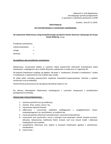 Załącznik nr 4 do Regulaminu określającego sposób postępowania w sprawach o udzielenie zamówień w GHW Kraków , dnia 07.11.2016. SPECYFIKACJA DO POSTĘPOWANIA O UDZIELENIE ZAMÓWIENIA Na wyłonienie Wykonawcy usług kompleksowego sprzątania Hotelu Reymont należącego do Grupy Hoteli WAM Sp. z o.o. Przedmiot zamówienia: robota budowlana □ usługa □ dostawa □ Szczegółowy opis przedmiotu zamówienia: Wykonawca, utrzymywać będzie w czystości całość powierzchni jednostek mieszkalnych pokoi hotelowych, znajdujących się w Hotelu Reymont, położonym w Łodzi przy ul. Legionów 81. W budynku hotelowym znajduje się ogółem: 28 pokoi 1- osobowych, 29 pokoi 2-osobowych, 7 pokoi 3-osobowych, 2 apartamenty oraz 6 pokoi typu studio. W skład pokoi wchodzą powierzchnie użytkowe mieszkalno-wypoczynkowe, łazienka z węzłem sanitarnym oraz przedpokój. Powierzchnia przeznaczona do sprzątania dla jednej osoby to m2. Do zakresu obowiązków Wykonawcy wynikających z czynności związanych z przedmiotem postępowania wchodzą: SPRZĄTANIE POKOI/PRZEDPOKOI : 1. 2. 3. 4. 5. 6. 7. 8. wymiana pościeli oraz jej ewidencja, wymian firan, zasłon, narzut itp., czyszczenie tapicerki krzeseł, odkurzanie i czyszczenie wykładzin podłogowych z uwzględnieniem miejsc trudnodostępnych np. pod łózkami, za szafkami itp., mycie parapetów okiennych wewnętrznych, czyszczenie kaloryferów, czyszczenie oraz wycieranie z kurzy z zewnątrz oraz wewnątrz: biurek, lampek nocnych, obrazów, telewizorów, telefonów foteli, krzeseł, szaf oraz innych mebli i dekoracji znajdujących się w pokoju, uzupełnienie informacji oraz reklam w teczkach hotelowych zgodnie z określonymi standardami, mycie luster , 9. 10. 11. 12. 13. opróżniania koszy na śmieci, mycie futryn, drzwi i klamek od wewnątrz oraz z zewnątrz, zgłaszanie oraz odnoszenie rzeczy pozostawionych przez gości hotelowych, informowanie o brakach i usterkach w pokojach, inne czynności w ramach sprzątania pokoi zlecone przez Zamawiającego, SPRZĄTANIE ŁAZIENEK : 1. mycie i sprzątanie sanitariatów (mycie glazury wokół umywalek, czyszczenie luster, półek łazienkowych, armatury umywalkowej/natryskowej, dezynfekcja muszli klozetowych, mycie pojemników na papier toaletowy itp.) 2. uzupełnianie papieru toaletowego, galanterii hotelowej, ręczników w łazience, 3. opróżnianie i czyszczenie koszy na śmieci, 4. wynoszenie śmieci do pojemników na odpady usytuowanych na zewnątrz budynków, 5. mycie futryn, drzwi i klamek od wewnątrz oraz z zewnątrz, 6. mycie podłóg, Powyższe czynności, będą wykonywane przez Wykonawcę za pomocą jego własnego personelu. Lista personelu, zostanie złożona w siedzibie Zamawiającego w dniu podpisania umowy i będzie aktualizowana każdorazowo w przypadku zmiany składu personelu wykonującego w/w usługi. Zamawiający, zastrzega sobie prawo zażądania w każdym czasie zmiany pracowników sprzątających Wykonawcy w przypadku niewłaściwego wykonywania przez nich obowiązków. Wykonawca, zobowiązany jest w terminie 3 dni roboczych zastąpić wskazanych pracowników, a w przypadku rażącego naruszenia przez nich dyscypliny pracy od następnego dnia roboczego po takim zdarzeniu. Zamawiający, wyposaży pracowników Wykonawcy w niezbędne do wykonywania przedmiotu postępowania środki czystości, artykuły higieniczno–sanitarne oraz sprzęt potrzebny do należytego wykonania przedmiotu postepowania. Wykonawca usługi, ponosi pełną odpowiedzialność za wyposażenie personelu w odzież roboczą oraz obuwie robocze, niezbędne do wykonywania usług objętych przedmiotem postępowania oraz za ich bezpieczeństwo w trakcie ich wykonywania. Wykonawca musi przedstawić Zamawiającemu do zaopiniowania strój, w którym pracownicy Wykonawcy będą wykonywać zlecone usługi na rzecz Zamawiającego. Strój powinien być zawsze czysty i schludny. Wykonawca zobowiązuje się, że wszystkie osoby przy pomocy, których wykonywany będzie przedmiot postępowania będą zatrudnione zgodnie z obowiązującym prawem oraz, że posiadają aktualne szkolenia z zakresu BHP, badania lekarskie, aktualne książeczki Sanepid oraz wszelkie uprawnienia do wykonywania pracy na danym stanowisku /miedzy innymi do pracy na wysokości / Wykonawca zobowiązuje się do wykonywania prac, będących przedmiotem niniejszego postępowania z należytą starannością i dokładnością. Oceny prawidłowości wykonania prac, objętych niniejszym postępowaniem dokonuje Zamawiający. Wykonawca zobowiązuje się do dokonywania wszelkich poprawek na żądanie Zamawiającego, o ile konieczność ich dokonania wyniknie z niewłaściwego wykonania przedmiotu postępowania. W przypadku nieterminowego lub niewłaściwego wykonania usług będących przedmiotem niniejszego postępowania, Zamawiający może wyznaczyć Wykonawcy dodatkowy, nieodpłatny termin wykonania usług. Wykonawca i jego pracownicy są zobowiązani do ścisłego współdziałania z pracownikami Zamawiającego. Wykonawca i jego pracownicy, zobowiązani są do zgłaszania Zamawiającemu wszelkich zauważonych usterek w trakcie realizacji zamówienia będącego przedmiotem niniejszego postępowania. Wykonawca, wykonywać będzie usługi na podstawie zamówień składanych przez Zamawiającego za pomocą, telefonu, lub poczty elektronicznej na adres mailowy: [email protected] i do wiadomości: [email protected] Zamawiający będzie składał zlecenia na usługi z wyprzedzeniem 24 godzin, określając datę wykonania zlecenia oraz ilość osób potrzebnych do wykonania usługi. Po otrzymaniu zlecenia, Wykonawca zobowiązany jest potwierdzić odebranie zlecenie, potwierdzić datę zlecenia oraz w ustalonym terminie wykonać zleconą usługę przy udziale swoich pracowników. Usługi zlecane Wykonawcy będą wykonywane w godzinach 8: 00 – 16: 00 w dniach od poniedziałku do niedzieli, również w dni świąteczne na terenie Hotelu Reymont zgodnie z zakresem 