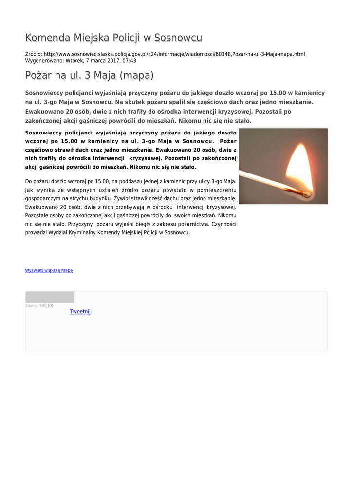 Komenda Miejska Policji w Sosnowcu Źródło: http://www.sosnowiec.slaska.policja.gov.pl/k24/informacje/wiadomosci/60348,Pozar-na-ul-3-Maja-mapa.html Wygenerowano: Wtorek, 7 marca 2017, 07:43 Pożar na ul. 3 Maja (mapa) Sosnowieccy policjanci wyjaśniają przyczyny pożaru do jakiego doszło wczoraj po 15.00 w kamienicy na ul. 3-go Maja w Sosnowcu. Na skutek pożaru spalił się częściowo dach oraz jedno mieszkanie. Ewakuowano 20 osób, dwie z nich trafiły do ośrodka interwencji kryzysowej. Pozostali po zakończonej akcji gaśniczej powrócili do mieszkań. Nikomu nic się nie stało. Sosnowieccy policjanci wyjaśniają przyczyny pożaru do jakiego doszło wczoraj po 15.00 w kamienicy na ul. 3-go Maja w Sosnowcu. Pożar częśćiowo strawił dach oraz jedno mieszkanie. Ewakuowano 20 osób, dwie z nich trafiły do ośrodka interwencji kryzysowej. Pozostali po zakończonej akcji gaśniczej powrócili do mieszkań. Nikomu nic się nie stało. Do pożaru doszło wczoraj po 15.00, na poddaszu jednej z kamienic przy ulicy 3-go Maja. Jak wynika ze wstępnych ustaleń źródło pożaru powstało w pomieszczeniu gospodarczym na strychu budynku. Żywioł strawił część dachu oraz jedno mieszkanie. Ewakuowano 20 osób, dwie z nich przebywają w ośrodku interwencji kryzysowej. Pozostałe osoby po zakończonej akcji gaśniczej powróciły do swoich mieszkań. Nikomu nic się nie stało. Przyczyny pożaru wyjaśni biegły z zakresu pożarnictwa. Czynności prowadzi Wydział Kryminalny Komendy Miejskiej Policji w Sosnowcu. Wyświetl większą mapę Ocena: 0/5 (0) Tweetnij
