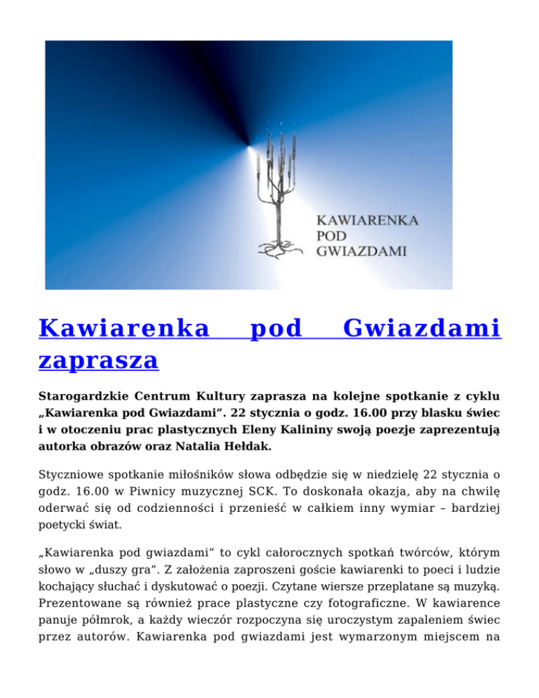 Kawiarenka zaprasza pod Gwiazdami Starogardzkie Centrum Kultury zaprasza na kolejne spotkanie z cyklu „Kawiarenka pod Gwiazdami”. 22 stycznia o godz. 16.00 przy blasku świec i w otoczeniu prac plastycznych Eleny Kalininy swoją poezje zaprezentują autorka obrazów oraz Natalia Hełdak. Styczniowe spotkanie miłośników słowa odbędzie się w niedzielę 22 stycznia o godz. 16.00 w Piwnicy muzycznej SCK. To doskonała okazja, aby na chwilę oderwać się od codzienności i przenieść w całkiem inny wymiar – bardziej poetycki świat. „Kawiarenka pod gwiazdami” to cykl całorocznych spotkań twórców, którym słowo w „duszy gra”. Z założenia zaproszeni goście kawiarenki to poeci i ludzie kochający słuchać i dyskutować o poezji. Czytane wiersze przeplatane są muzyką. Prezentowane są również prace plastyczne czy fotograficzne. W kawiarence panuje półmrok, a każdy wieczór rozpoczyna się uroczystym zapaleniem świec przez autorów. Kawiarenka pod gwiazdami jest wymarzonym miejscem na pierwszą publiczną prezentację swojej twórczości. Pierwsi goście zasiedli w „kawiarence”, w dniu 29 października 2006 roku.